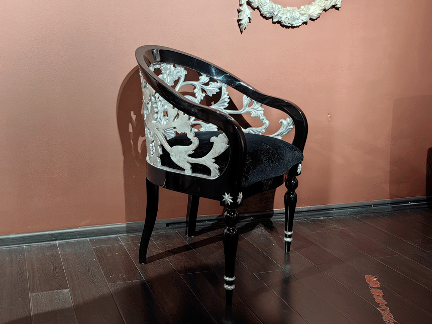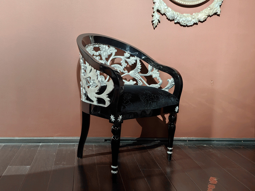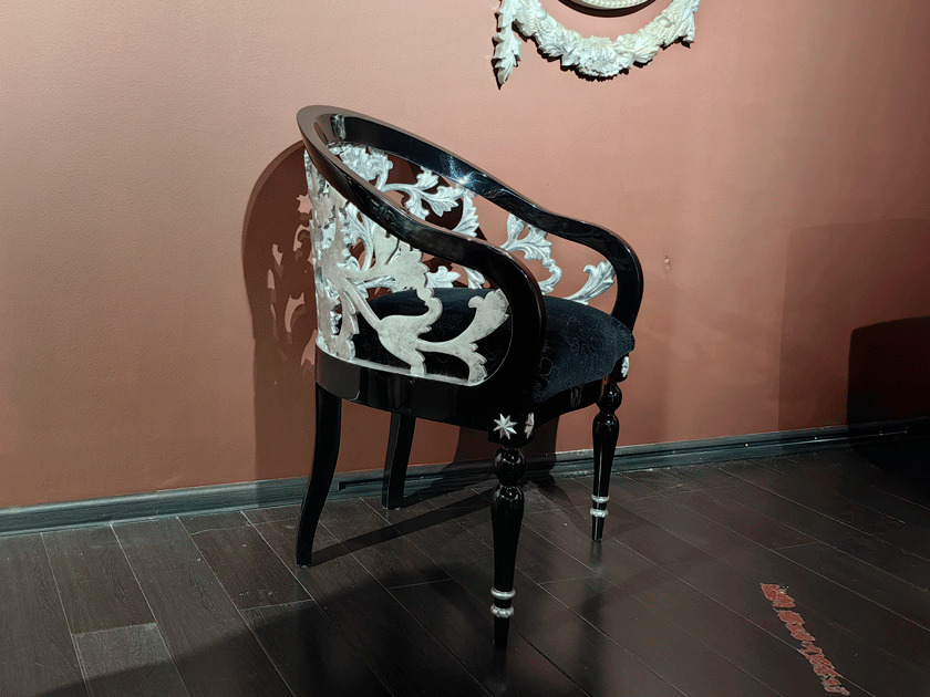 Предлагаем купить декоративное дизайнерское кресло с резной спинкой очень удачно подойдет для формирования кофейной группы в холл, эркерные помещения, гостиную. Мебель премиум класса от столярной мастерской на заказ. Реплика итальянской мебели. Глубина и ширина сидения - 54см, высота сидения - 52см. Материалы - массив бука, сусальный серебряный лист, черный глянцевый лак. На заказ возможен любой цвет дерева и любая ткань на сидении.