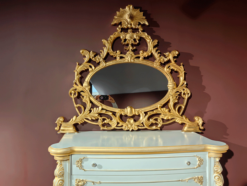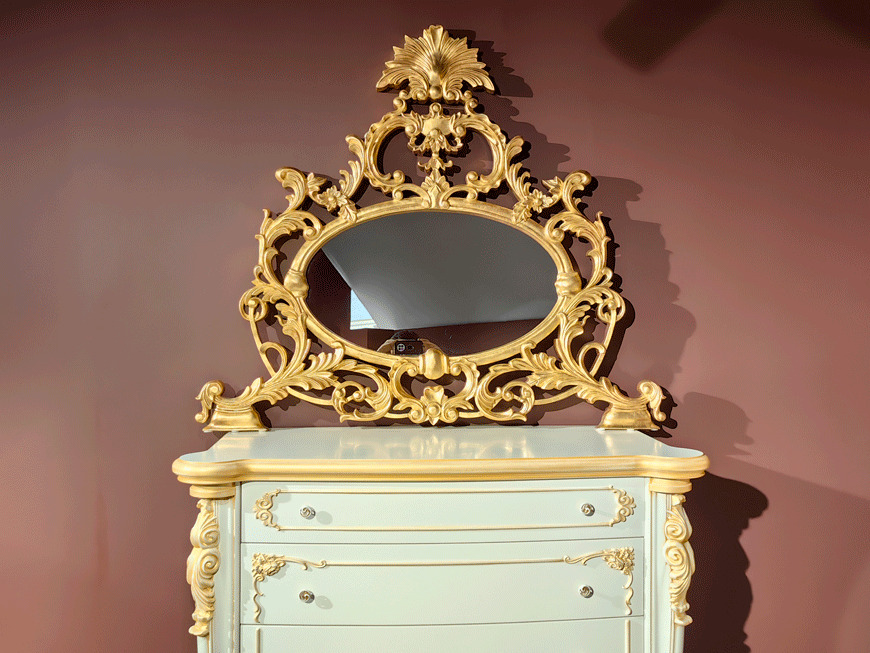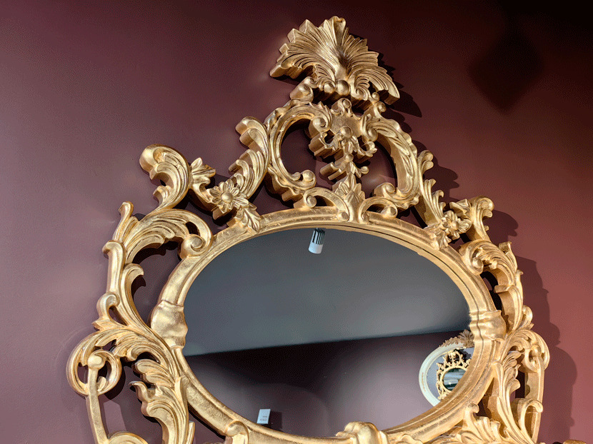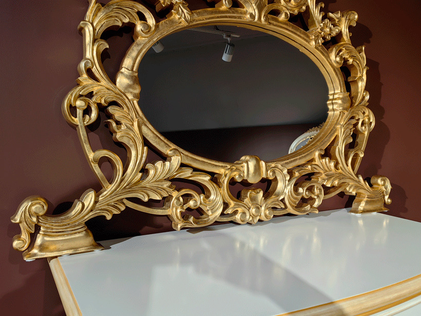 Предлагаем купить роскошное, резное, овальное зеркало Людовик, в виде пирамиды в серебряной и золотой потали в наличии по распродаже в салоне. Реплика Италии. Данное зеркало ставится в основном на крупные предметы - на прилавки для гостиной и большие закрытые консоли. Материалы - массив бука, сусальный золотой, или серебряный лист, лак. Мебельный салон распродает остатки красивой, дорогой классической мебели.