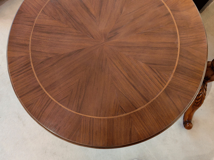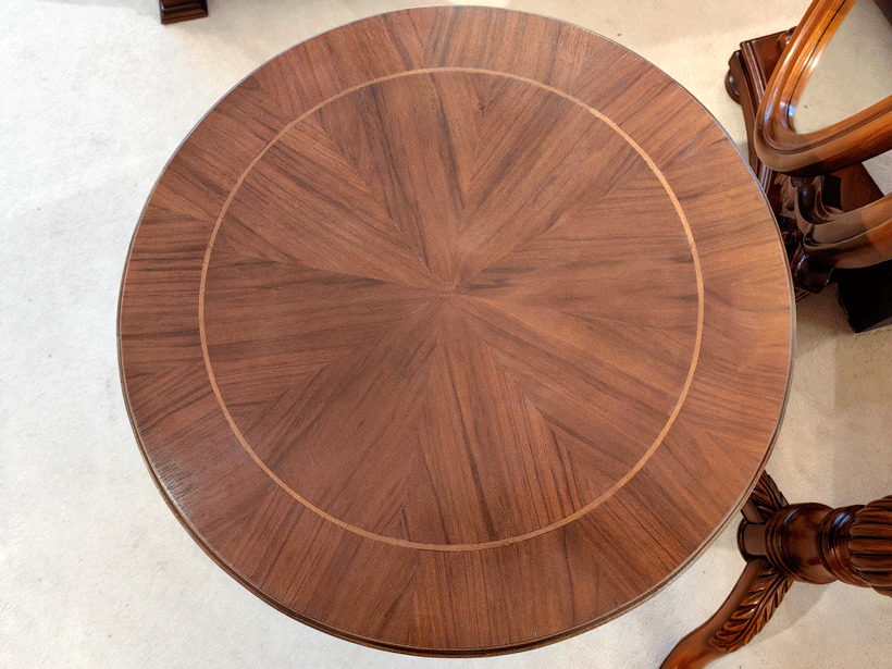 Предлагаем купить не большой, круглый, высокий классический чайный, кофейный столик на одной ножке, из массива дерева, по распродаже в нашем салоне. Кофейный столик с не большой столешницей, на высокой ножке с отделкой бронзовой патиной по резьбе. Продажа красивых кофейных и чайных классических столиков из массива дерева.