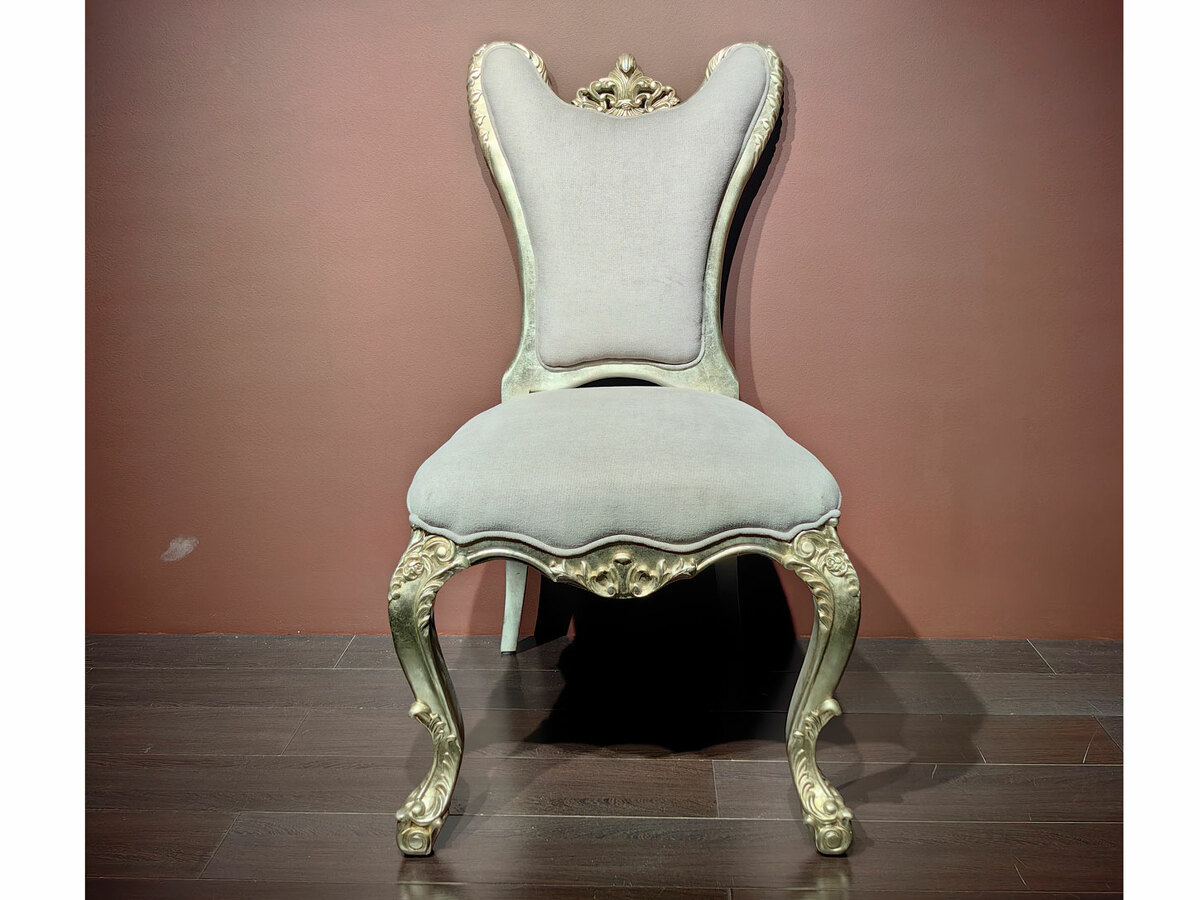 Обеденный стул с оригинальной, динамической формой спинки и красивыми, резными ножками в наличии на складе. Материалы - массив бука, сусальный серебряный лист, лак, элементы старения.