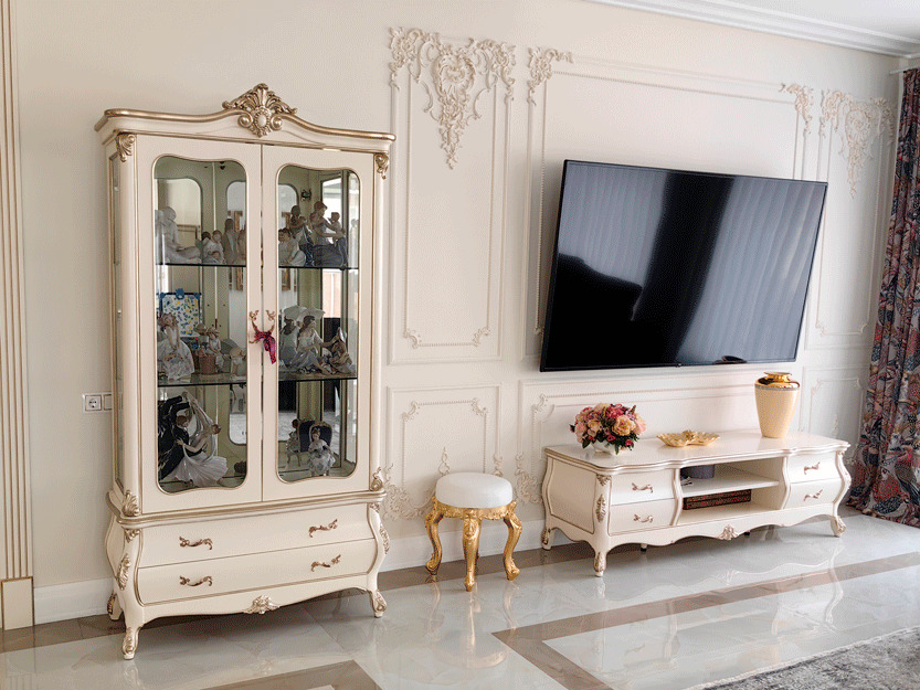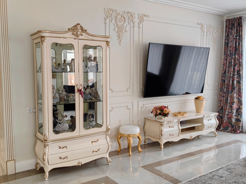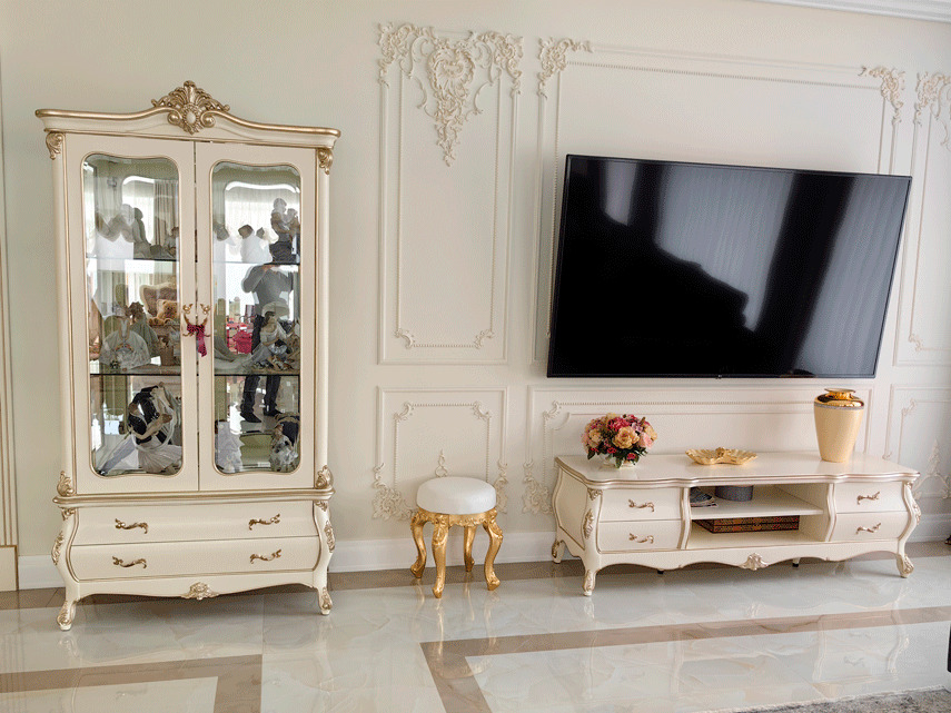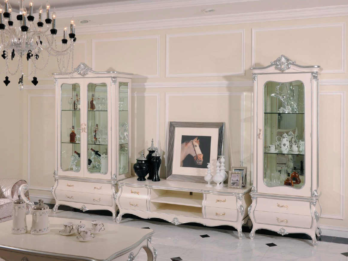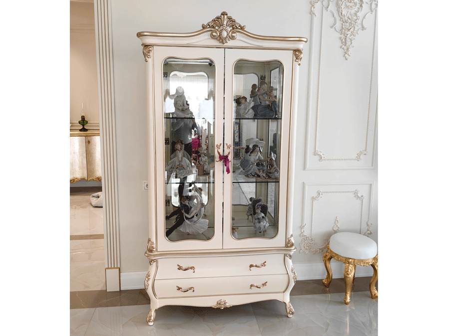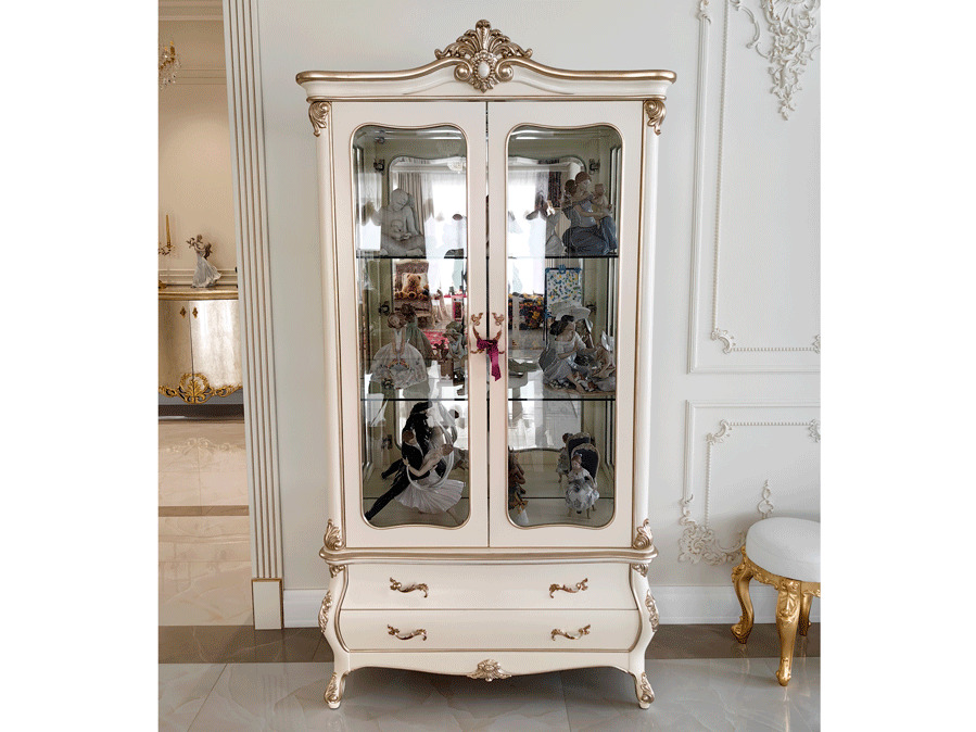 Предлагаем купить красивую, белую, классическую витрину 2х дверная, из дерева с отделкой серебром в пышных округлых формах в наличии и на складе. Мебель безупречного уровня качества. Продажа дорогой классической мебели премиум класса из дерева для гостиной. Материалы: Каркас витрины, рамы дверей, царги, декоративные резные элементы выполнены из массива бука. Большие плоские поверхности (столешницы, боковины шкафов, полки) выполнены из МДФ. Петли дверей и направляющие для ящиков выполнены с доводчиками. Дно ящиков оббито бархатом. Цвета: Цвет – слоновая кость (белый с небольшим нейтральным оттенком). Степень глянца эмали – 20-30%. На заказ возможна отделка золотым цветом вместо серебряного (жидкая поталь), а также выполнение эффектов состаривания (патины различных цветов) .