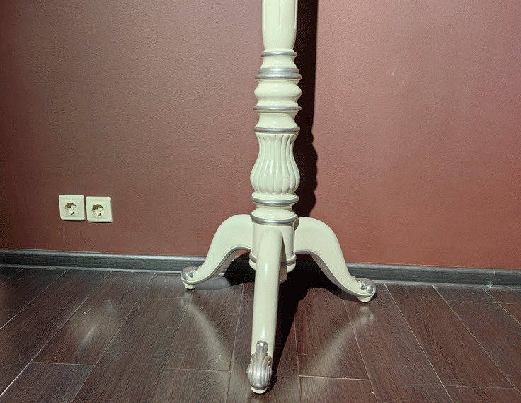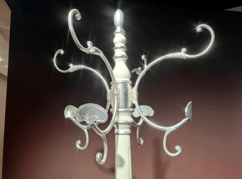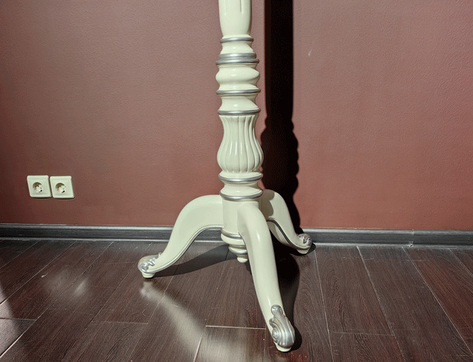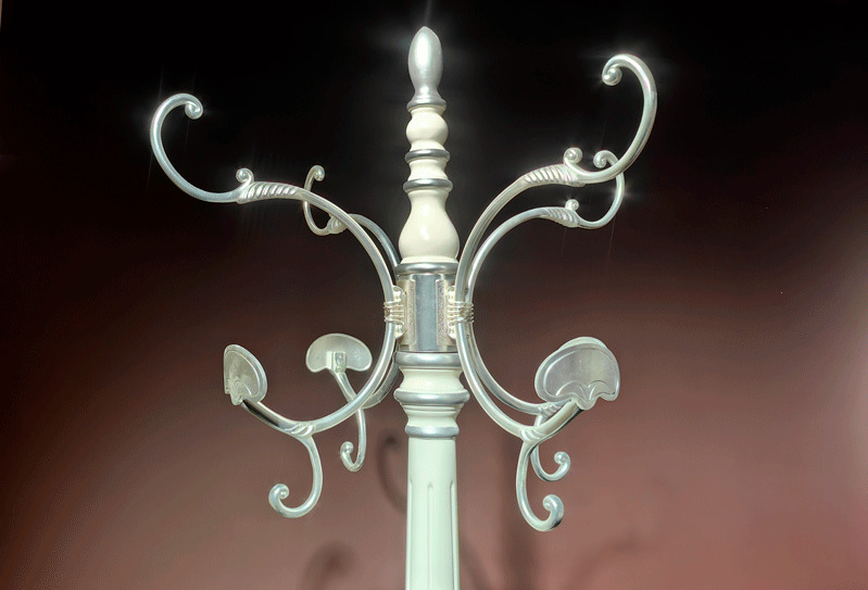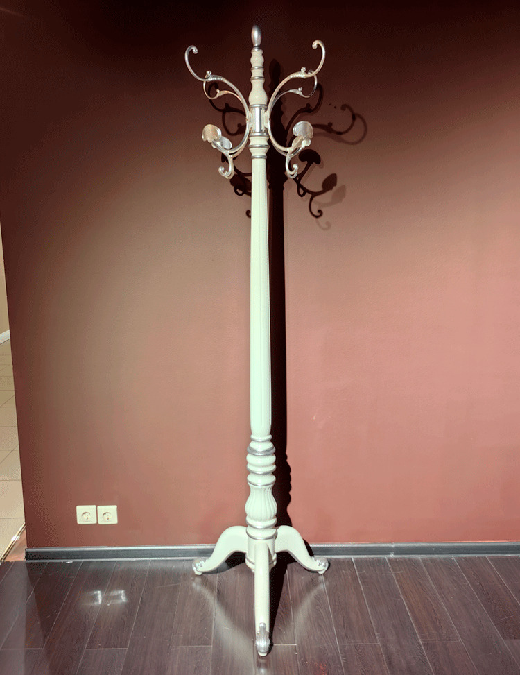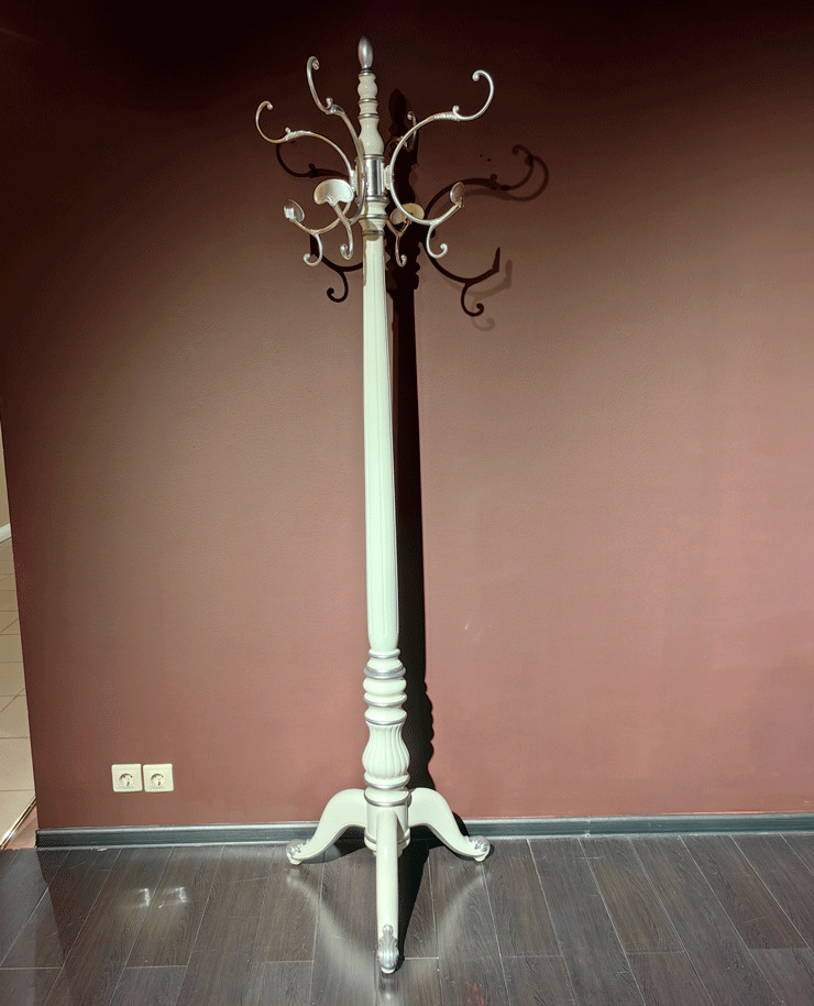 Предлагаем купить красивую, белую, напольную, классическую вешалку из дерева, с четырьмя вращающимися рожками от поставщика классической мебели премиум класса в наличии и на заказ. Мебель безупречного уровня качества. Часть вешалки для одежды, на которой располагаются крючки, для удобства пользования, вращается. Тяжелую одежду можно вешать только на четыре нижних крючка. Верхние крючки служат для головных уборов. Материалы - массив дерева бука, МДФ, эмаль цвета слоновой кости, серебро, золото по резьбе, а также возможно нанесение эффекта старения по резьбе (патины различных цветов). Продажа красивой, классической, белой мебели премиум класса.