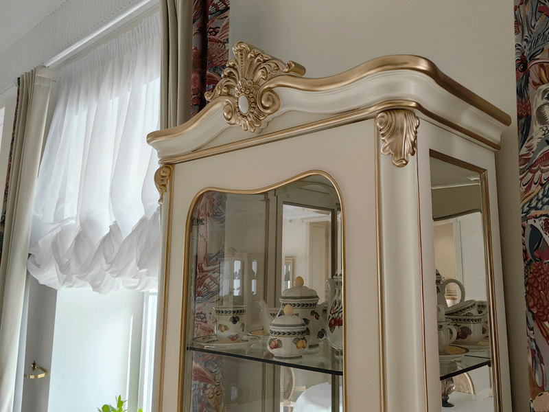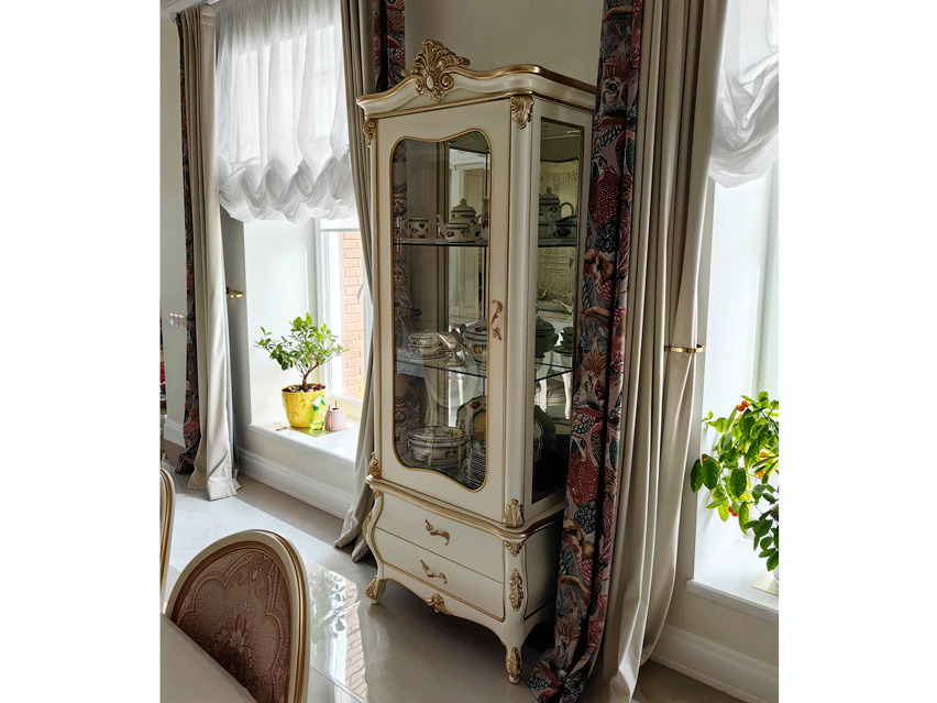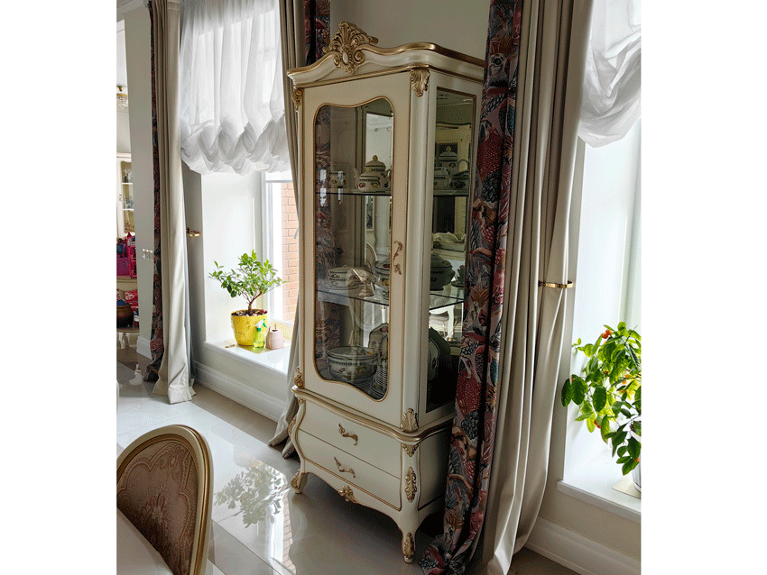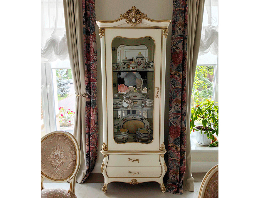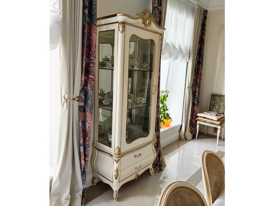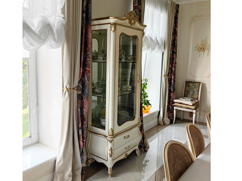 Предлагаем купить красивую, белую классическая витрину из дерева с отделкой серебром в пышных округлых формах в наличии в мебельном салоне. Мебель высокого уровня качества. Мебель для гостиных из дерева премиум класса. Материалы: Каркас, рамы дверей, фасады ящиков, царги, декоративные резные элементы выполнены из массива бука. Большие плоские поверхности (боковины шкафов, полки) выполнены из МДФ. Петли дверей и направляющие для ящиков выполнены с доводчиками. Дно ящиков оббито бархатом. Цвета: Цвет – слоновая кость (белый с небольшим нейтральным оттенком). Степень глянца эмали – 20-30%. На заказ возможна отделка золотым цветом вместо серебряного (жидкая поталь), а также выполнение эффектов состаривания (патины различных цветов). Продажа красивой белой классической мебели из дерева для гостиных.