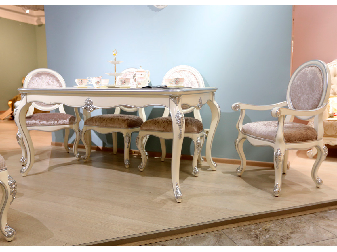 Предлагаем купить красивый белый классический обеденный стол с серебром из дерева в мебельном салоне. Мебель высокого уровня качества. Обеденный стол рассчитан на 8 человек. Данный обеденный стол может быть произведен и в раскладном варианте 1,8-24, метра. Цена при этом будет выше на 35000р. Материалы - массив каучукового дерева, МДФ, эмаль цвета слоновой кости, серебро, золото, а также выполнение на заказ эффектов состаривания (патины различных цветов). Блеск поверхности - шелковистый. Прямоугольные столы ставят в вытянутые свободные зоны, в отличие от круглых столов. Продажа классической белой мебели премиум класса для гостиной.