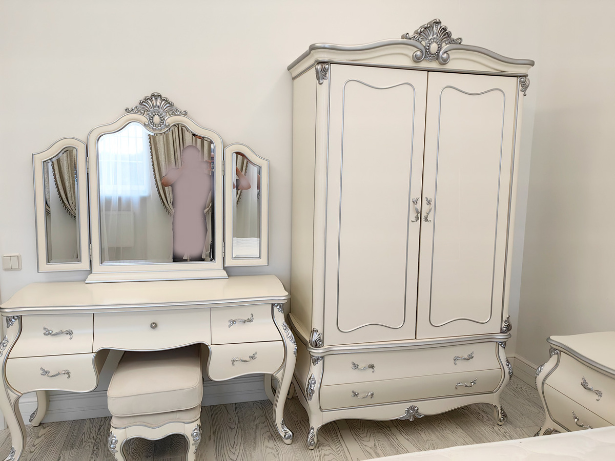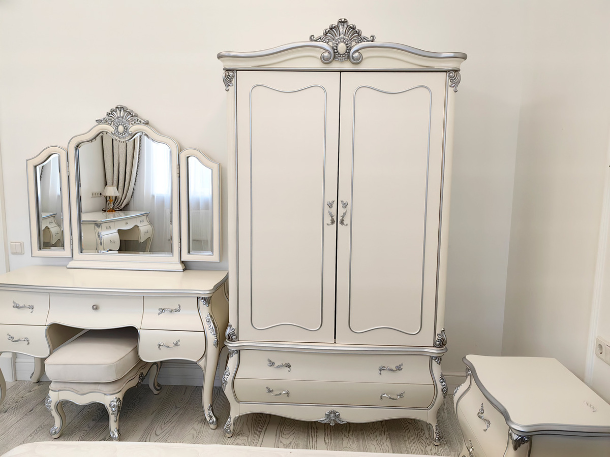 Предлагаем купить не большой, 2х дверный красивый классический платяной шкаф из дерева с выпуклыми ящиками от поставщика мебели в наличии и на заказ. Материалы - массив дерева бука, МДФ, эмаль цвета слоновой кости, серебро, золото (на заказ) - по резьбе, а также возможно нанесение эффекта старения по резьбе (патины различных цветов) . Блеск поверхности - шелковистый. Петли и ящики с современными доводчиками. Дно ящиков оббито бархатом. Мебель высокого уровня качества. Продажа классической, белой, красивой мебели премиум класса.