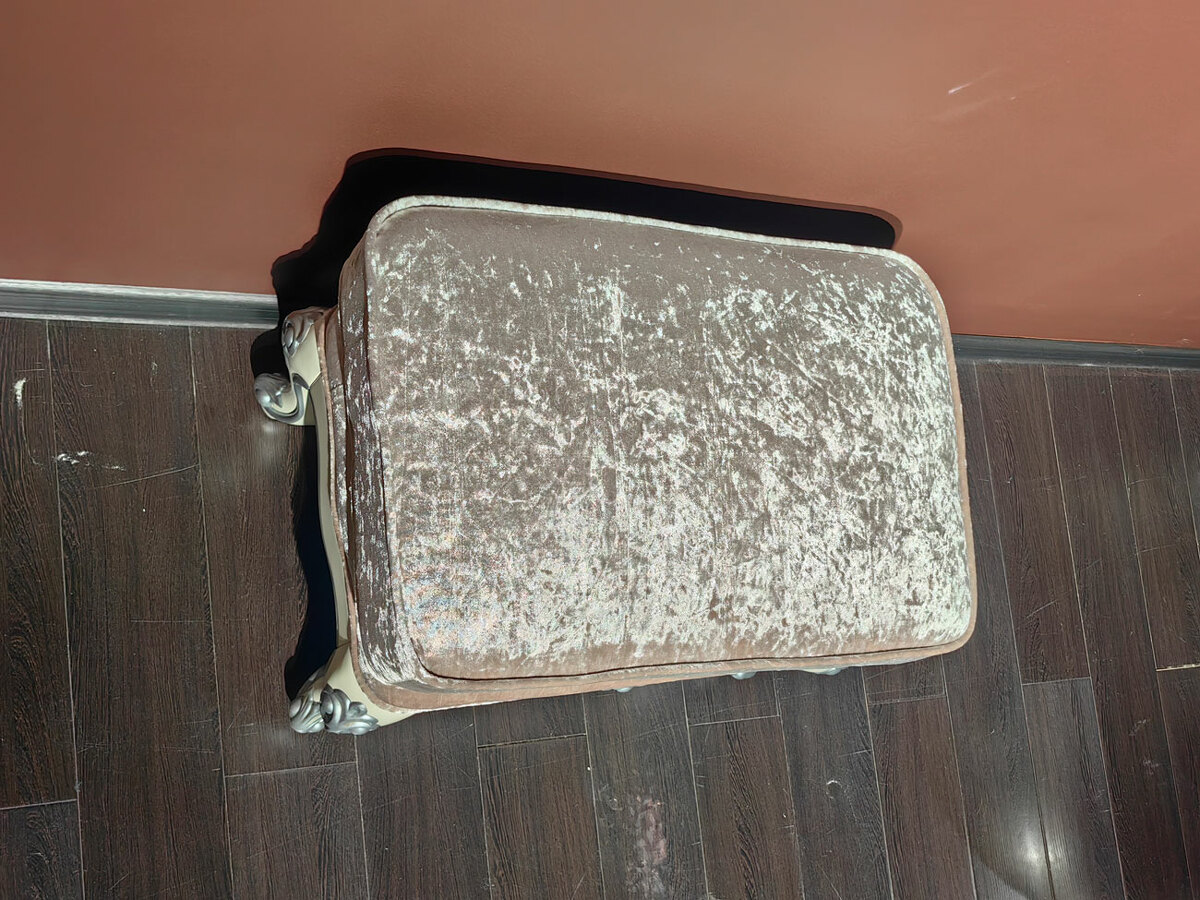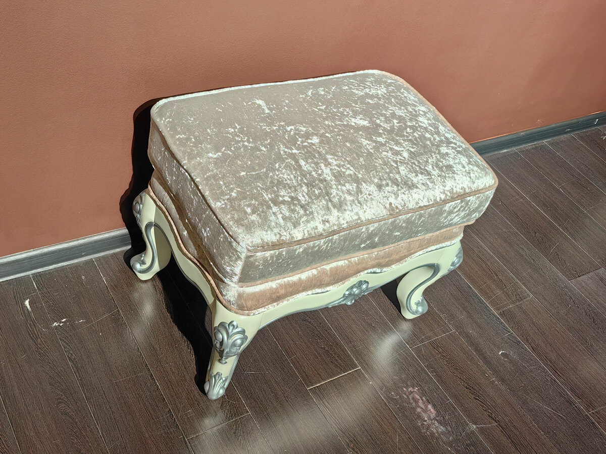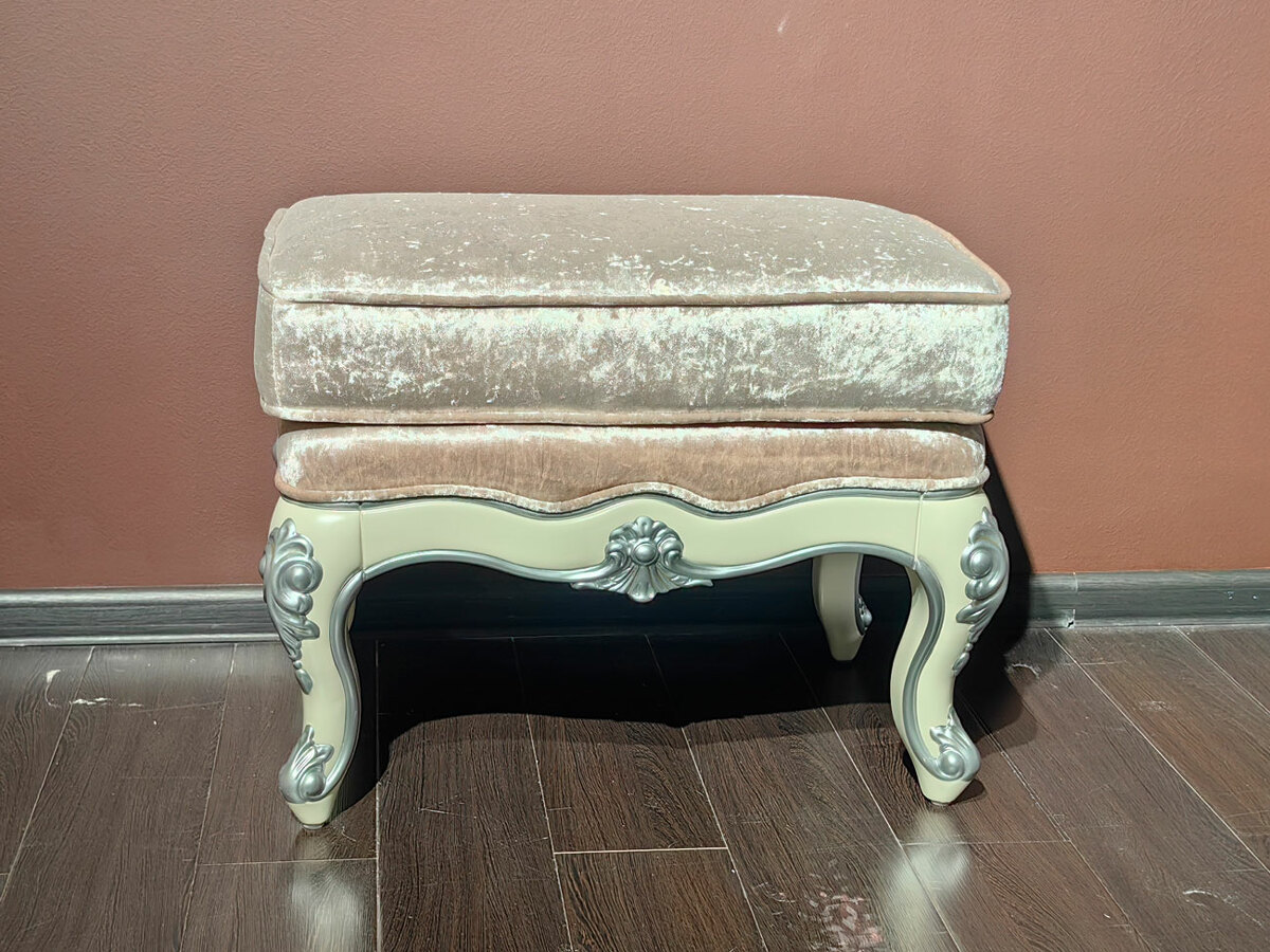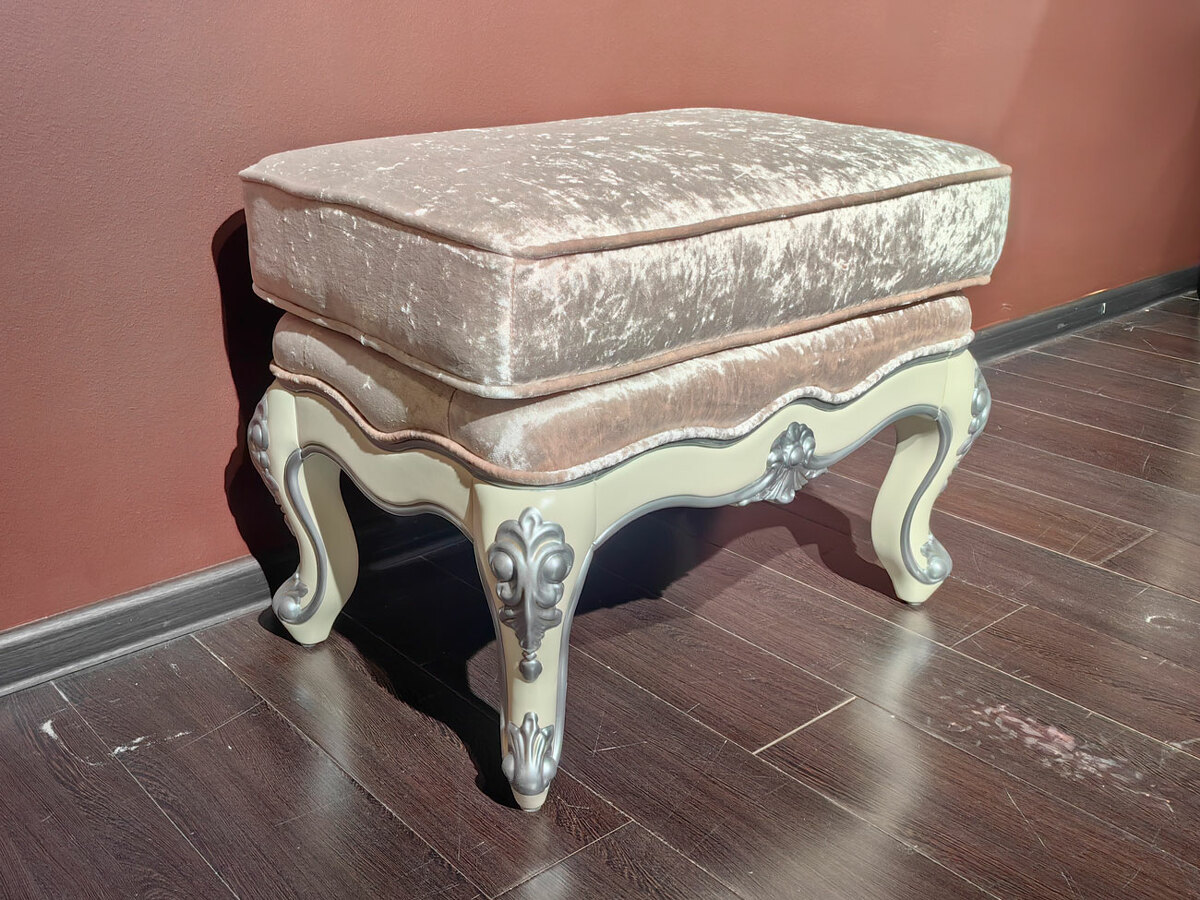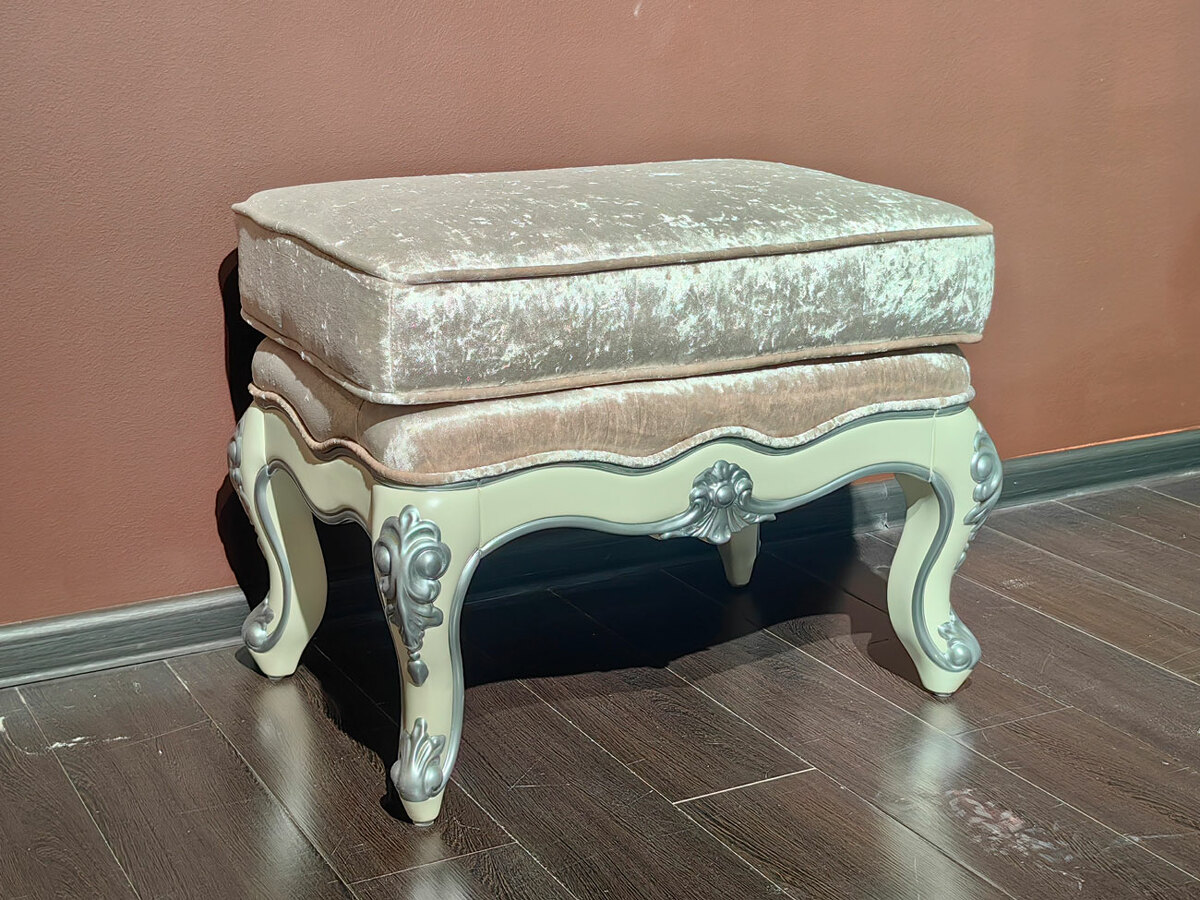 Предлагаем купить красивый, прямоугольный классический, белый пуфик на ножках для спальни и прихожей из дерева в цвете слоновая кость с отделкой серебром и золотом от поставщика мебели премиум класса. Мебель безупречного уровня качества. Пуфик к туалетному столику, выполнен в лаконичном классическом стиле. Материалы - массив дерева бука, МДФ, эмаль цвета слоновой кости, серебро, золото (на заказ), а также возможно нанесение эффекта старения по резьбе (патины различных цветов). Возможна замена ткани.