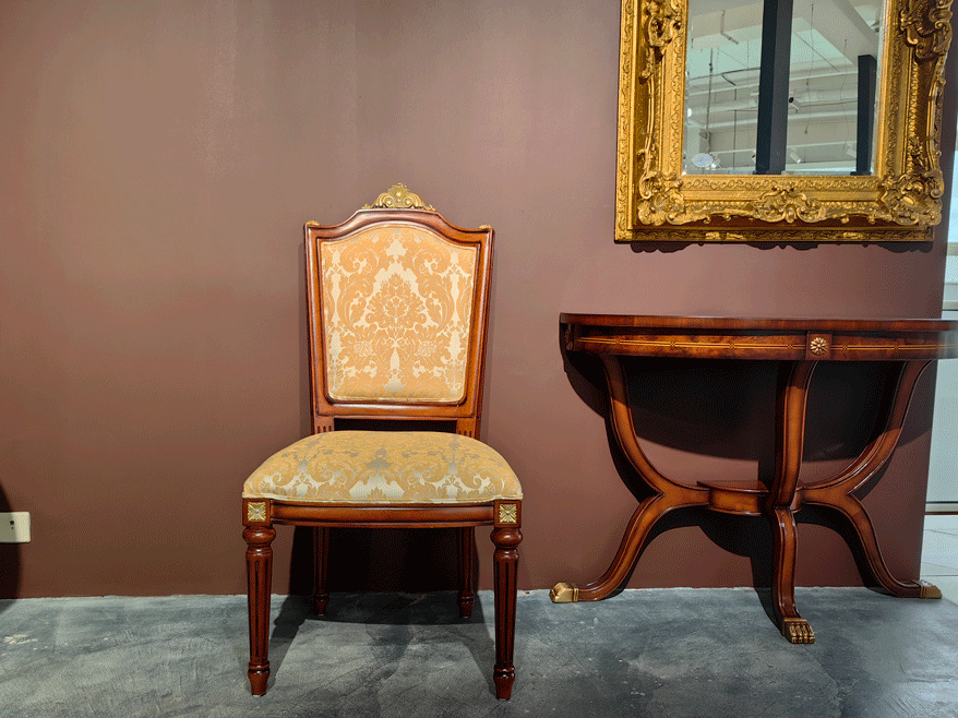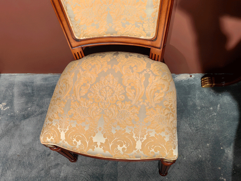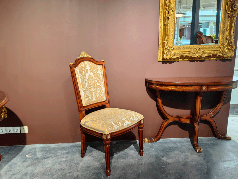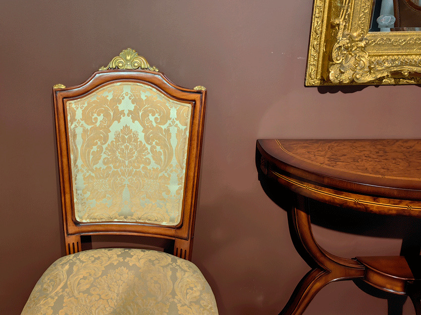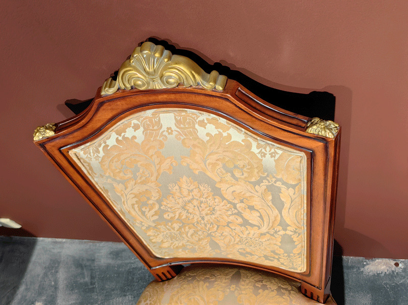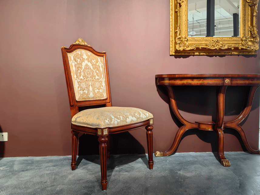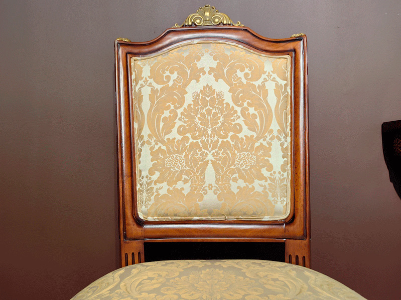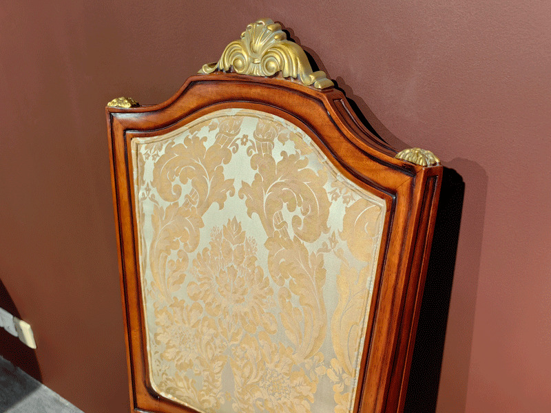 Предлагаем красивый классический обеденный стул из красного дерева, с мягкой спинкой, большим посадочным местом и декоративными розетками, в наличии на складе. Реплика итальянской классической мебели. Исключительное качество производства на уровне лучших итальянских фабрик. Покраска под старину с патиной. Мягкий пружинный блок. Цвет - орех средних тональностей с темной патиной. Блеск поверхности - шелковистый. Возможно изменение ткани на заказ, в том числе на кожу.