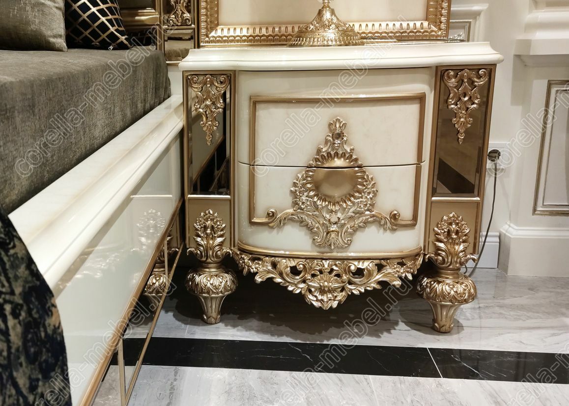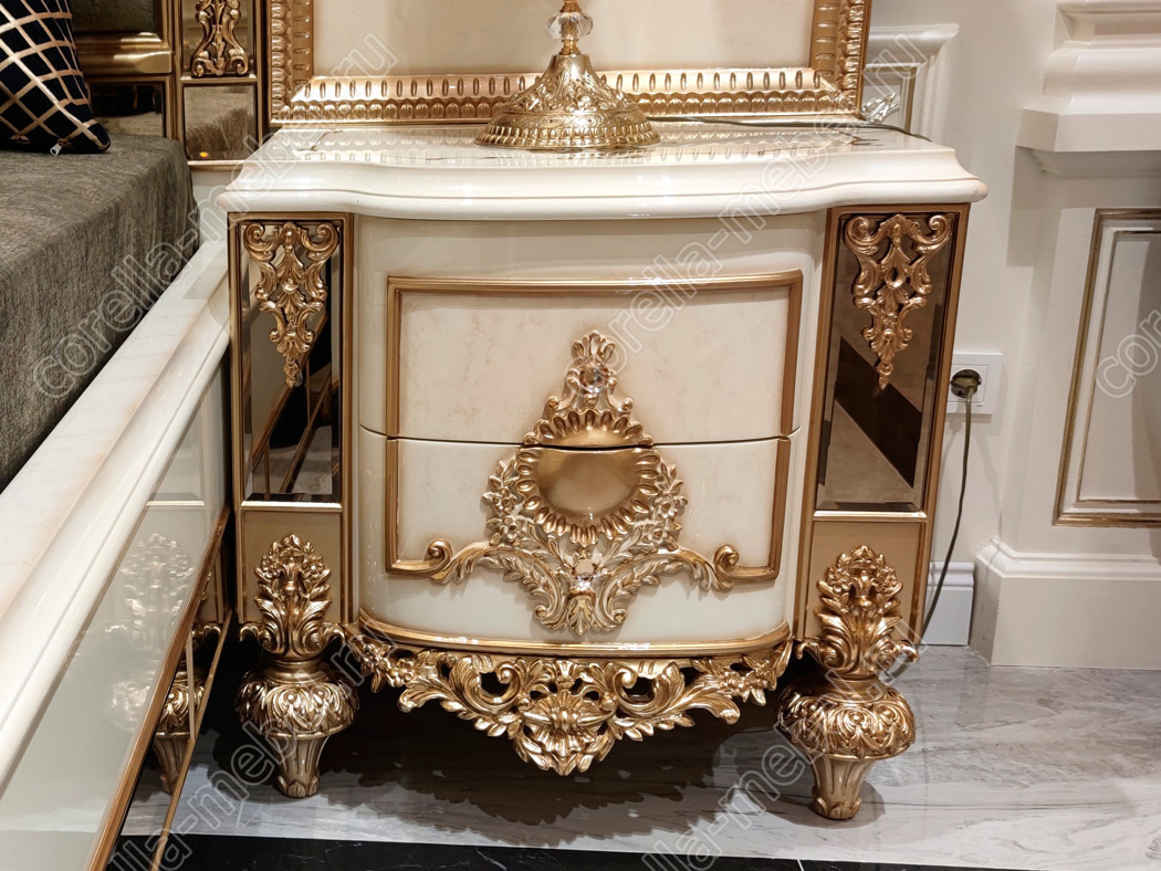 Классическая двуспальная кровать Людовик в дворцовом стиле под матрас 180 х 200 см в качественных в мебельном салоне. Материалы: каркас - массив бука, резьба - жидкий МДФ по немецкой технологии, эмаль, золотая, серебряная поталь, глянцевый лак. Размеры матраса, ткань и окраска дерева могут быть изменены в соответствии (по аналогии) с другой мебелью этой фабрики. Решетка приобретается отдельно. Поставка и продажа дорогой мебели премиум класса.