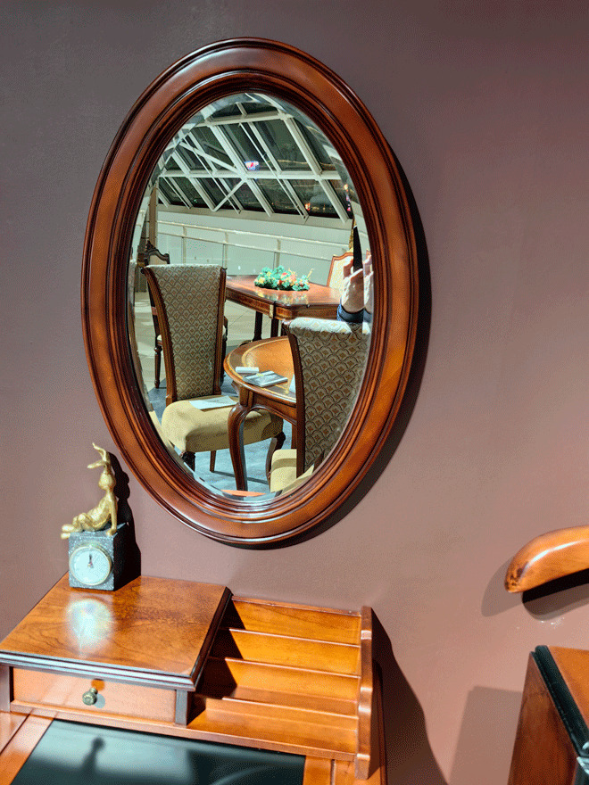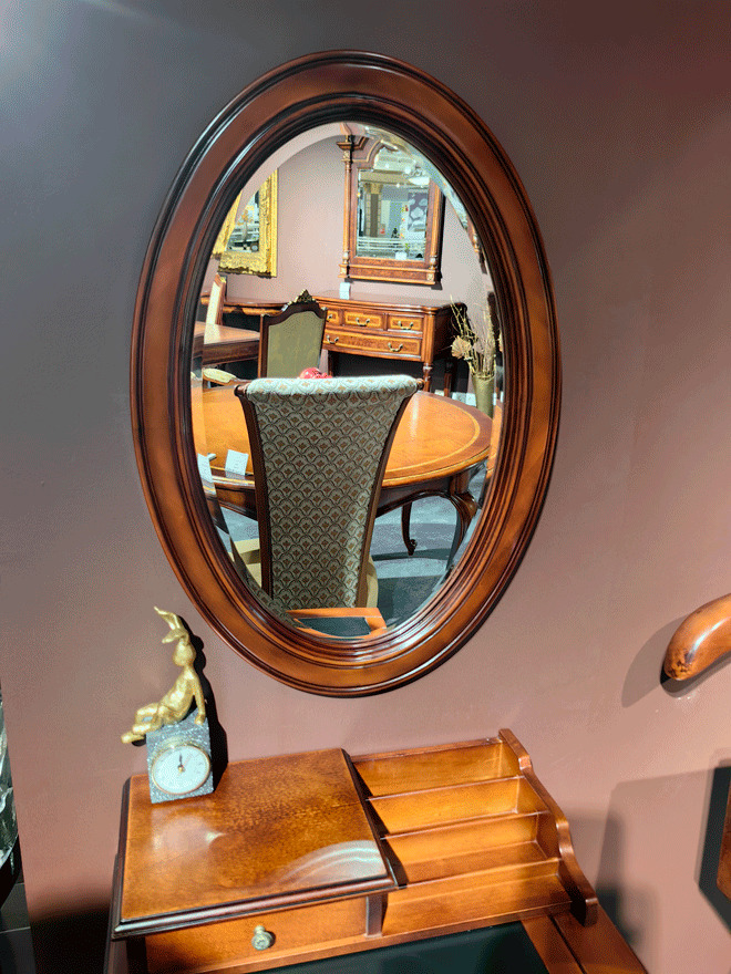 Предлагаем купить красивое, не большое, очень лаконичное классическое настенное зеркало приятной овальной формы в деревянной рамке в цвете орех. Исключительное качество производства на уровне лучших итальянских фабрик. Покраска под старину с патиной. Зеркало выполнено с фацетом по периметру. Массив красного дерева, морилка, темная патина, шелковистый по степени блеска лак. Два крепления на стену.