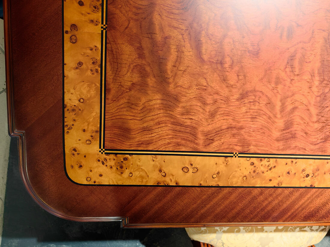 Предлагаем купить красивый, большой классический обеденный стол для просторных квартир и загородных домов из ценных пород дерева в мебельном магазине. Реплика итальянской мебели. Исключительное качество производства на уровне лучших итальянских фабрик. Покраска под старину с патиной. Стол рассчитан на 10-12 человек. Данный стол может быть изготовлен и на 3 метра. Резьба и декоративные элементы выделены бронзой. Стол требует сборки (нужно прикрутить ножки). Массив и шпон красного дерева, шпон экзотического бубинго (волны), маркетри. Прямоугольные обеденные столы лучше подходят для вытянутых свободных зон в гостиных и столовых. Цвет: орех, темная патина. Блеск поверхности - шелковистый. Продажа классической мебели из дерева премиум класса от поставщика.
