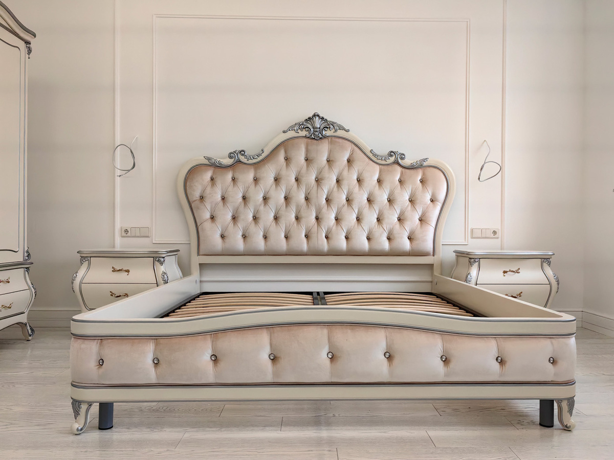 Предлагаем купить белую классическую двуспальную кровать из массива дерева, с тканью на изголовье для спальни в наличии. К кровати также предлагаются прикроватные тумбочки, туалетный стол и другая мебель для спальни. Материалы - массив дерева бука, МДФ, эмаль цвета слоновой кости, серебро, золото (на заказ), а также выполнение на заказ эффектов состаривания (патины различных цветов). Возможна замена ткани на ткань заказчика. Кровать поставляется с ортопедической решеткой. Продажа белой мебели премиум класса из дерева для спальни. Фабрика высокого уровня качества.