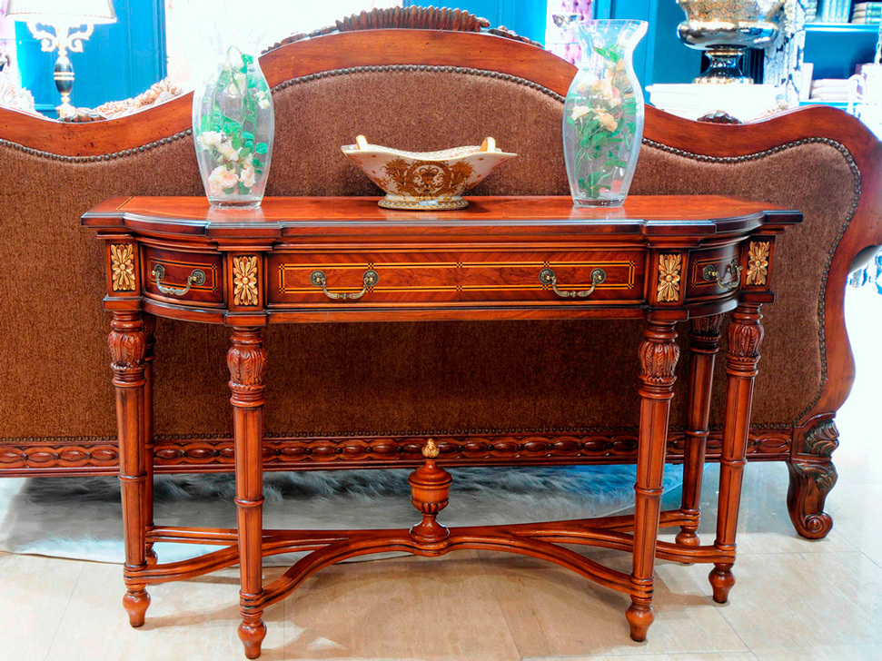 Предлагаем купить красивую, классическую консоль с ящиками, на длинных ножках из массива красного дерева от поставщика мебели премиум класса на заказ и в наличии в мебельном салоне. Реплика итальянской мебели. Цвет: орех, темная патина. Блеск поверхности - шелковистый. Исключительное качество производства на уровне лучших итальянских фабрик. Покраска под старину с патиной. Данная консоль идеально подходит для прихожей. Верхние ящики могут быть использованы для мелочей (ключи и др.). Резьба и декоративные элементы выделены бронзой. Консоль не требует сборки. Массив и шпон красного дерева, шпон экзотического бубинго (волны), маркетри. Продажа красивой классической мебели премиум класса из ценных пород дерева.