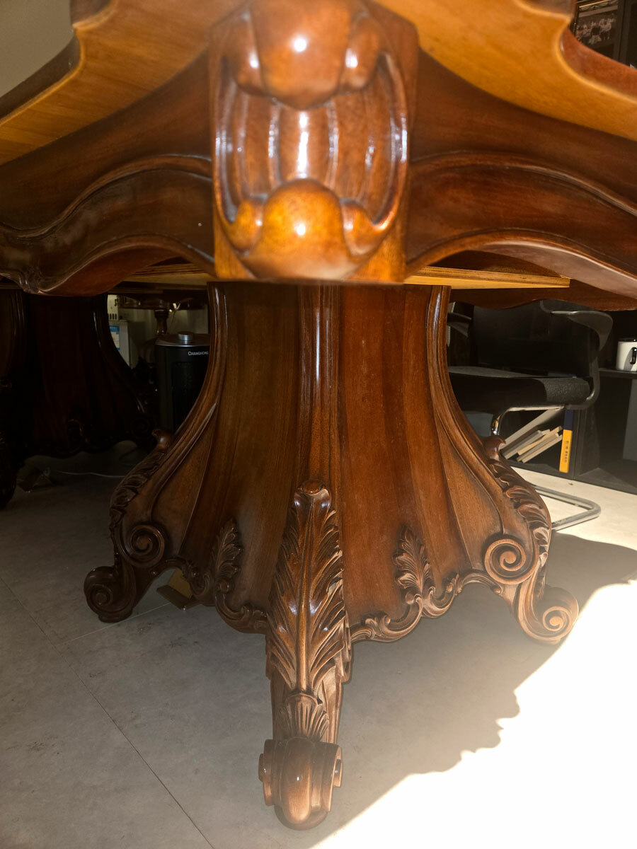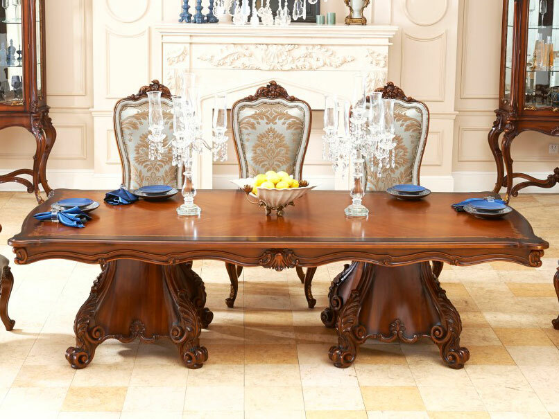 Предлагаем купить красивый, большой прямоугольный классический стол премиум класса из массива красного дерева. Исключительное качество производства на уровне лучших итальянских фабрик. Покраска под старину с патиной. Стол рассчитан на 10-12 человек. Реплика итальянской мебели. Стол требует сборки (прикрутить тумбы). Массив и шпон красного дерева "пламя", маркетри. Прямоугольные обеденные столы лучше подходят для вытянутых свободных зон в гостиных и столовых. Цвет: орех, темная патина. Блеск поверхности - шелковистый. Продажа больших классических столов премиум класса для гостиной из дерева.