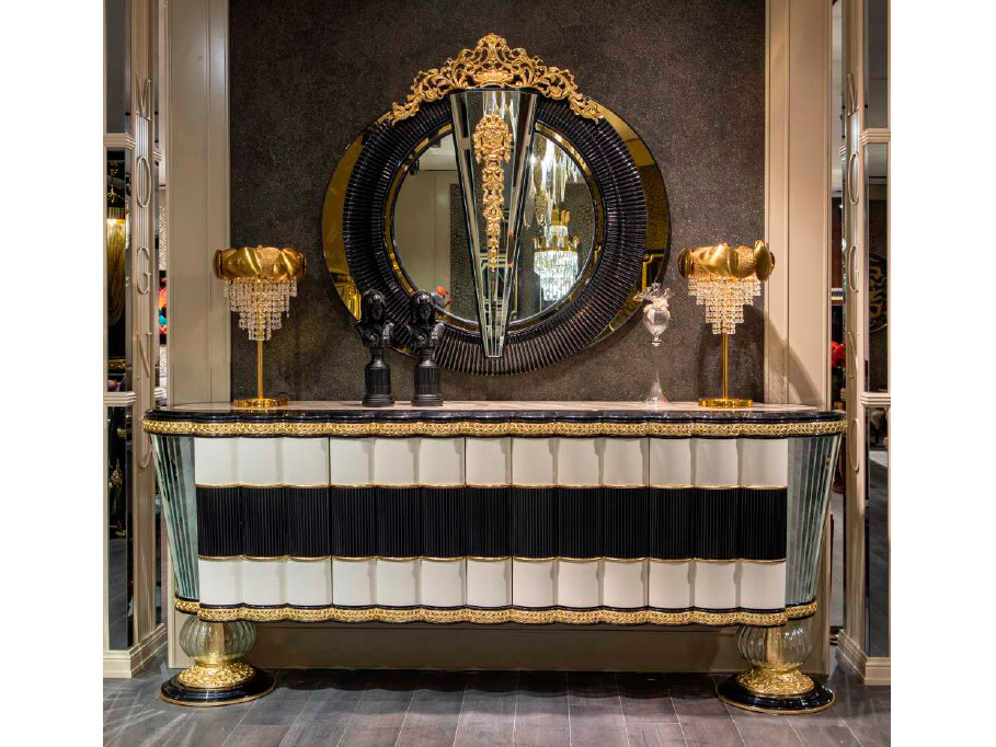Предлагаем купить красивый, элитный буфет для гостиной черно-белый на стеклянных шарах с отделкой зеркалами на заказ. Зеркало поставляется дополнительно. Материалы: каркас - массив бука, жидкий МДФ, эмаль, золотая поталь, стекло, глянцевый лак. Окраска дерева может быть изменена в соответствии (по аналогии) с другой мебелью этой фабрики. Продажа красивой, современной мебели премиум класса для гостиной