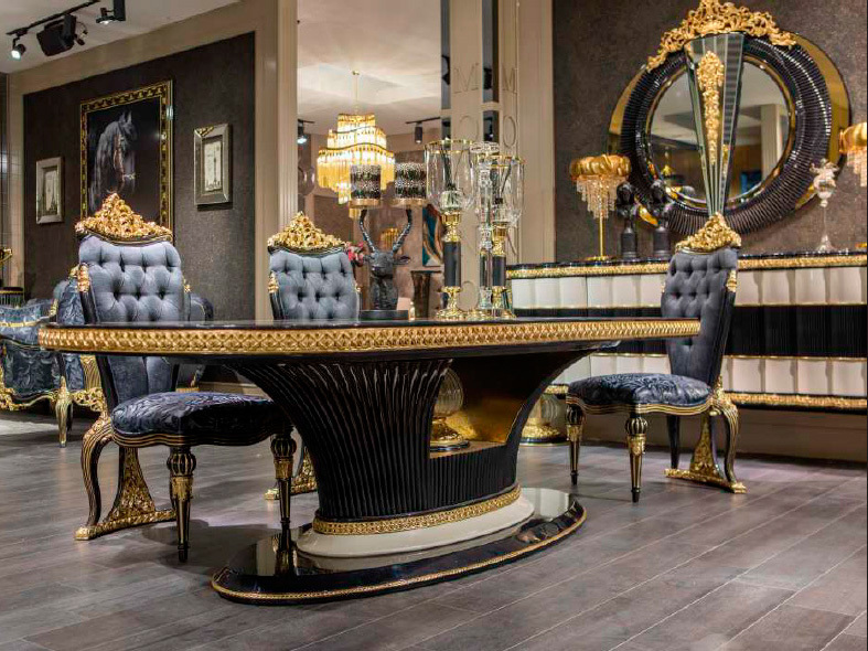 Предлагаем оригинальный, красивый, современный, овальный обеденный стол и стулья премиум класса. Материалы: каркас - массив бука, жидкий МДФ, эмаль, золотая поталь, стекло, глянцевый лак. Окраска дерева и обивочные ткани могут быть изменены в соответствии (по аналогии) с другой мебелью этой фабрики. Реплика итальянской мебели. Продажа красивых, современных, элитных обеденных столов и стульев.