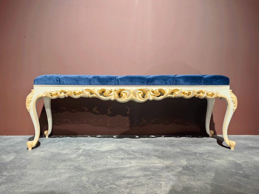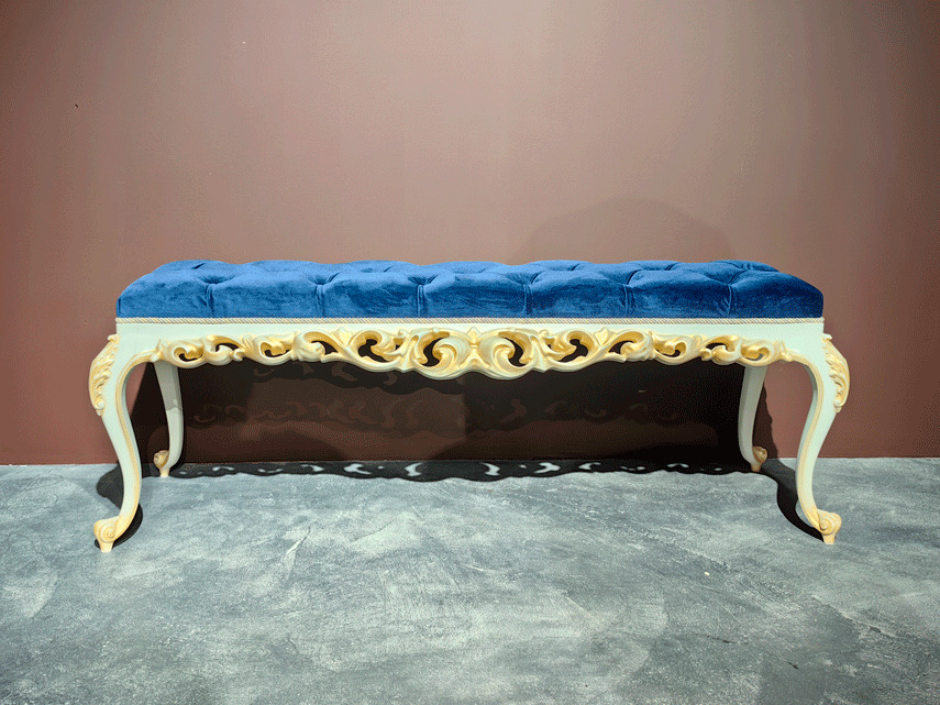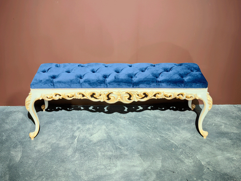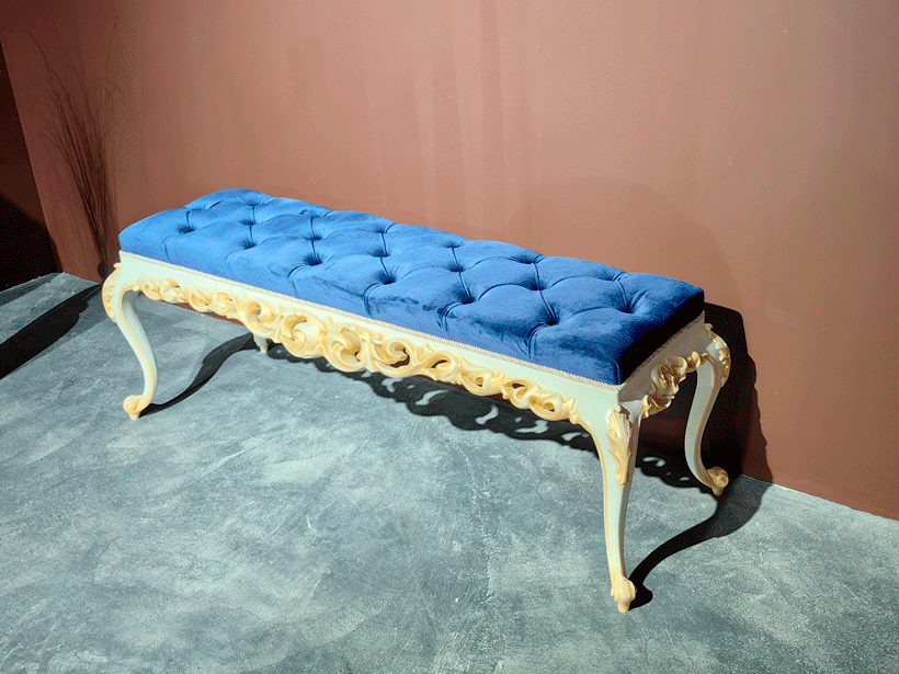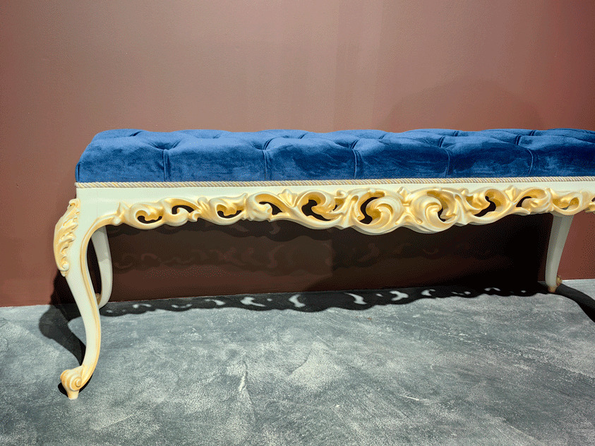Изготовим ажурную, резную, прикроватную банкетку на гнутых ножках из массива бука от производителя мебели премиум класса в Москве на заказ. Индивидуальный подход к каждому клиенту при оформлении заказа. Возможно некоторое изменение размеров банкетки. Материалы - массив бука, эмаль, патина, лак. Банкетка изготавливается на заказ, поэтому возможны любые размеры и цвета дерева и ткани.