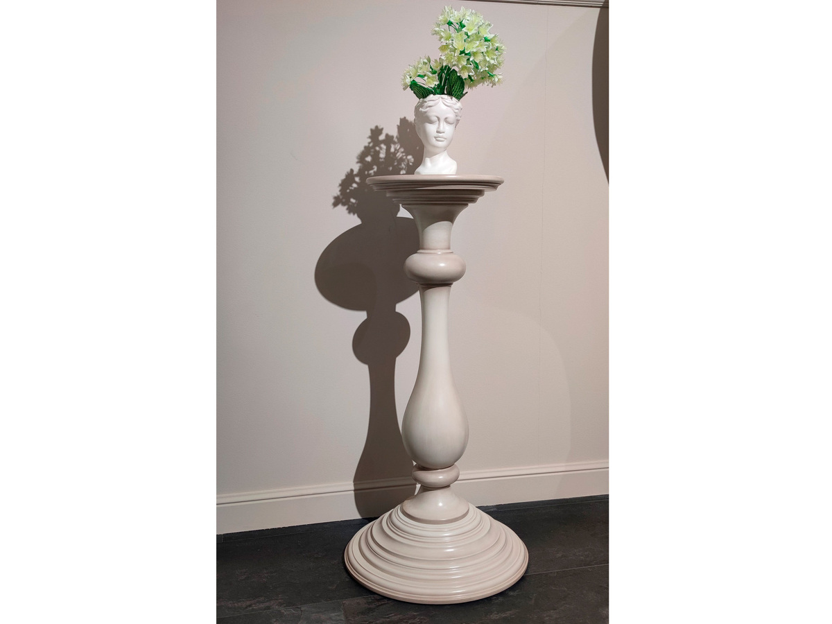 Предлагаем купить красивую, круглую, белую подставку под цветы и бра, напольная, на фигурной ножке, из дерева. Собственное производство столярной мастерской. Цвет могут быть изменен. Материалы - массив бука, эмаль, патина. Продажа красивых подставок для цветов.