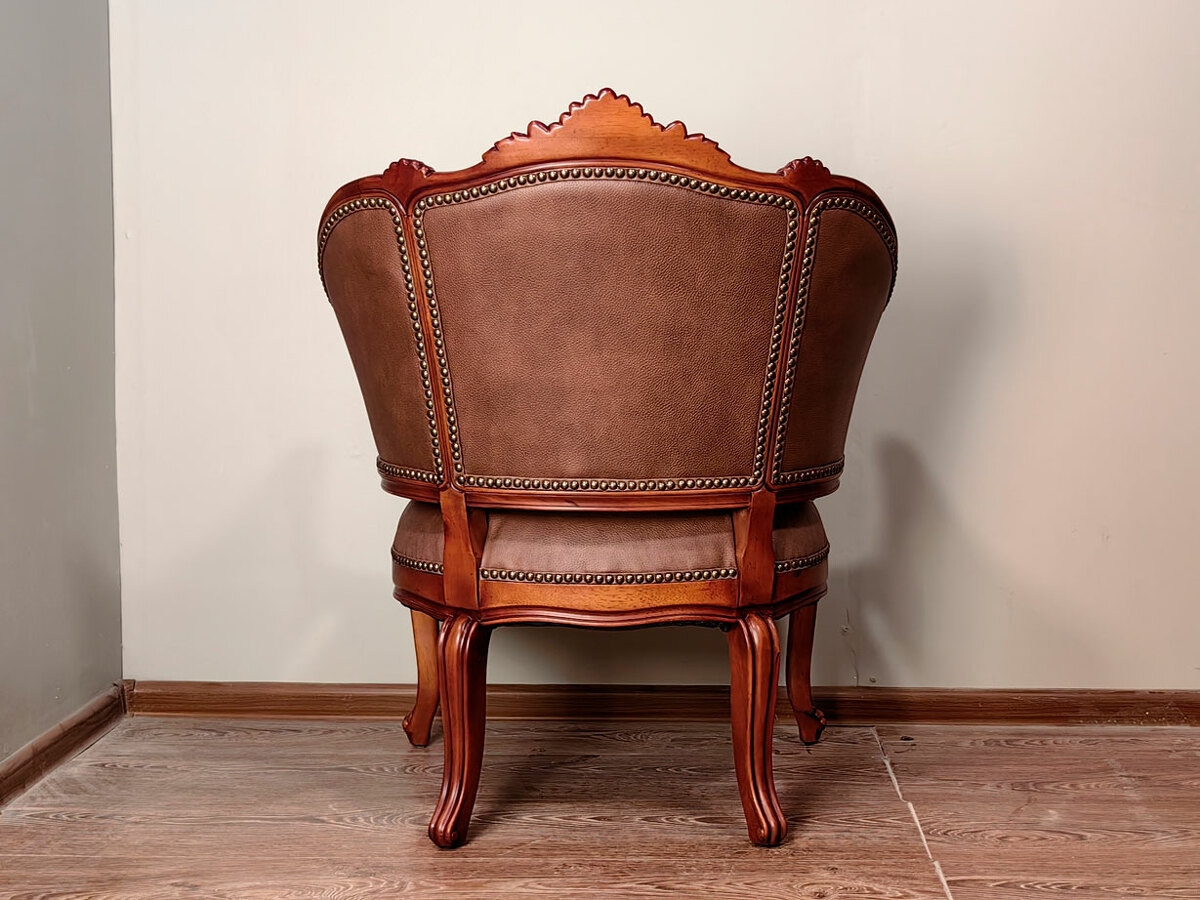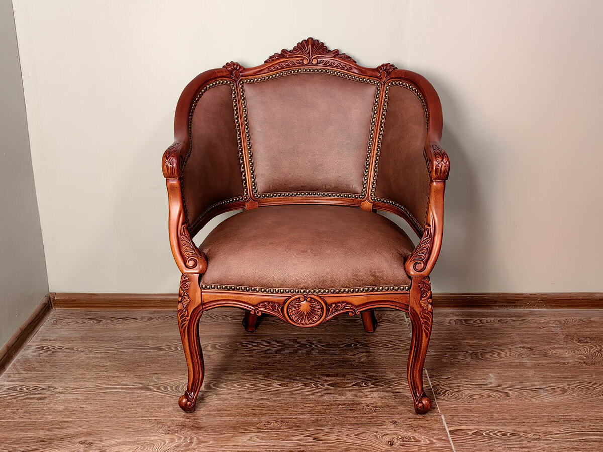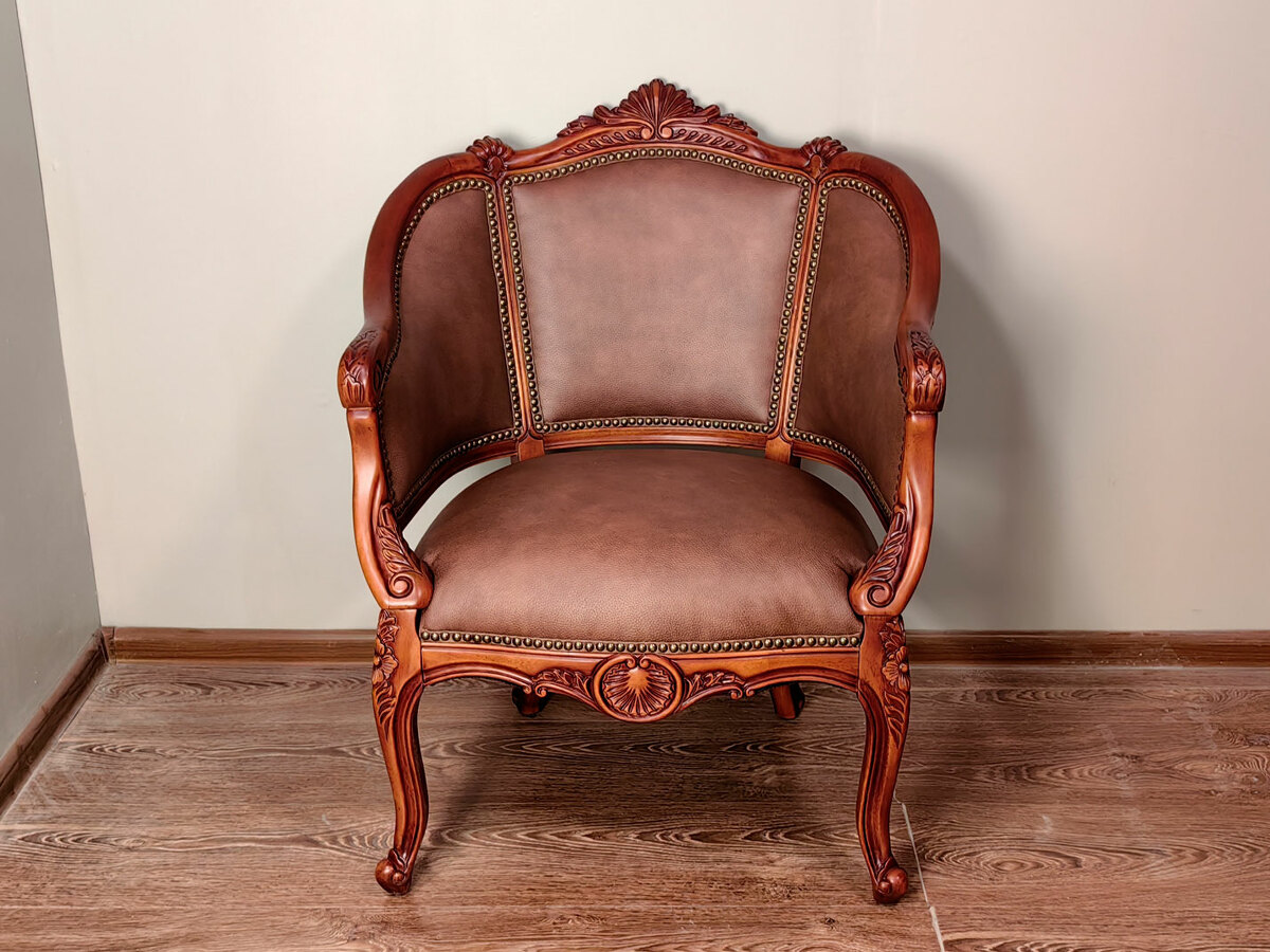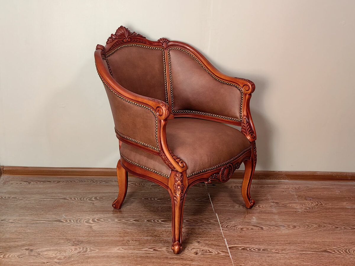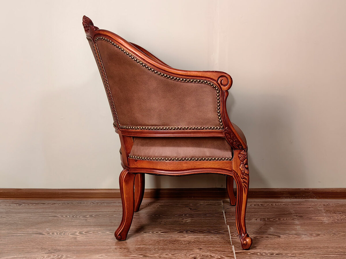 Купить не большое, легкое классическое кресло закругленное, в том числе для кофейных групп в наличии по распродаже в мебельном салоне. Высота посадочного места - 470 мм. Глубина - 510 мм. Возможна перетяжка кресла в другую ткань по выбору заказчика. Материал - массив красного дерева средних цветовых оттенков. Образец в коже с гвоздями стоитт дороже на 35000р.
