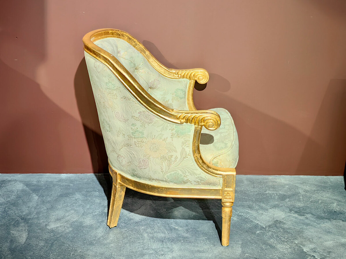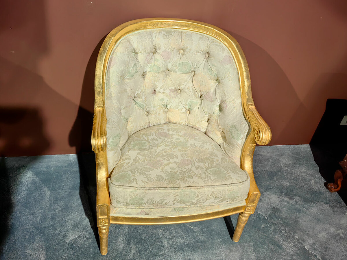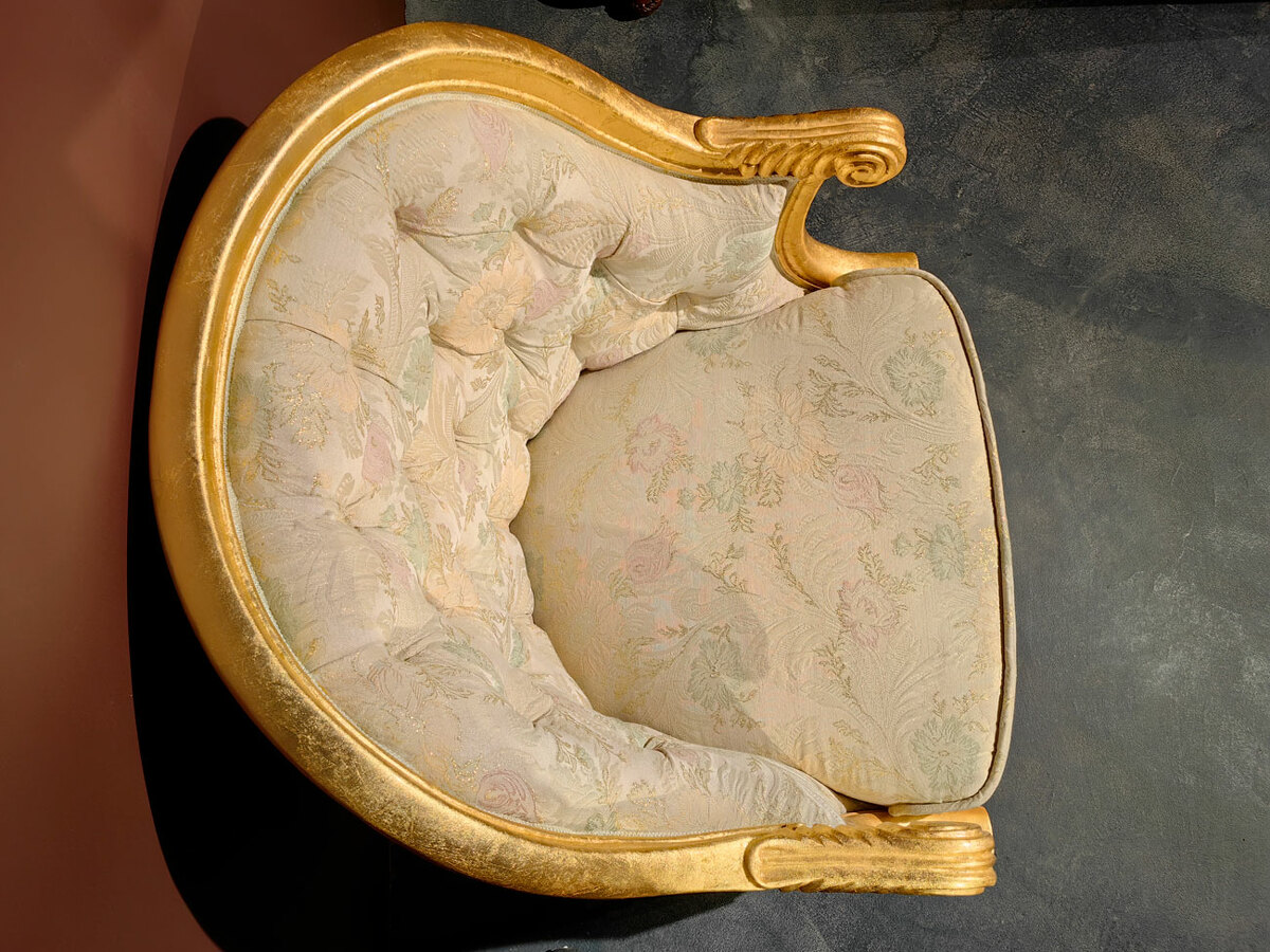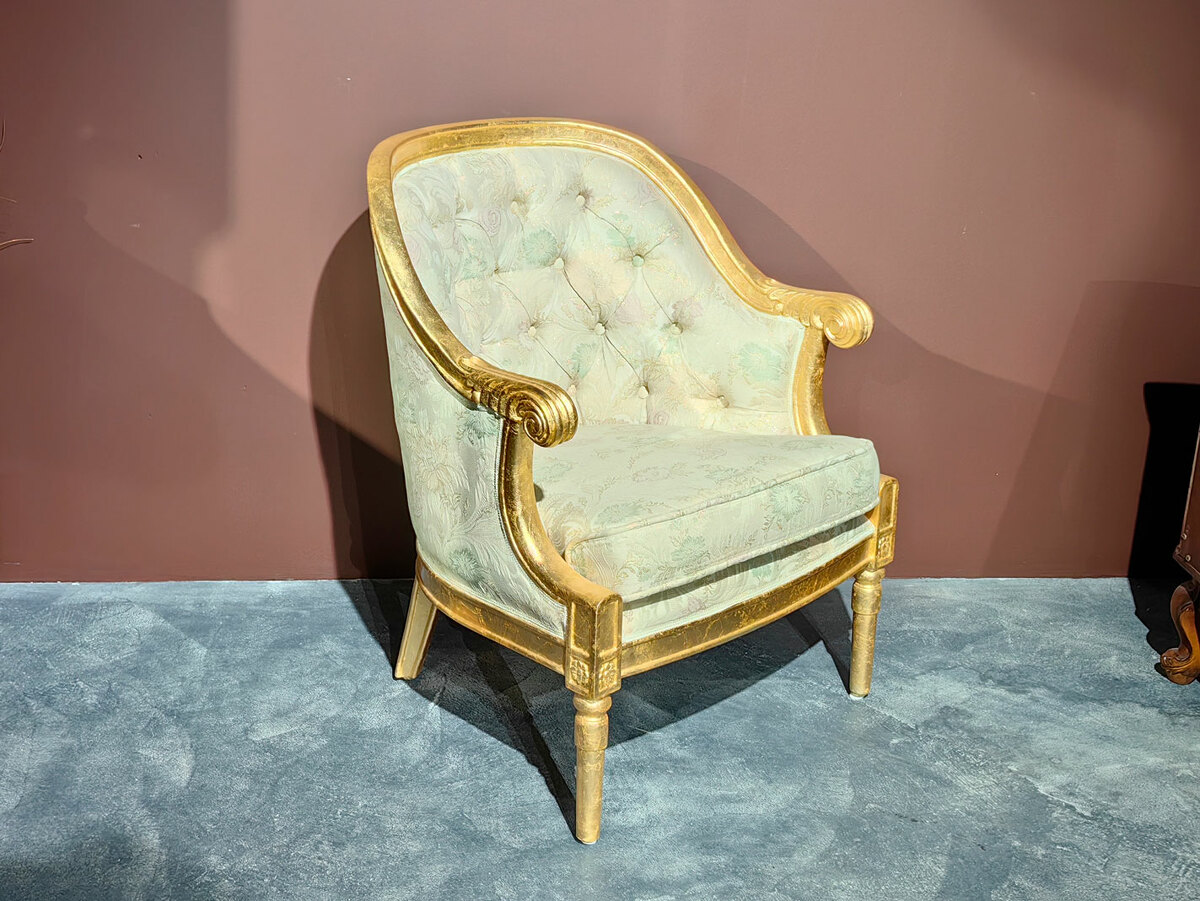 Очень удобное (полукруглая спинка) и небольшое уютное дамское кресло барокко для создания кофейных групп в наличии по распродаже в мебельном салоне. Материал - массив каучукового дерева, натуральная позолота, эмаль различных цветов. Кресло есть в наличии на складе.