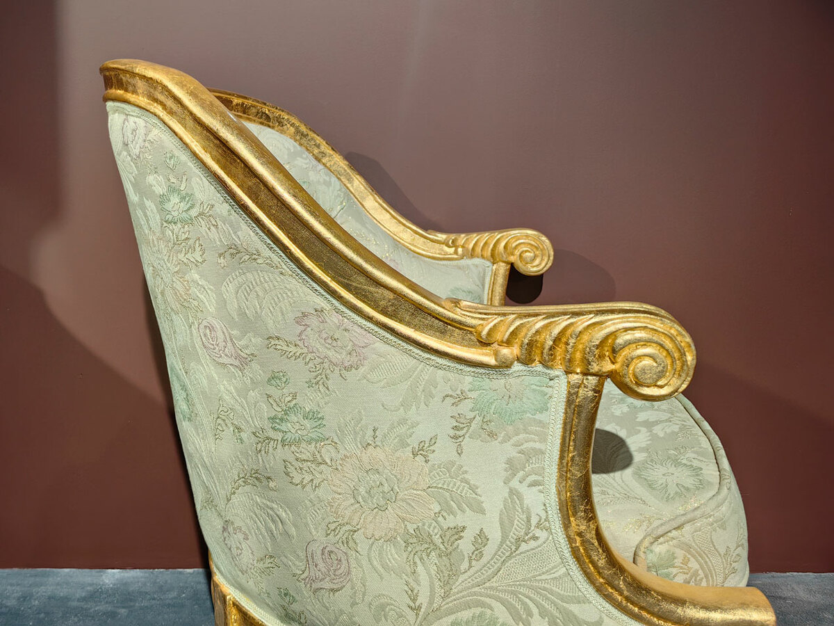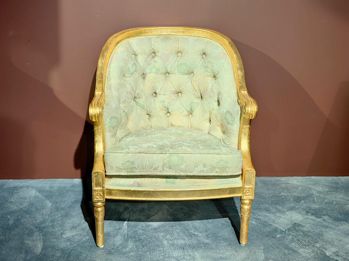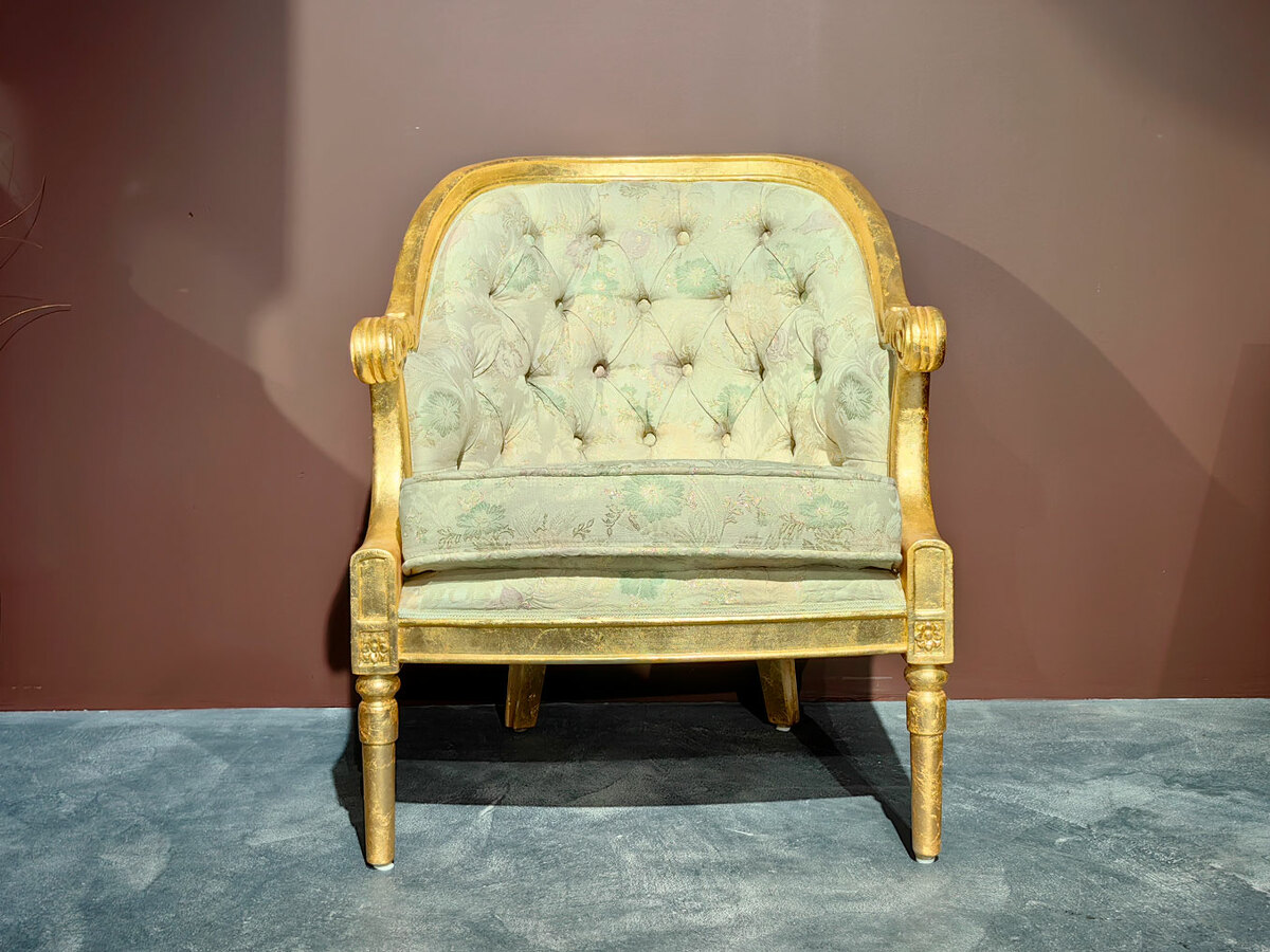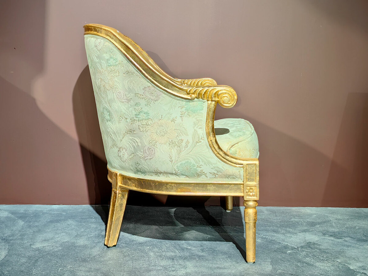 Очень удобное (полукруглая спинка) и небольшое уютное дамское кресло барокко для создания кофейных групп в наличии по распродаже в мебельном салоне. Материал - массив каучукового дерева, натуральная позолота, эмаль различных цветов. Кресло есть в наличии на складе.