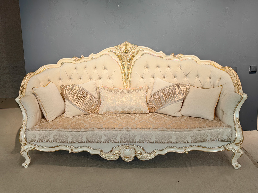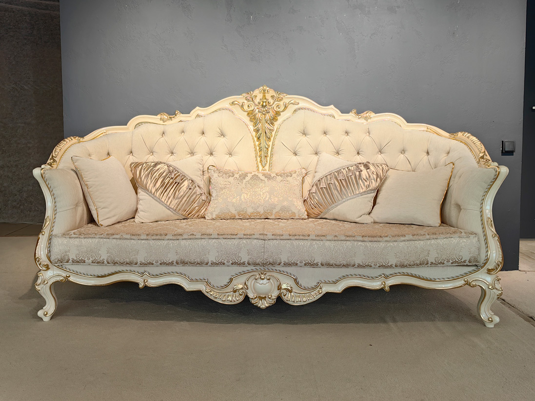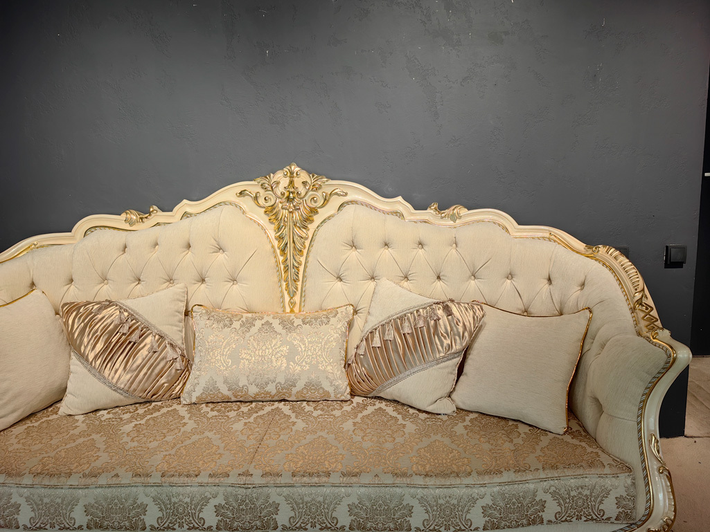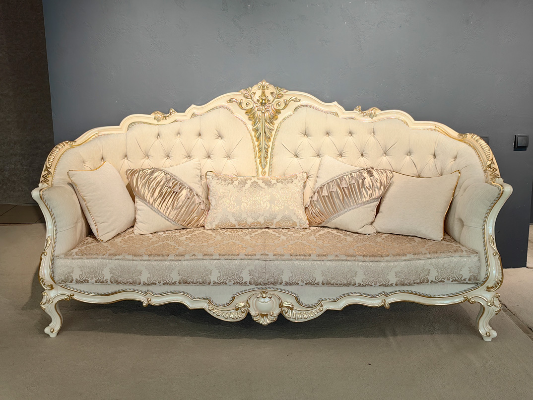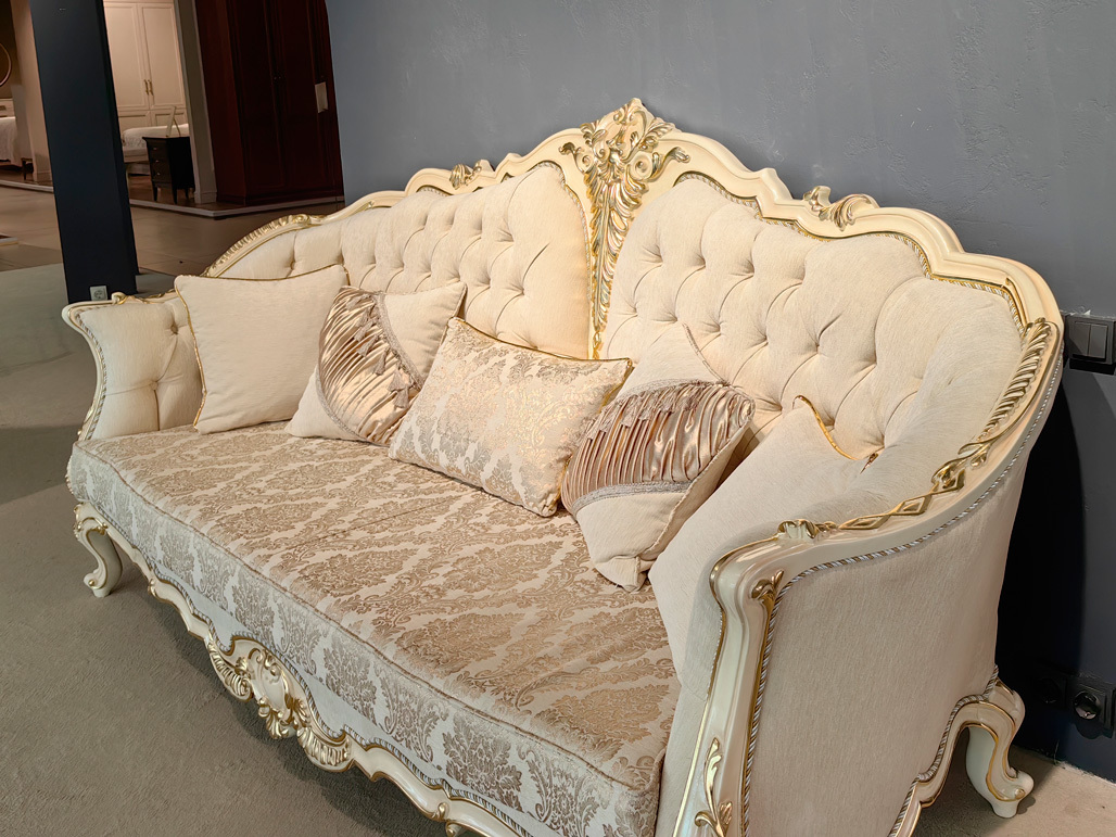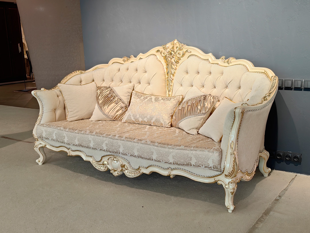 Предлагаем купить красивую классическую мягкую мебель премиум класса из дерева для гостиной: двух, трех и четырехместные диваны, кресла в роскошных турецких тканях, журнальный и кофейные столы, ТВ тумбу. Длинна двух местного дивана - 185 сантиметров, четырех местного - 270 сантиметров. На заказ возможно изменить цвет отделки дерева и тип ткани. Цена указана на трехместный диван.