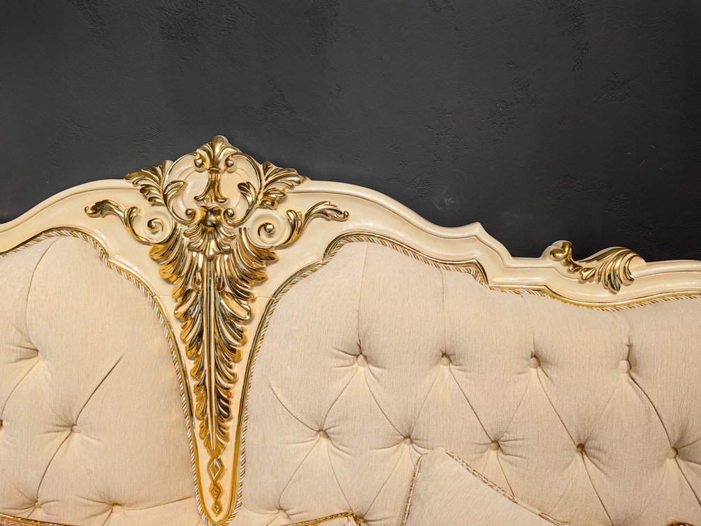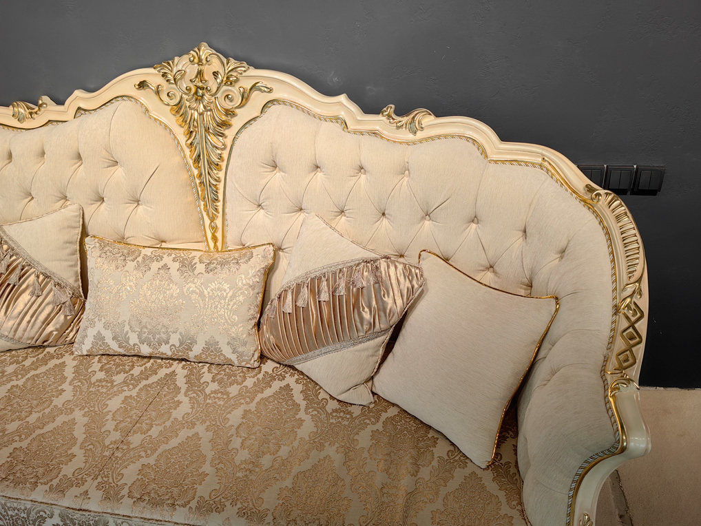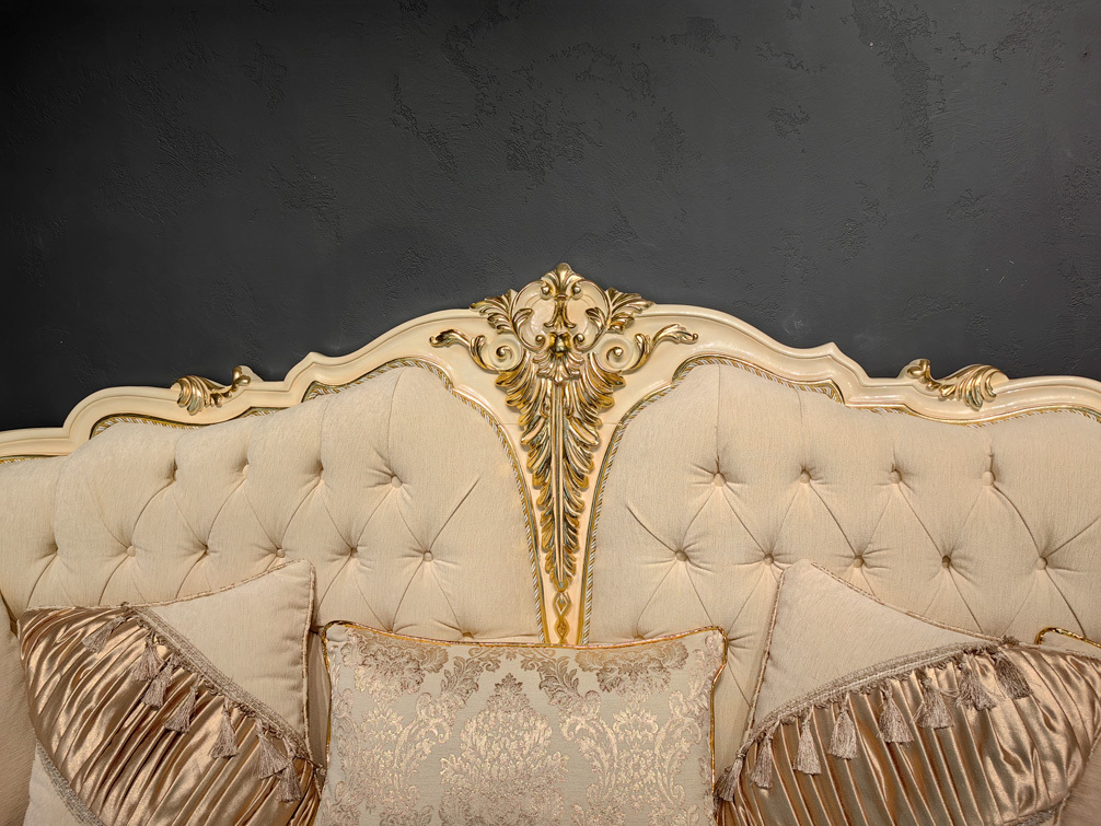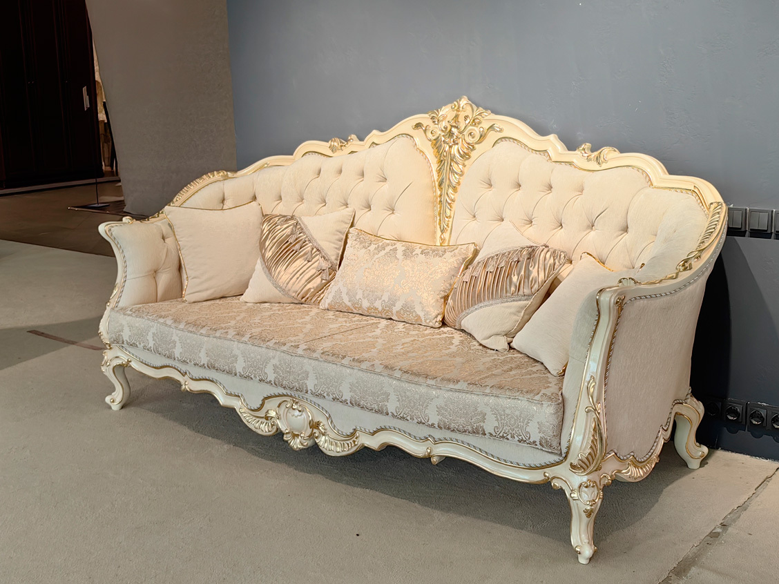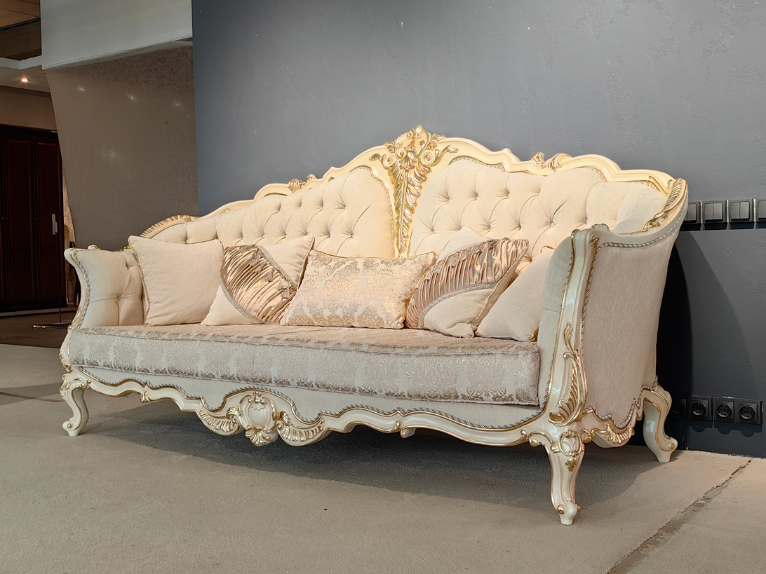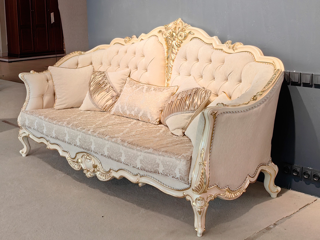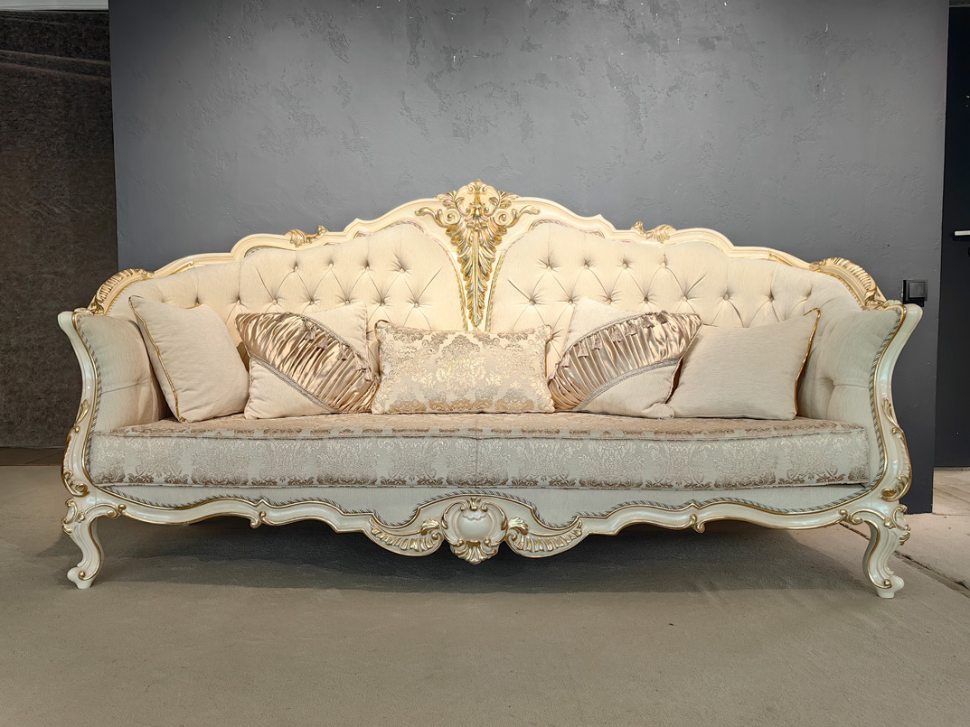 Предлагаем купить красивую классическую мягкую мебель премиум класса из дерева для гостиной: двух, трех и четырехместные диваны, кресла в роскошных турецких тканях, журнальный и кофейные столы, ТВ тумбу. Длинна двух местного дивана - 185 сантиметров, четырех местного - 270 сантиметров. На заказ возможно изменить цвет отделки дерева и тип ткани. Цена указана на трехместный диван.