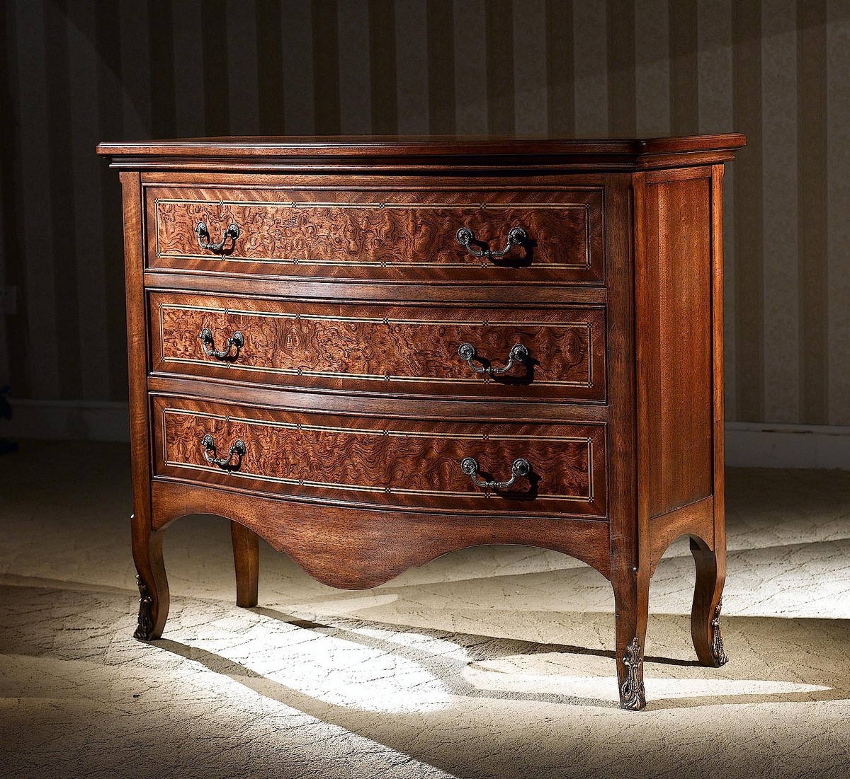 Предлагаем купить красивый, классический комод с тремя ящиками из массива ценных пород дерева: бубинго, красное дерево, ятоба. Комод выполнен по старинным классическим мотивам: ящики двигаются по деревянным полозьям. Ручки - бронза. Исключительное качество производства на уровне лучших итальянских фабрик. Покраска под старину с патиной. Цвет: орех с темной патиной. Блеск поверхностей - шелковистый. Продажа красивых классических комодов из дерева, премиум класса.