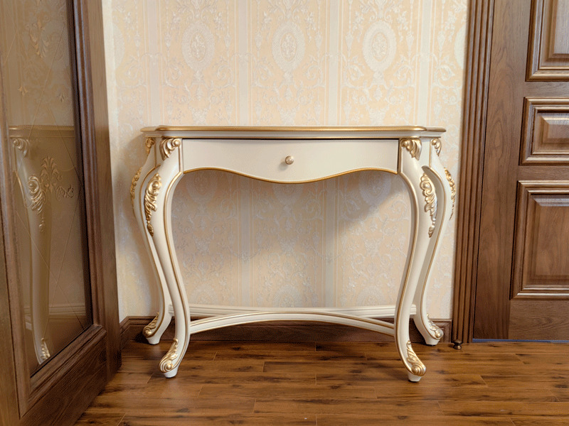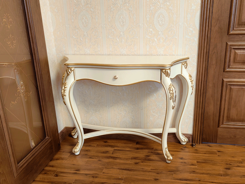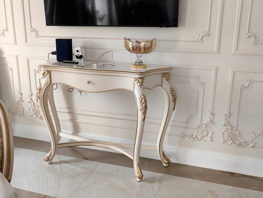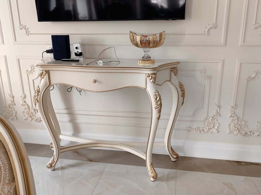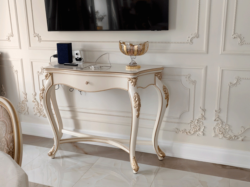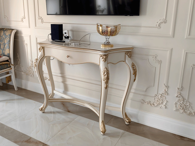 Предлагаем купить красивую, белую с золотом, классическую консоль из дерева на гнутых ножках, с ящиком на доводчиках в мебельном салоне. К консоли имеется зеркало. Мебель высокого уровня качества. Материалы - массив дерева бука, МДФ, эмаль цвета слоновой кости, золото по резьбе, а также возможно нанесение эффекта старения по резьбе (патины различных цветов). Блеск поверхности - шелковистый. Дно ящика оббито бархатом. В наличии в магазине. Продажа красивой, дорогой, белой классической мебели из дерева - красивые консоли с настенными зеркалами.