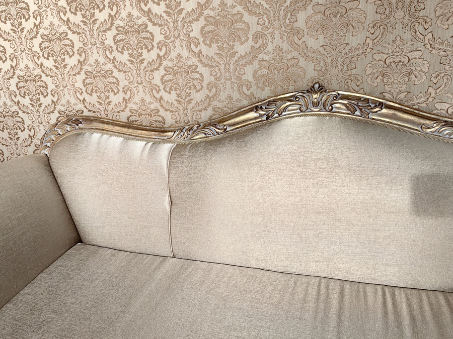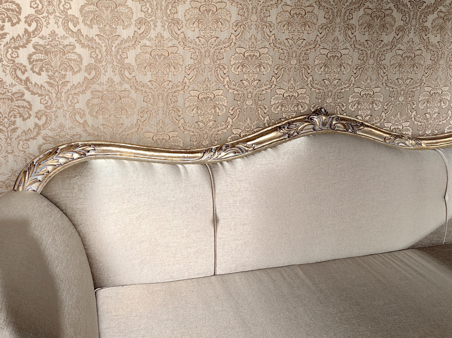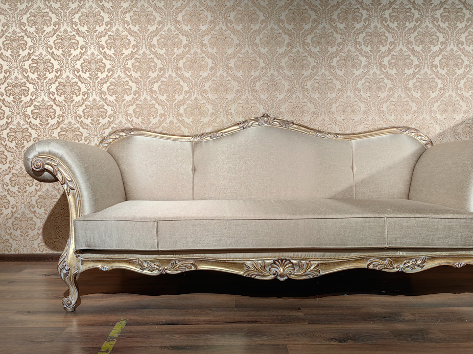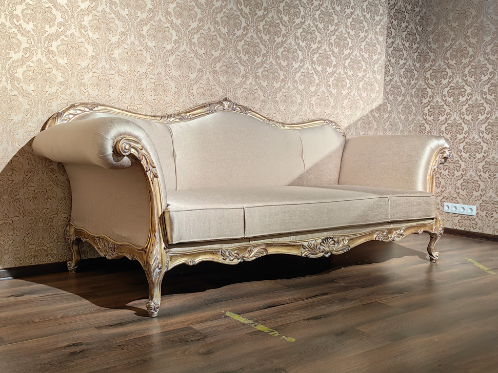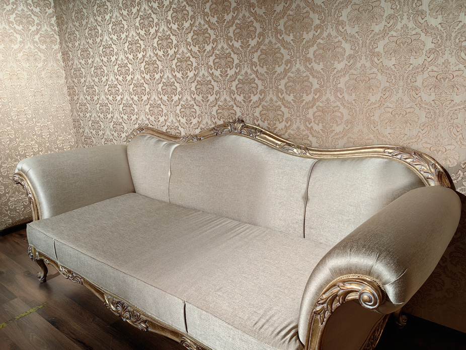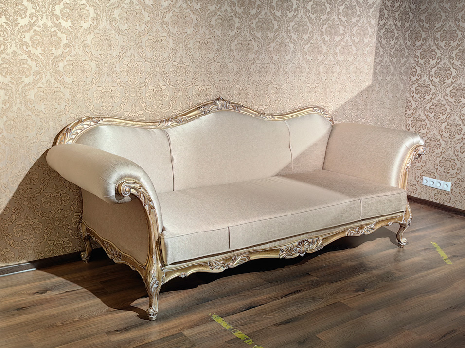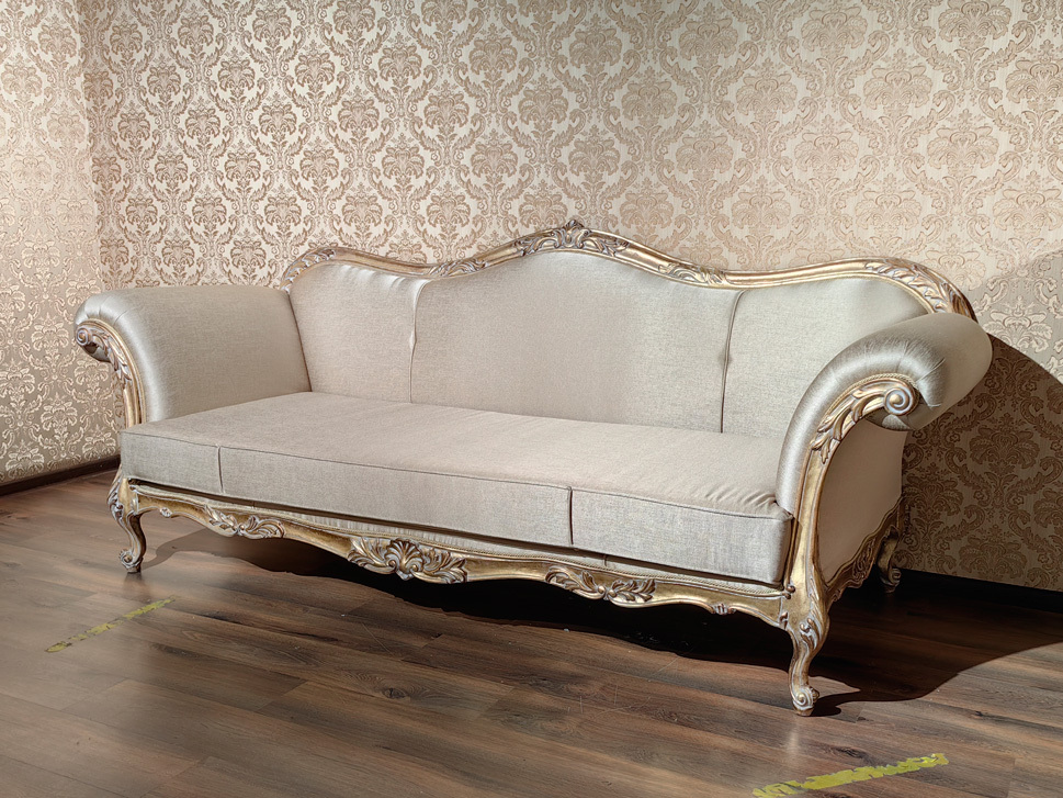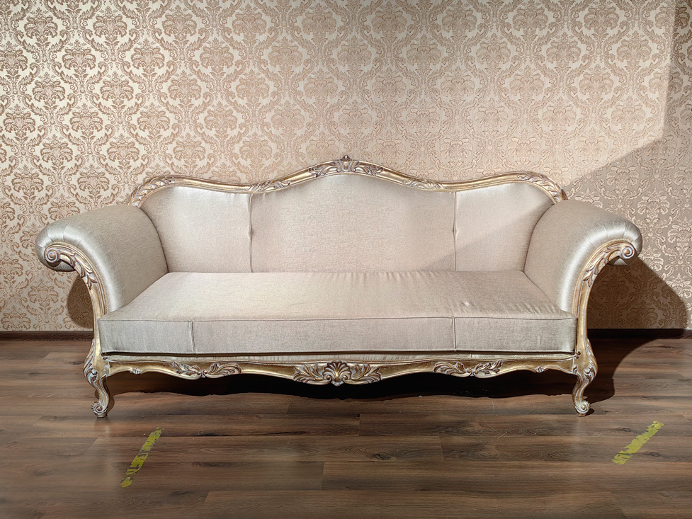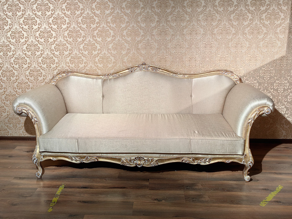 Предлагаем купить красивый, классический диван из массива бука, в золоте с комплектом кресел, журнальным и кофейным столиком. Диван - качественная реплика итальянской известной фабрики Roberto Giovanini. Размер посадочного места 185 х 79 сантиметров, что может рассматриваться как небольшое спальное место. На заказ возможны различные покраски, изменение тканей и размеров дивана. Продажа роскошных классических итальянских диванов и кресел от поставщика мебели.