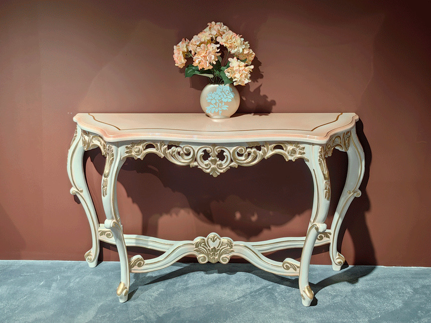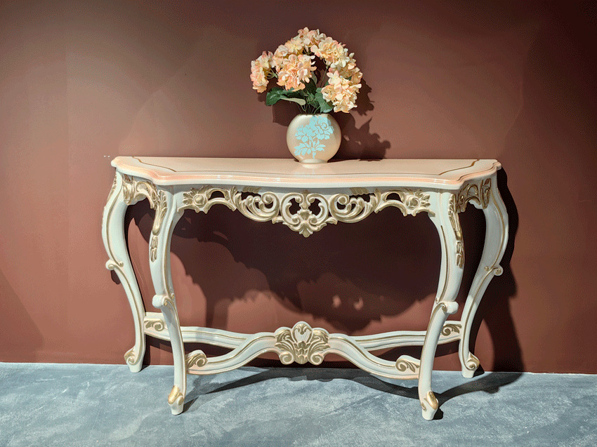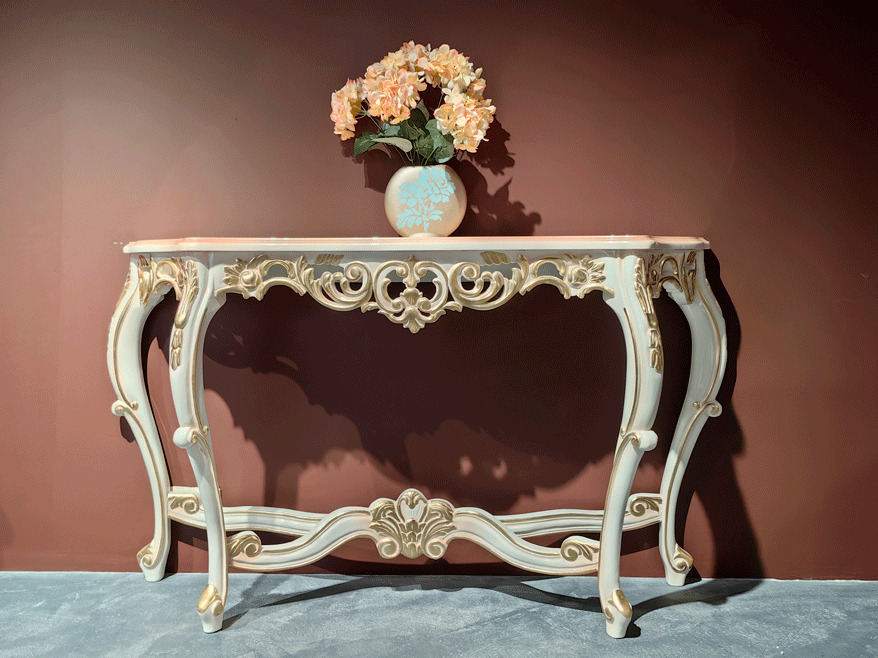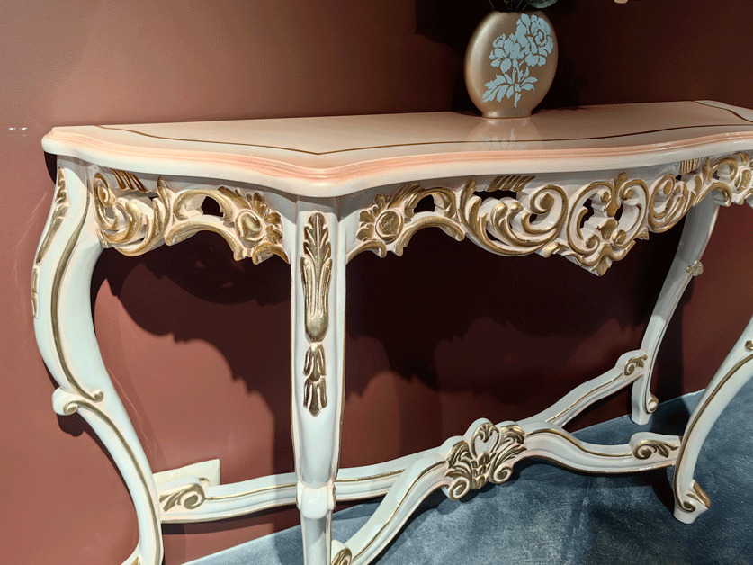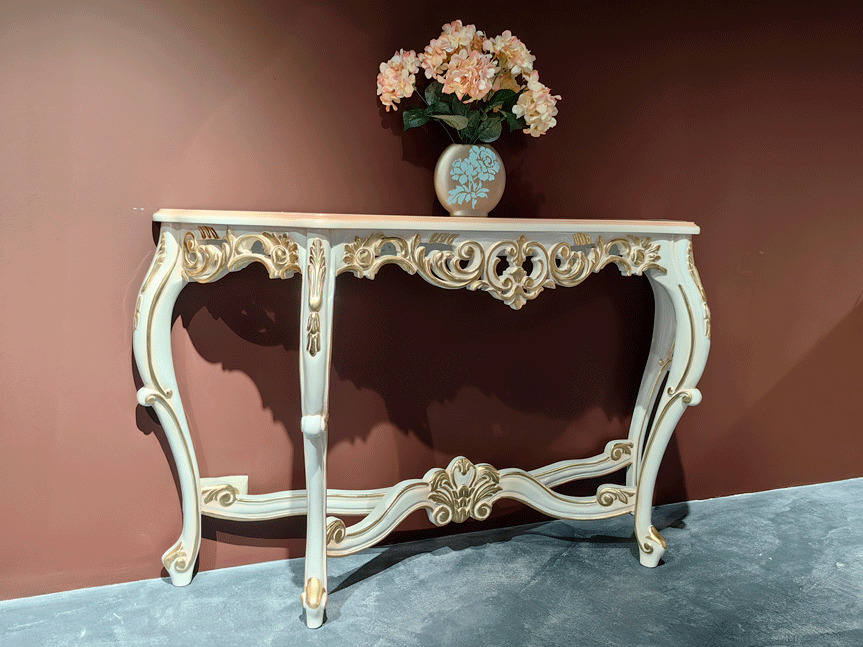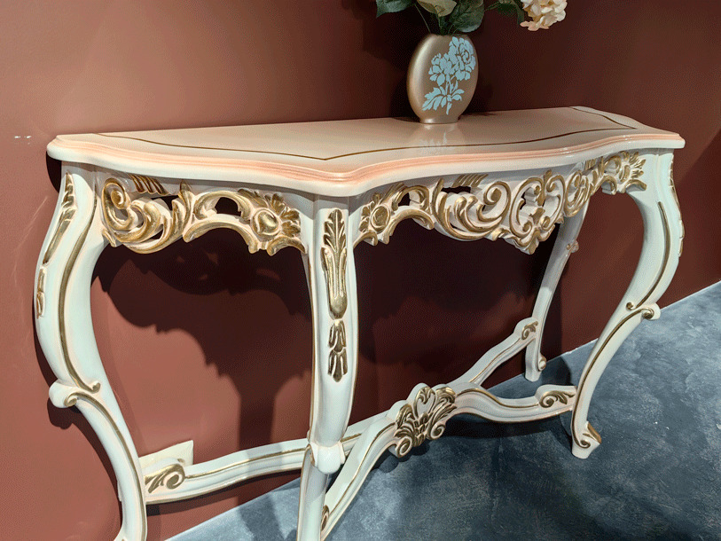 Предлагаем купить классическую консоль из массива дерева бука в цвете слоновая кость с золотой поталью. На заказ возможно изменение размера консоли, а также расцветки. Изготовление классической мебели премиум класса для прихожей на заказ: консоли, настенные зеркала, банкетки и пуфики.