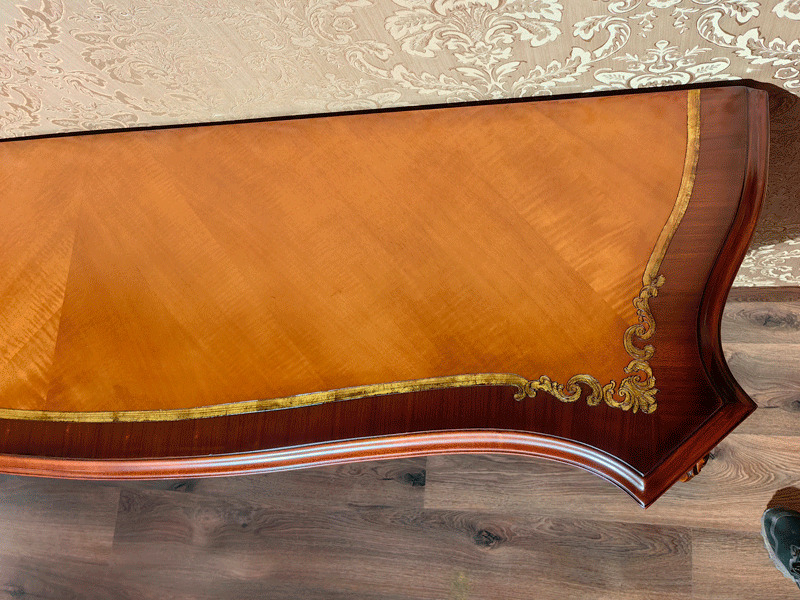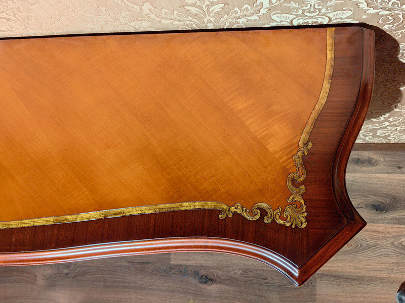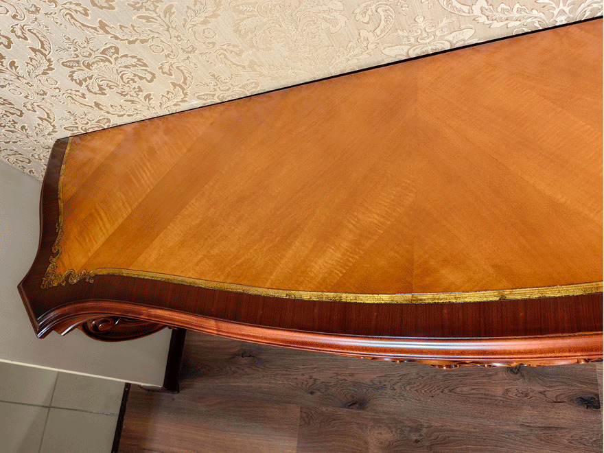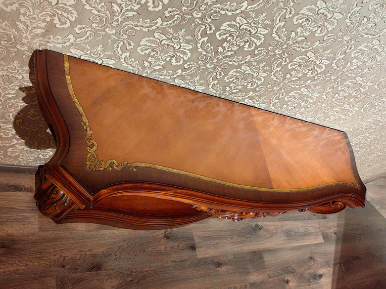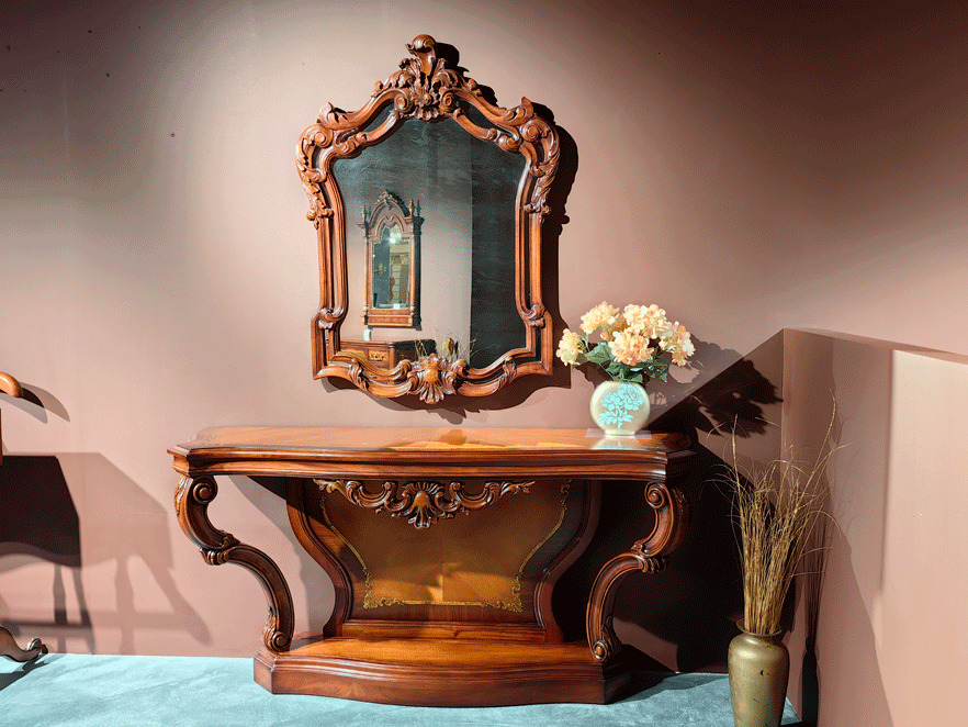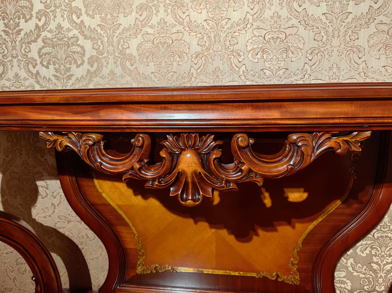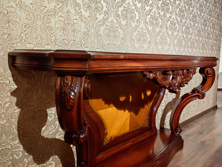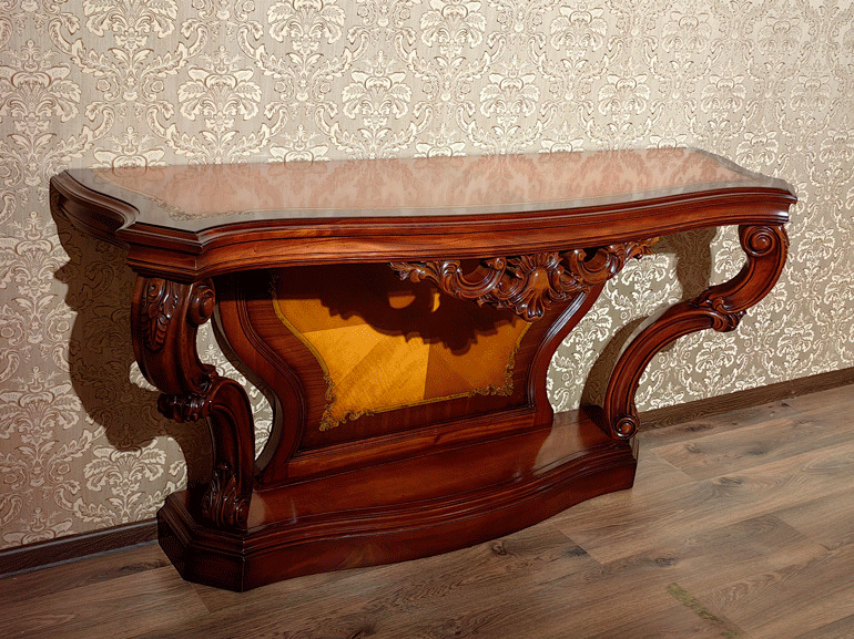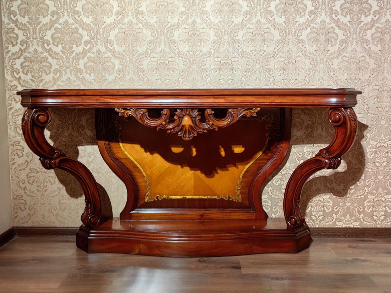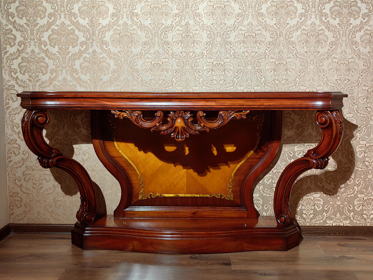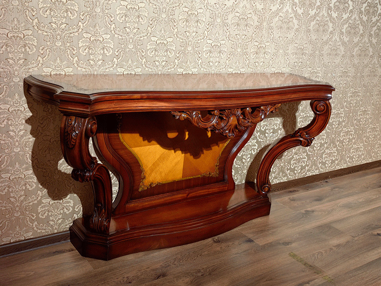 Предлагаем купить красивую классическую консоль из массива красного дерева с маркетри на столешнице. К консоли предлагаются различные настенные зеркала в этом же стиле. Ознакомьтесь с ассортиментом зеркал в разделе "настенные зеркала". Также предлагаем напольные деревянные вешалки и пуфики для прихожей. Покраска: цвет орех, морилка, патина (покраска под старину), золотая поталь антик эффект, лак с шелковистым оттенком. Исключительное качество изготовления на уровне самых престижных итальянских фабрик. Продажа классических консолей премиум класса из массива ценных пород дерева в цвете орех.