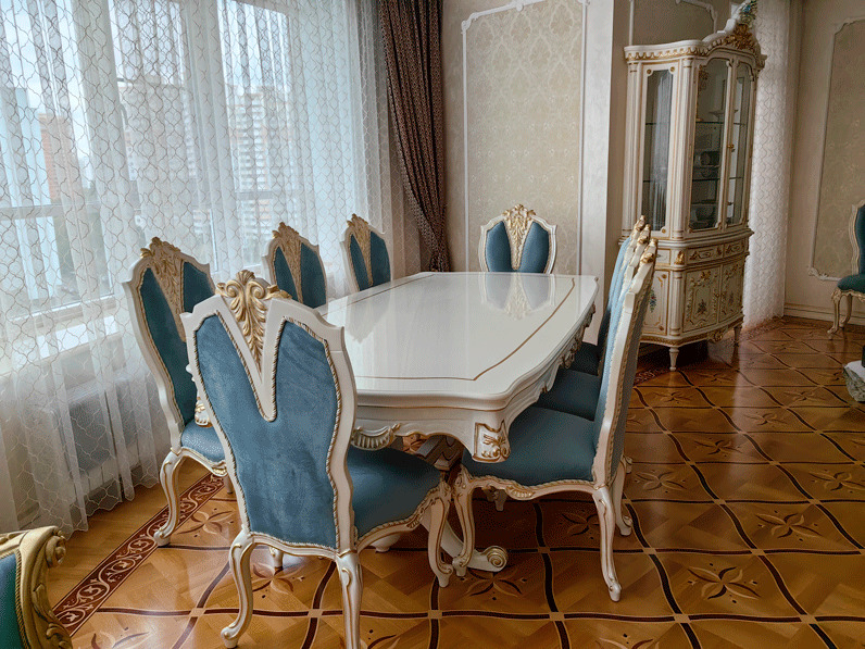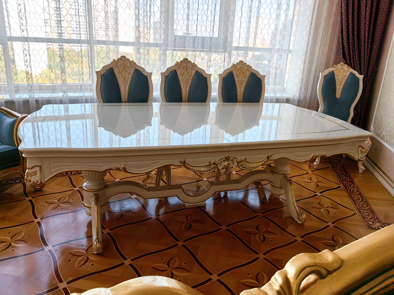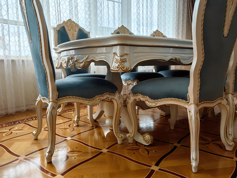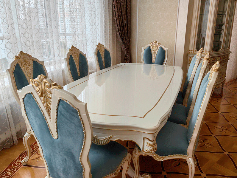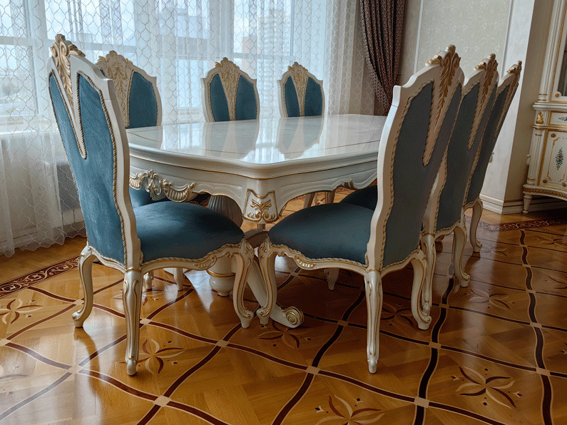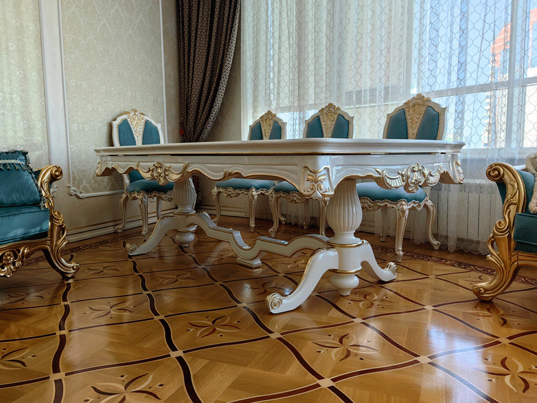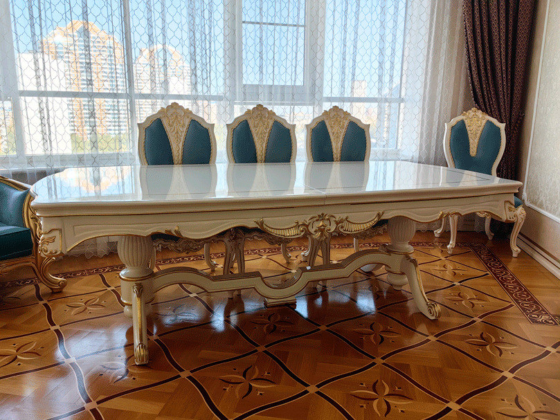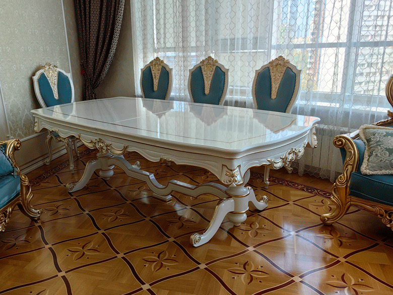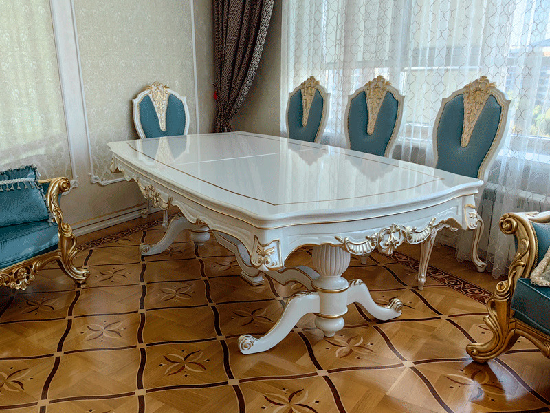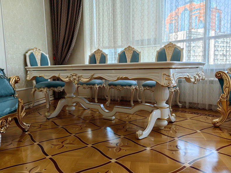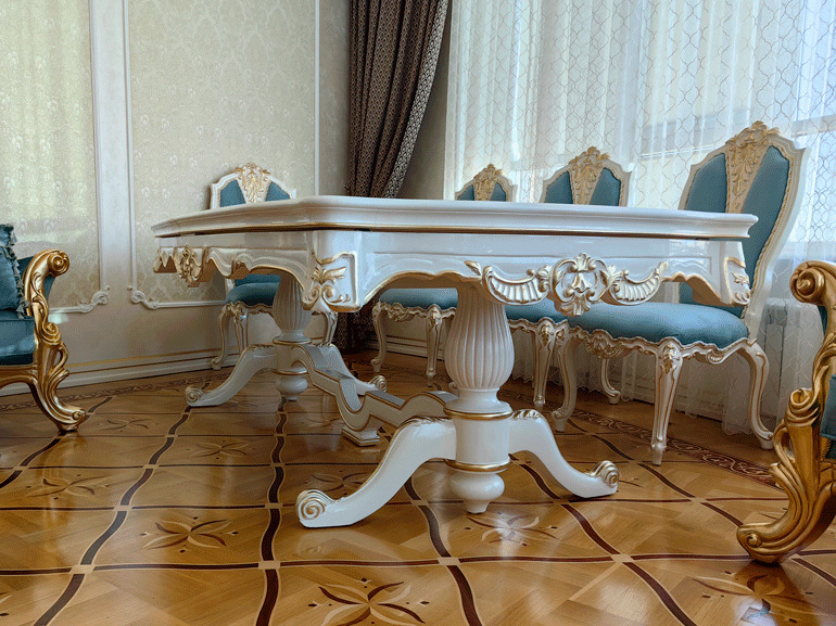 Предлагаем купить красивый, классический, белый обеденный стол из дерева со стульями с возможностью замены ткани на них. Стол базируется на едином основании, размещенном под столешницей, что очень удобно для расположения ног. Длинна столешницы, расцветка стола и стульев может быть изменена. Стол может быть изготовлен в раскладном варианте (+50 тыс к цене). К обеденной группе предлагаем также витрину и буфет для посуды, ТВ тумбу и мягкую мебель для гостиной премиум класса от поставщика мебели. Продажа красивой, дорогой классической мебели в золоте для гостиных.