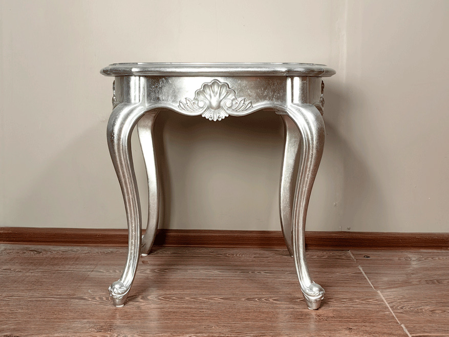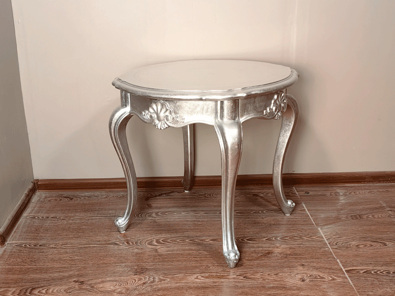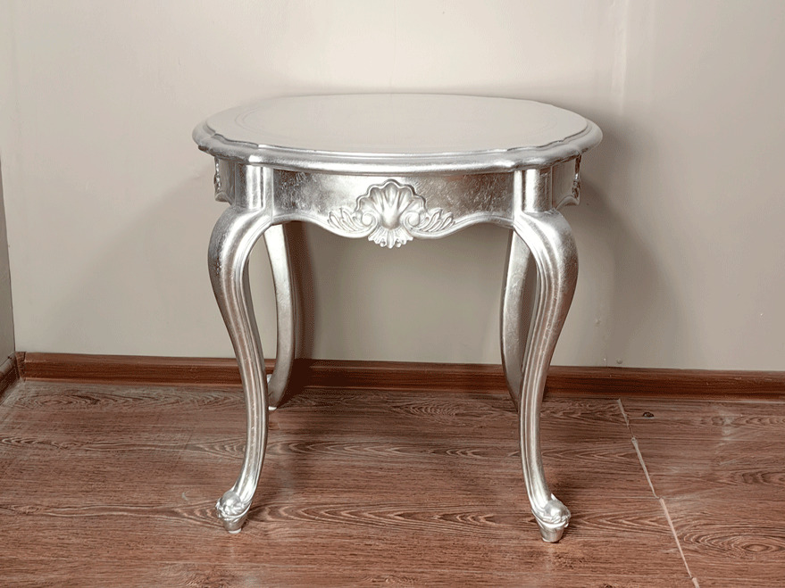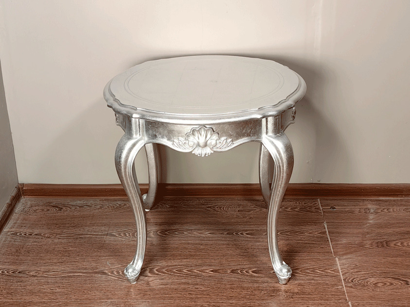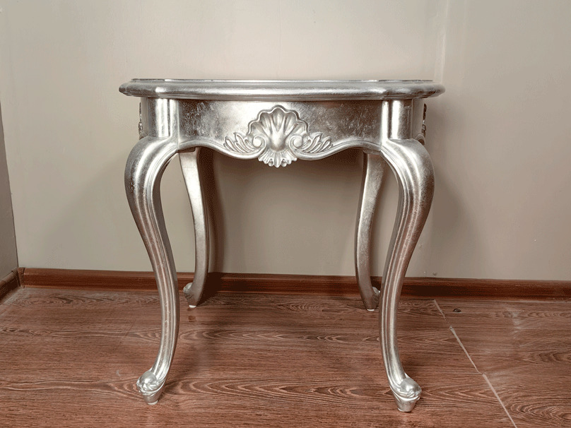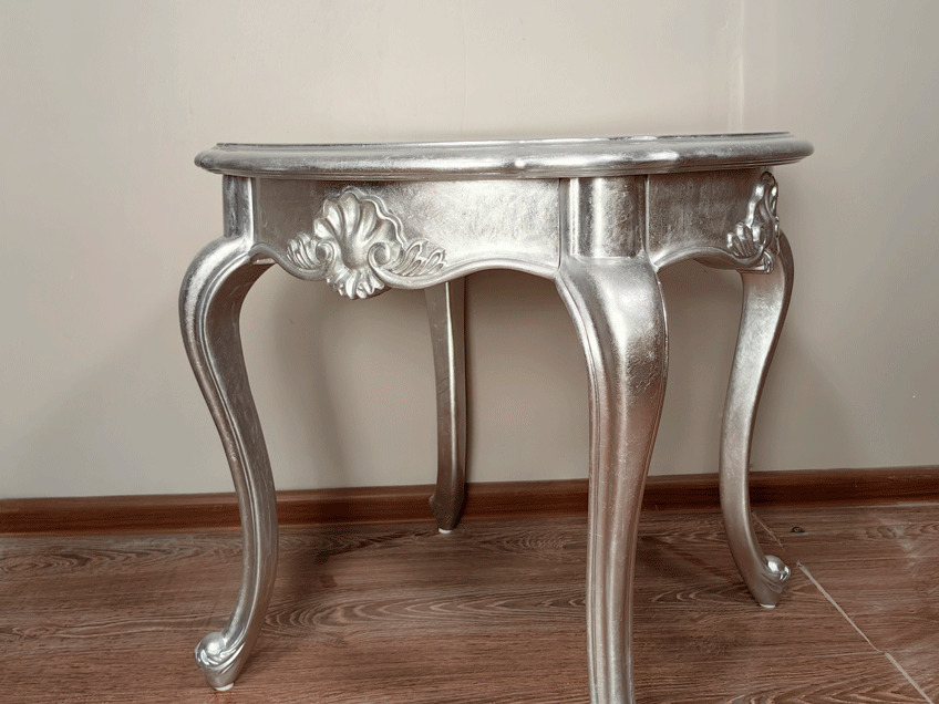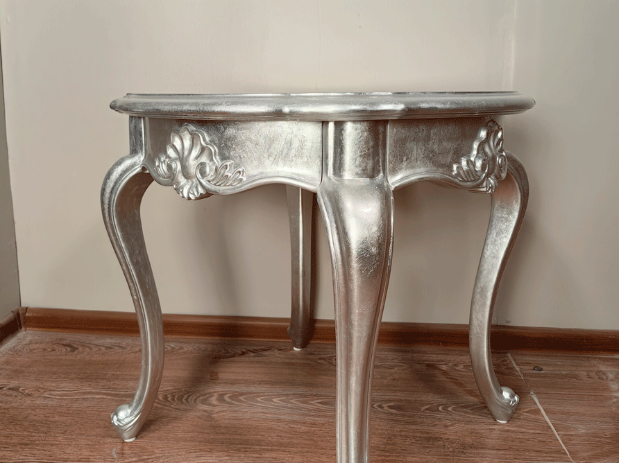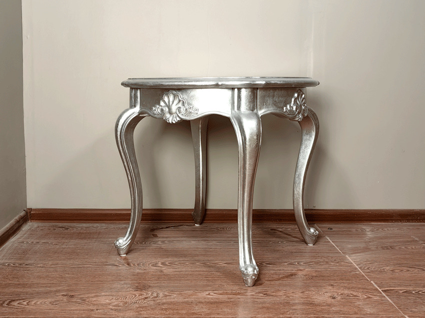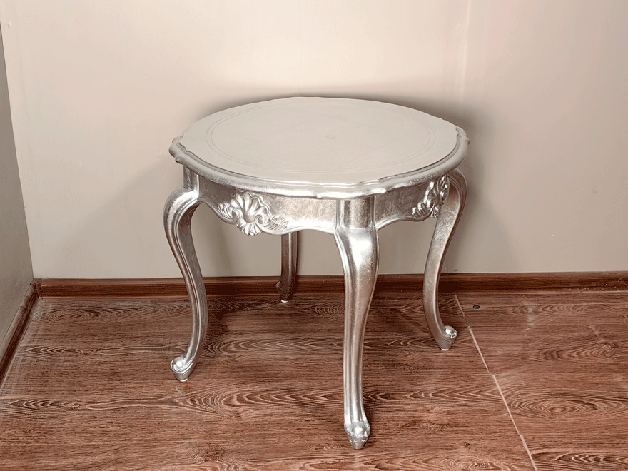 Предлагаем купить красивый, классический, круглый столик на гнутых ножках, из дерева, в серебряной потали и глянцевом лаке в мебельном салоне. Мебель безупречного уровня качества. Материалы: массив красного дерева. Блеск поверхности - высоко глянцевый. Наиболее удачное место для размещения кофейных столиков - сбоку от дивана (в качестве приставного столика), или в кофейной группе между двумя креслами. Продажа классической мебели премиум класса из дерева в серебре.