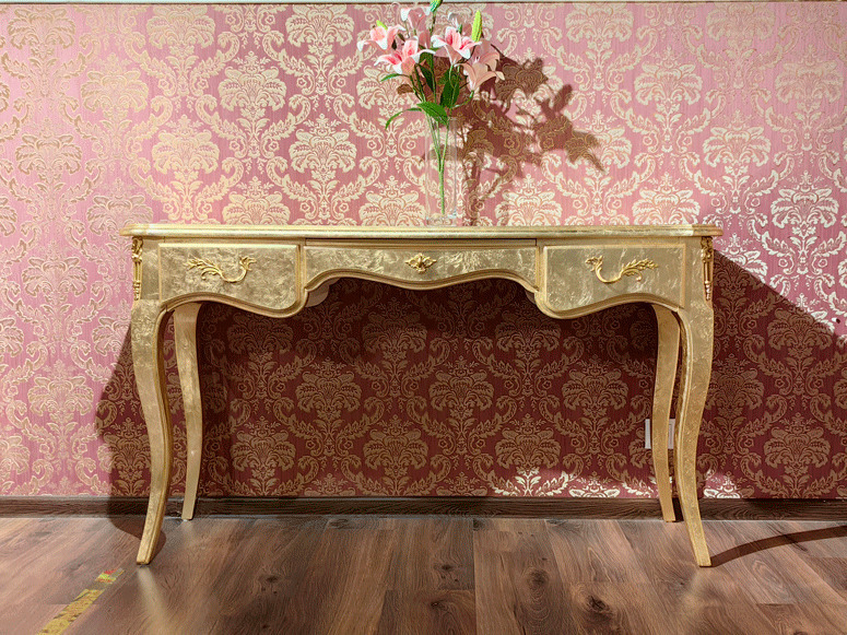Предлагаем купить красивую, золотую консоль неоклассика с тремя выдвижными ящиками. Консоль выполнена из массива красного дерева и также может быть использована в качестве трюмо. Продажа красивой золотой мебели неоклассика. Предмет требует сборки. Консоль выложена золотой поталью и покрыта глянцевым лаком. Продажа красивой, золотой неоклассической мебели.