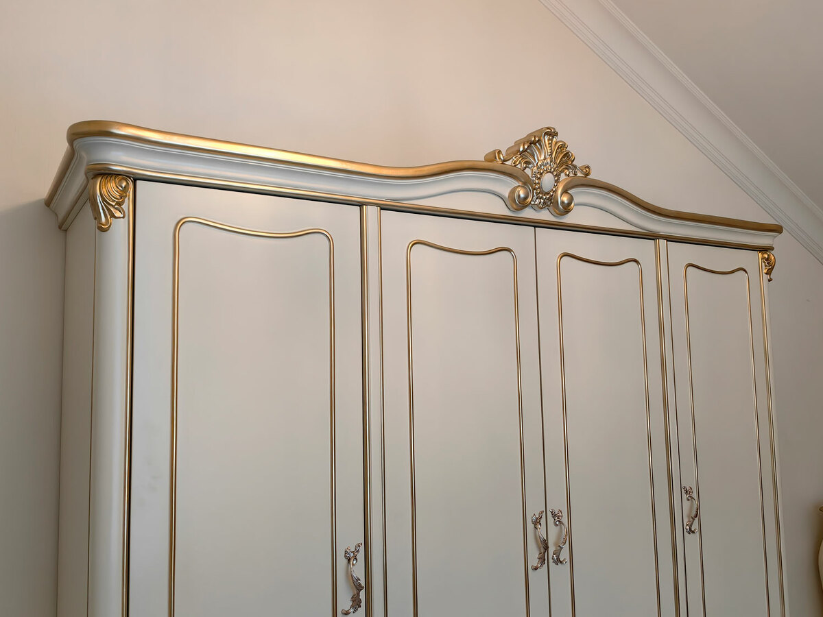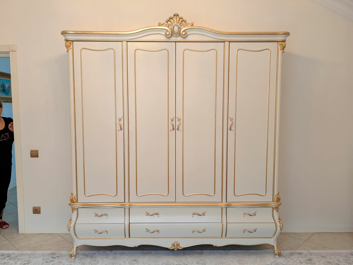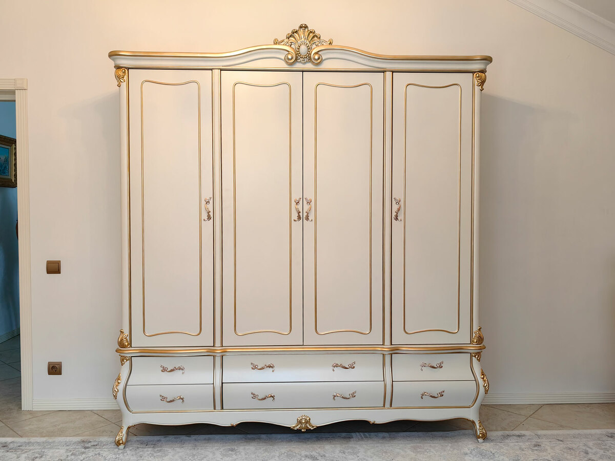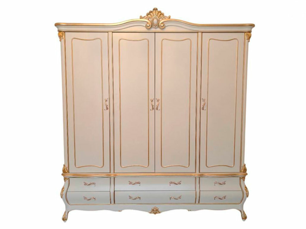 Предлагаем купить красивый платяной шкаф классика, из дерева, 4х дверный в выпуклых, фигурных формах. Материалы - массив дерева бука, МДФ, эмаль цвета слоновой кости, золото - по резьбе. Также возможно нанесение эффекта старения по резьбе (патины различных цветов). Блеск поверхности - шелковистый. Петли и ящики с современными доводчиками. Дно ящиков оббито бархатом. В этой коллекции также имеются другие платяные шкафы и мебель для спальни: двуспальные кровати, прикроватные тумбочки, комоды, туалетный стол. Мебель высокого уровня качества. Продажа красивой, белой классической мебели премиум класса из дерева.