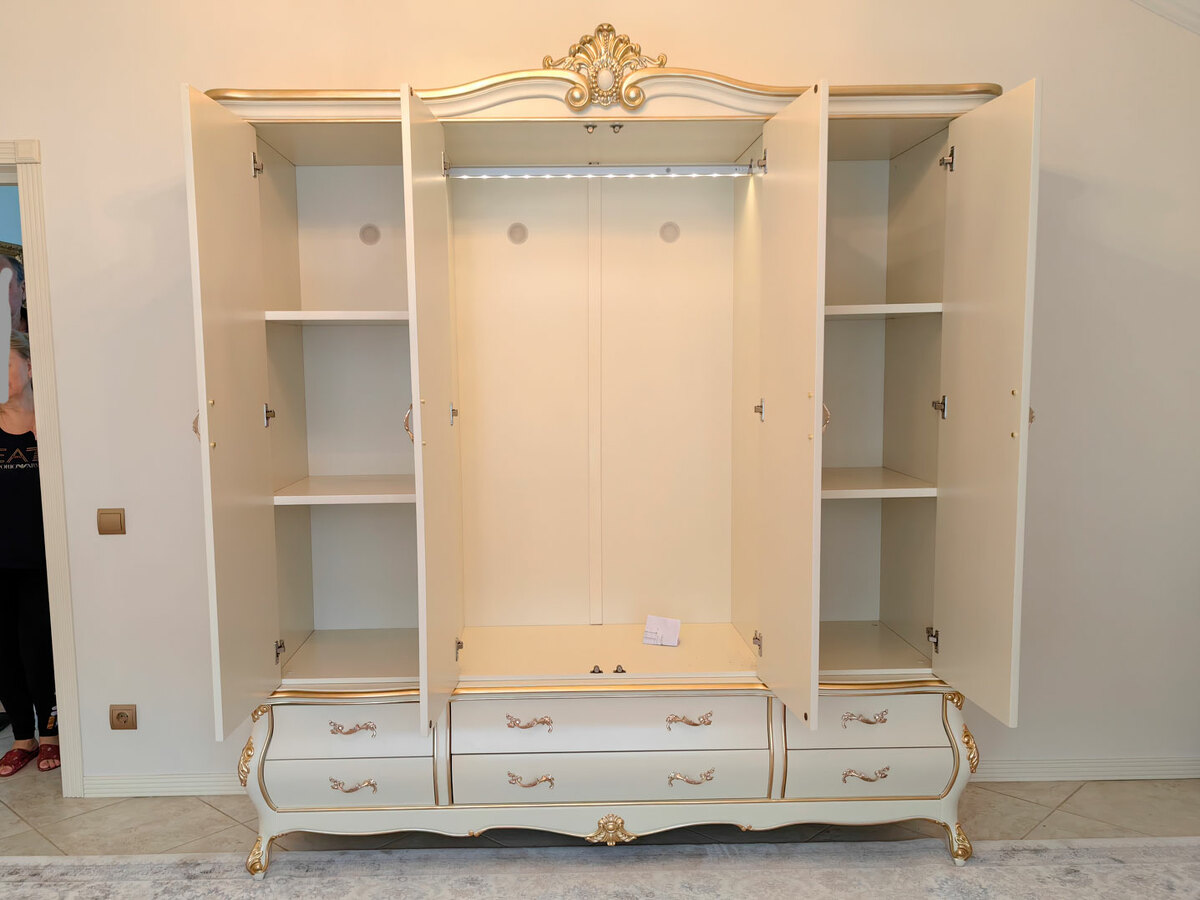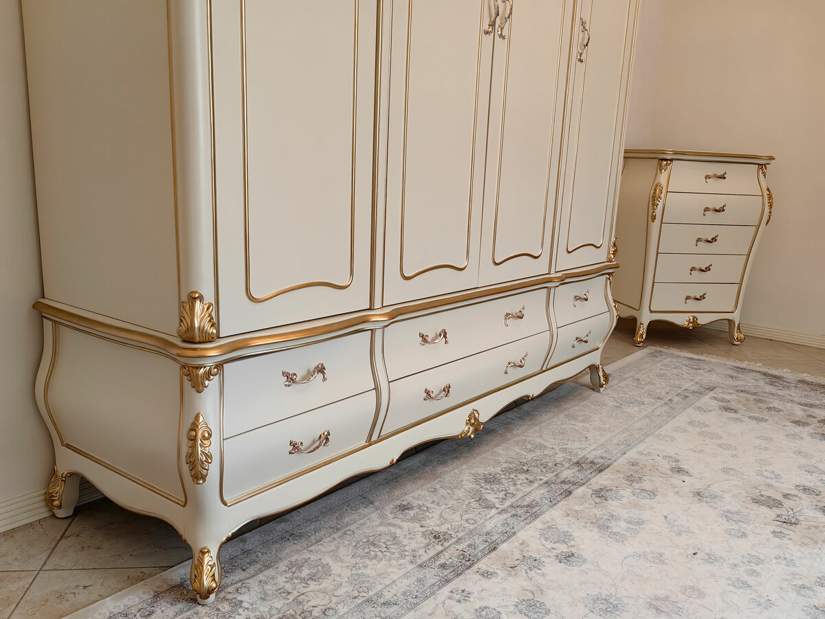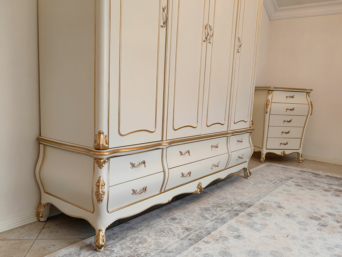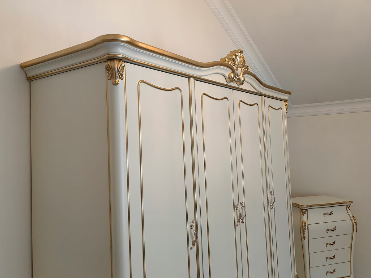Предлагаем купить красивый платяной шкаф классика, из дерева, 4х дверный в выпуклых, фигурных формах. Материалы - массив дерева бука, МДФ, эмаль цвета слоновой кости, золото - по резьбе. Также возможно нанесение эффекта старения по резьбе (патины различных цветов). Блеск поверхности - шелковистый. Петли и ящики с современными доводчиками. Дно ящиков оббито бархатом. В этой коллекции также имеются другие платяные шкафы и мебель для спальни: двуспальные кровати, прикроватные тумбочки, комоды, туалетный стол. Мебель высокого уровня качества. Продажа красивой, белой классической мебели премиум класса из дерева.