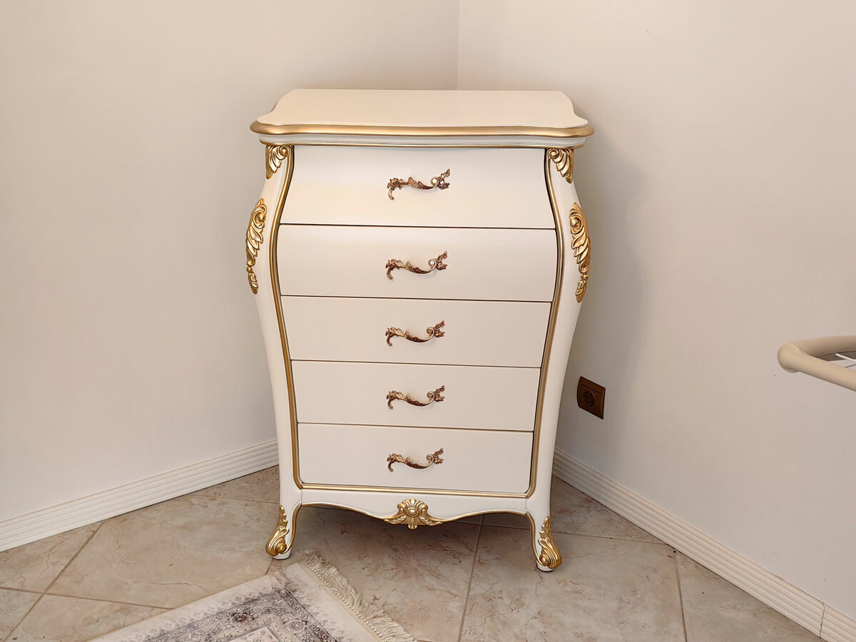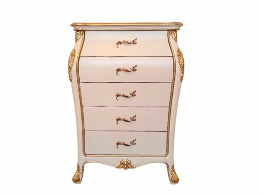 Предлагаем купить красивый высокий, узкий, классический комод из массива дерева для спальни в мебельном салоне. Материалы - массив дерева бука, МДФ, эмаль цвета слоновой кости, золото по резьбе, а также возможно нанесение эффекта старения по резьбе (патины различных цветов). Блеск поверхности - шелковистый. Ящики с современными доводчиками. Дно ящиков оббито бархатом. Мебель высокого уровня качества. В этой коллекции также есть еще один комод с шестью ящиками. Он ниже и шире. А также имеется другая мебель для спальни: различные двуспальные кровати, туалетный стол, прикроватные банкетки и платяные шкафы. Продажа красивой белой классической мебели премиум класса, комоды.