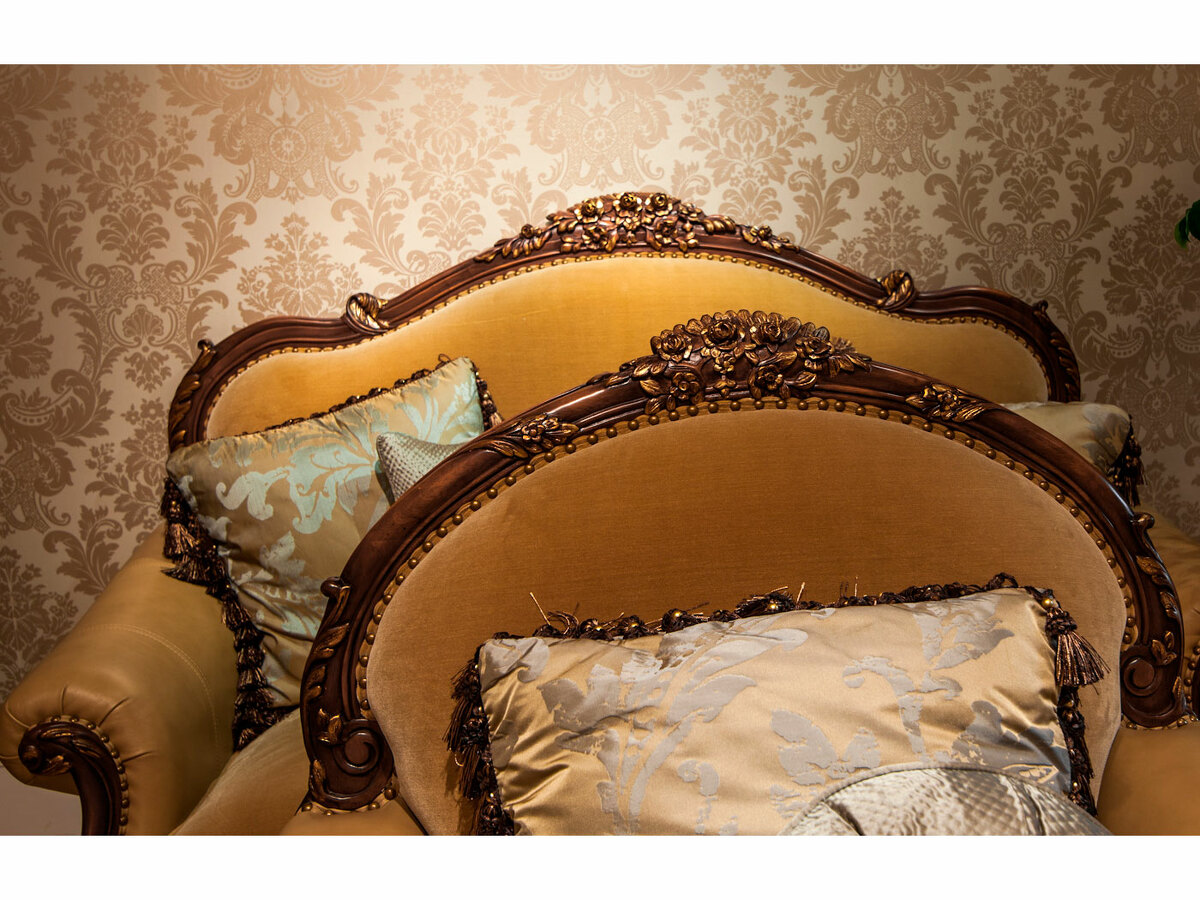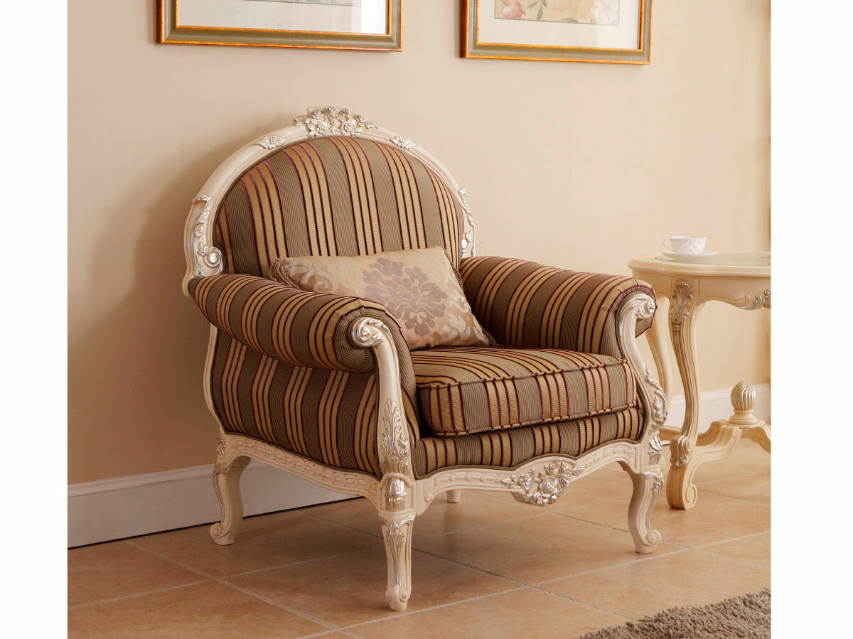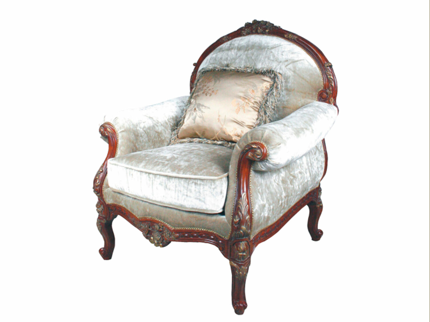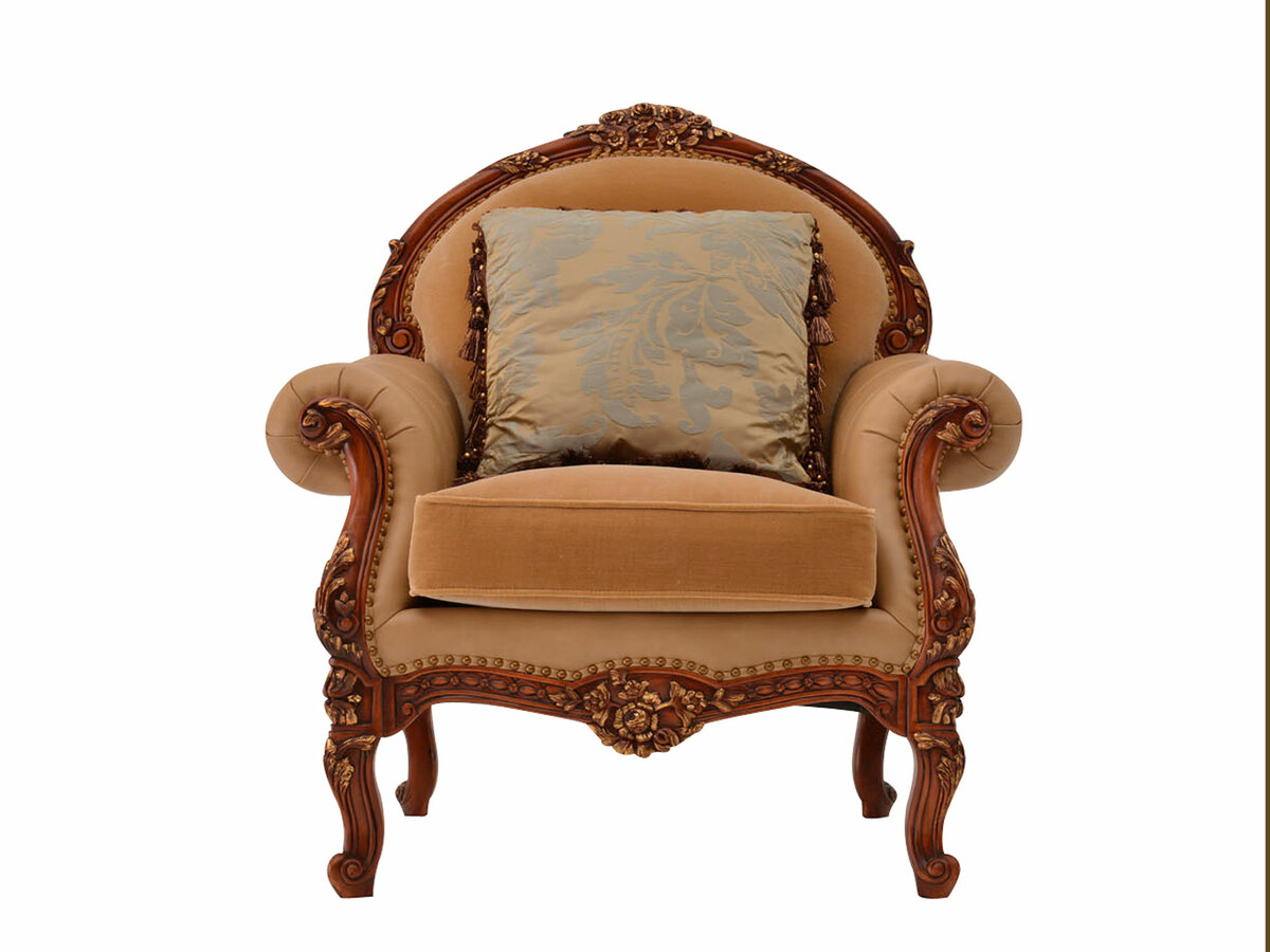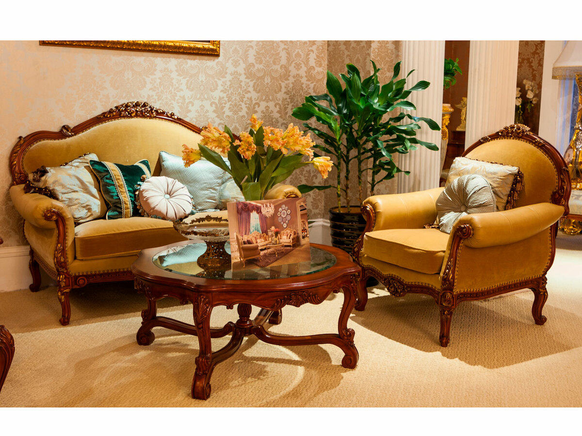 Предлагаем купить роскошное классическое кресло из массива красного дерева в цвете орех, античное золото или античная бронза. Также кресло может быть покрашено в цвете слоновой кости. На заказ возможен подбор тканей. Кресло входит в комплект мягкой мебели с двух и трех местным диваном. Есть журнальный и кофейные столы. Продажа классической мягкой мебели премиум класса из дерева.