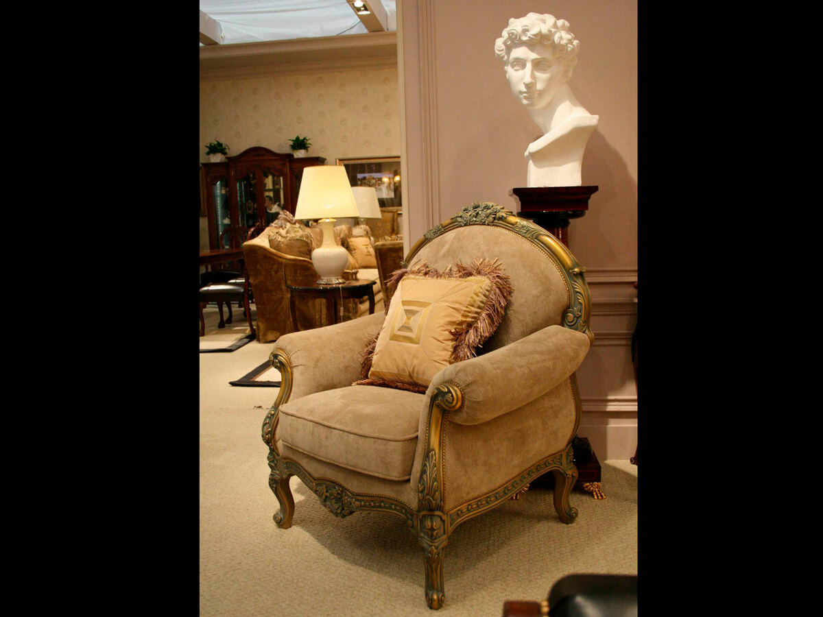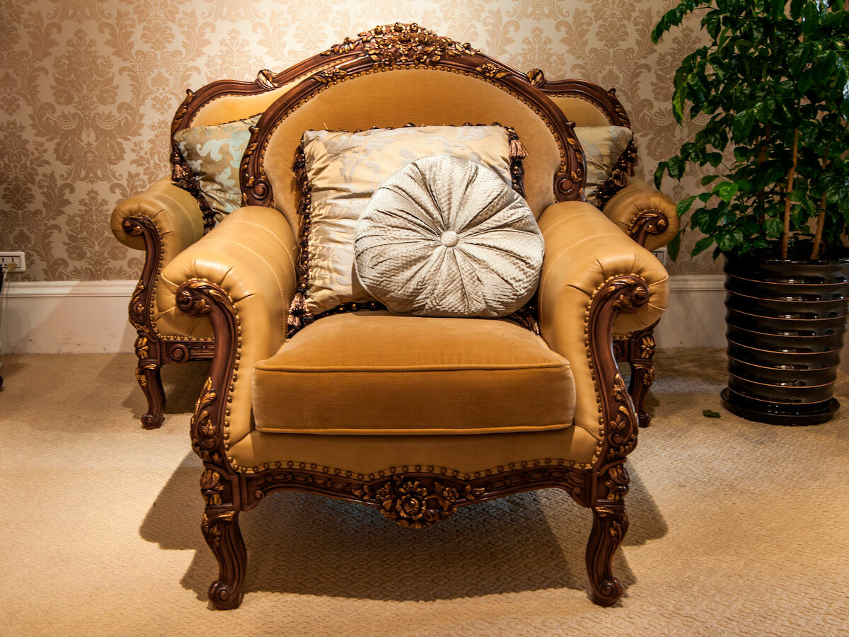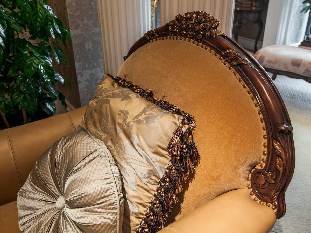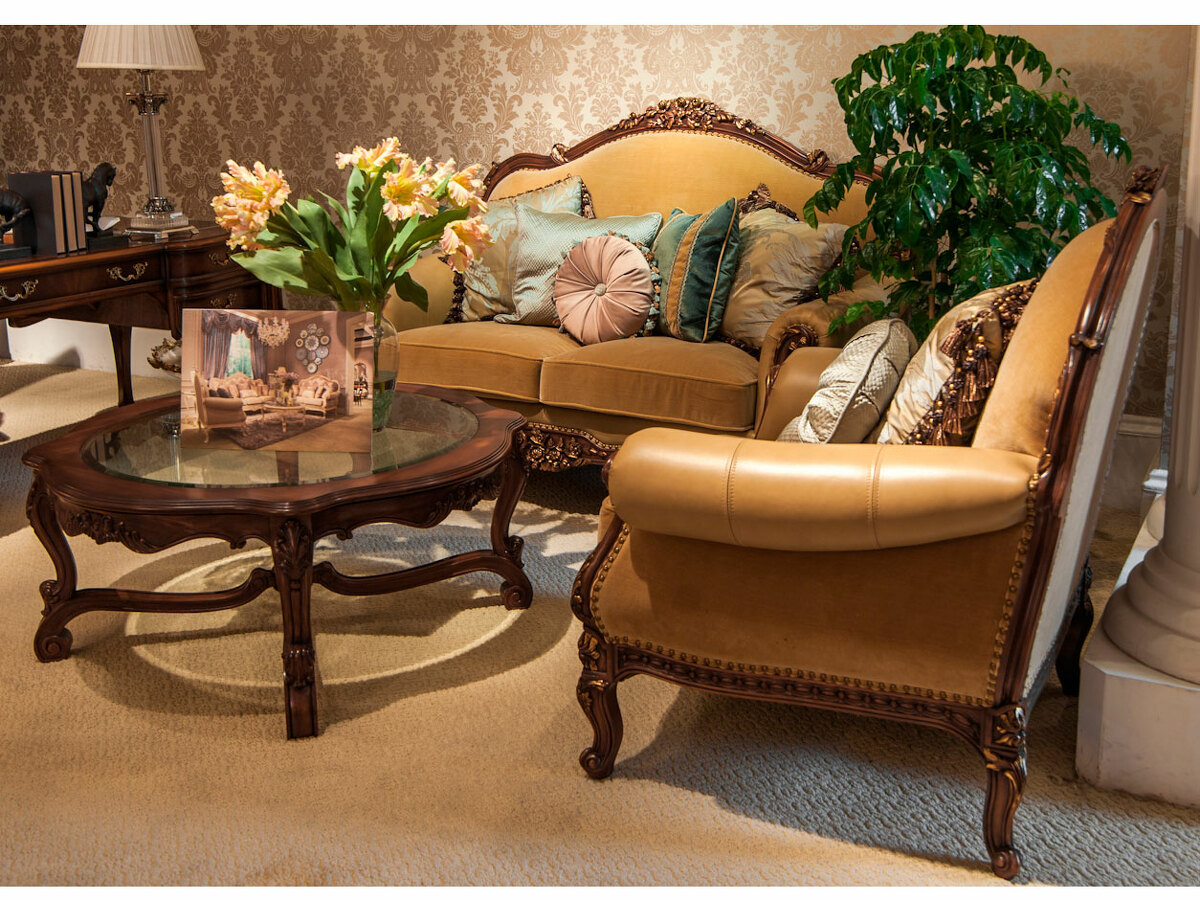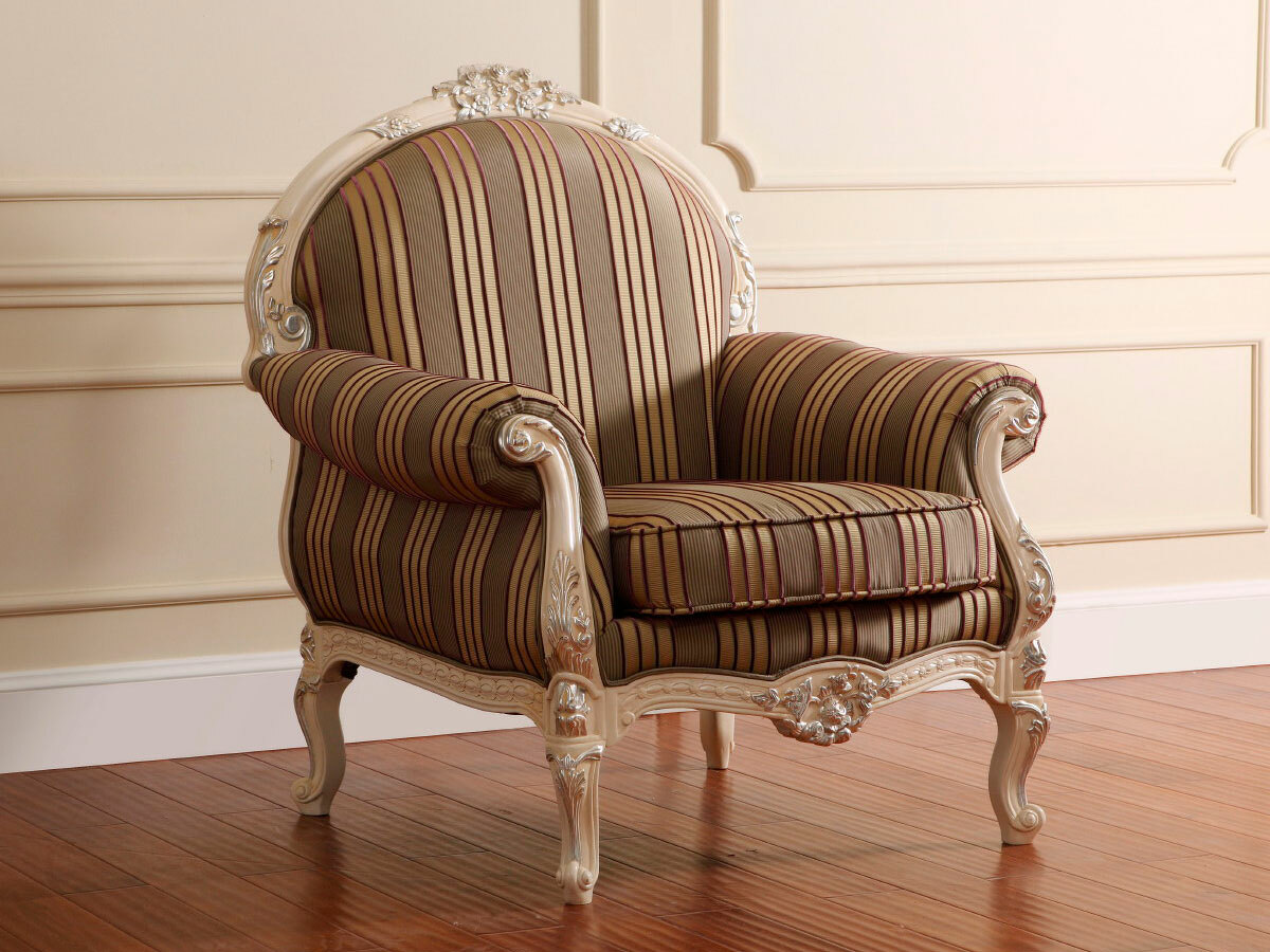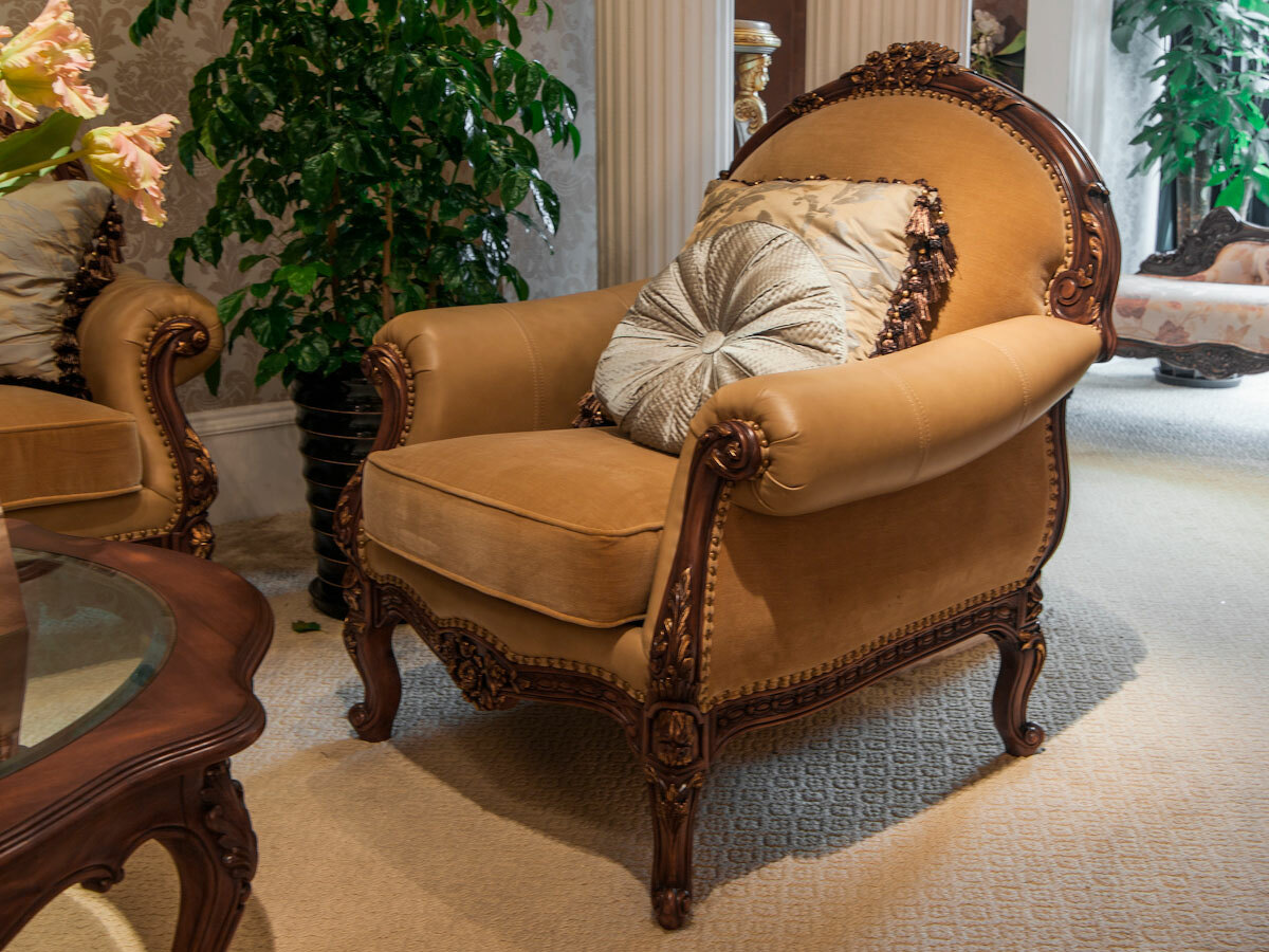 Предлагаем купить роскошное классическое кресло из массива красного дерева в цвете орех, античное золото или античная бронза. Также кресло может быть покрашено в цвете слоновой кости. На заказ возможен подбор тканей. Кресло входит в комплект мягкой мебели с двух и трех местным диваном. Есть журнальный и кофейные столы. Продажа классической мягкой мебели премиум класса из дерева.