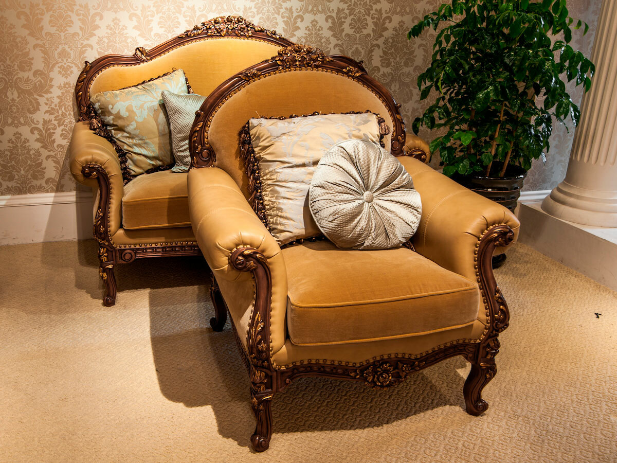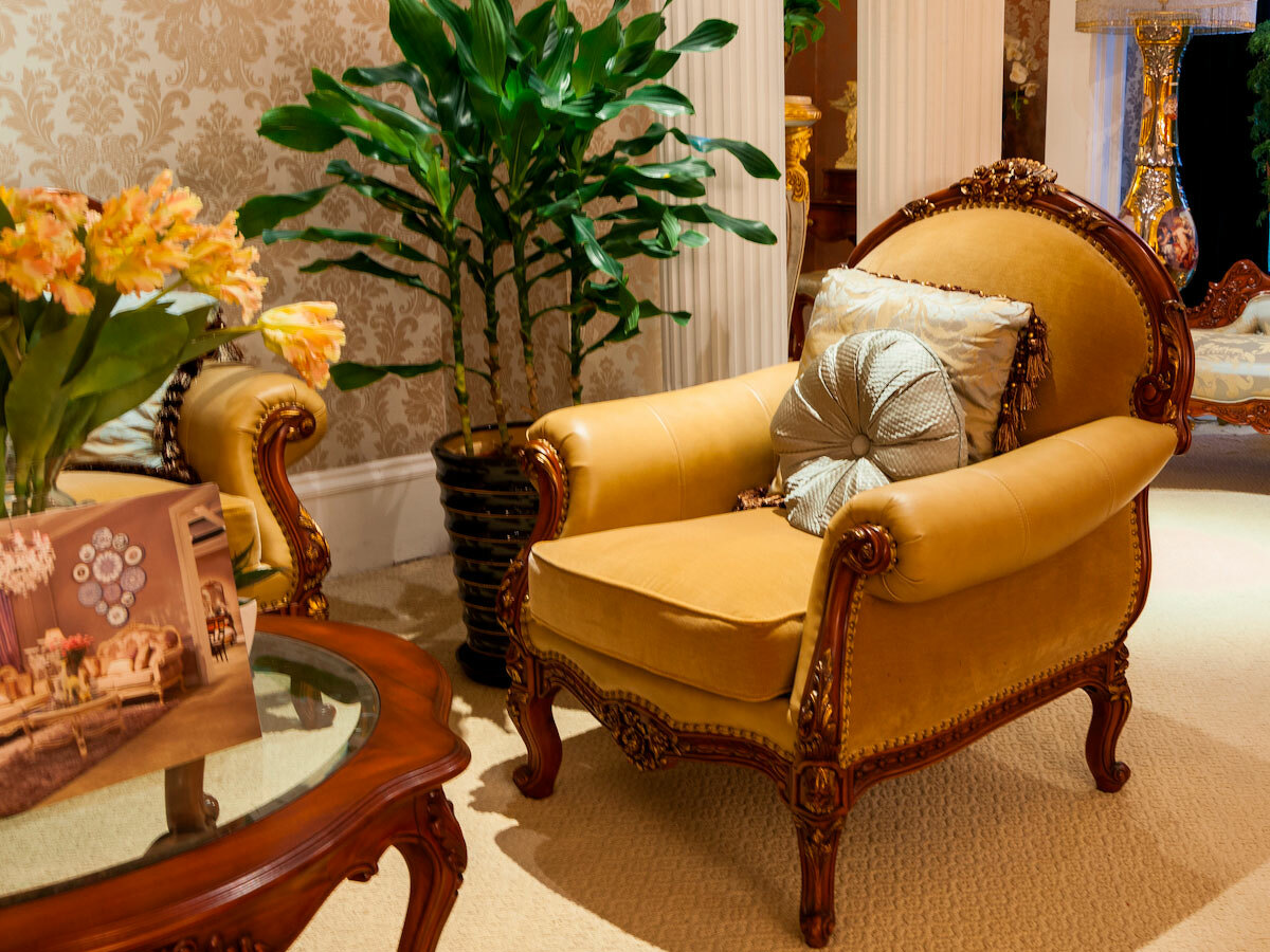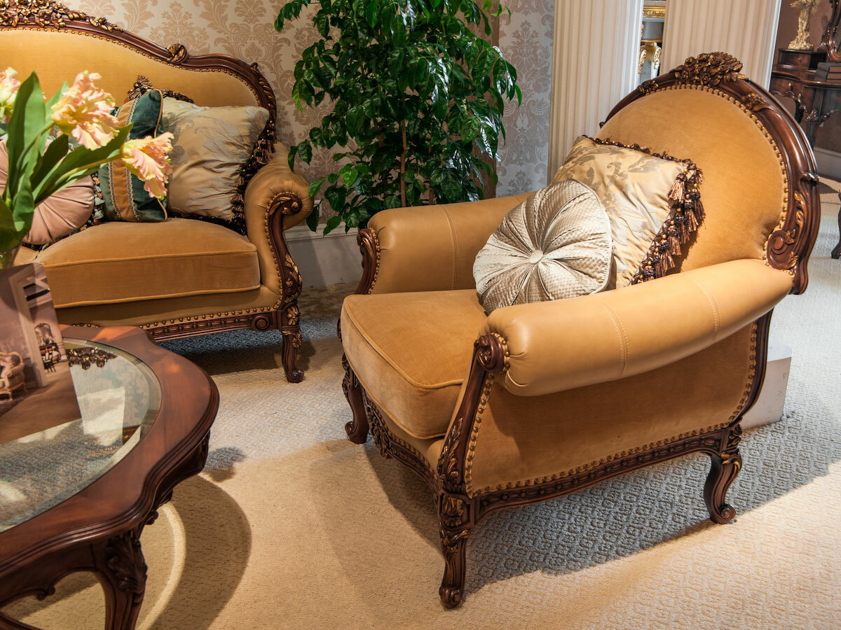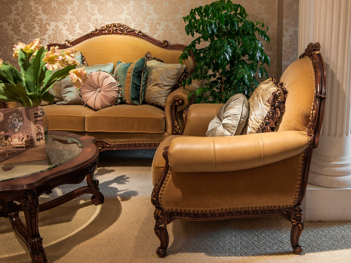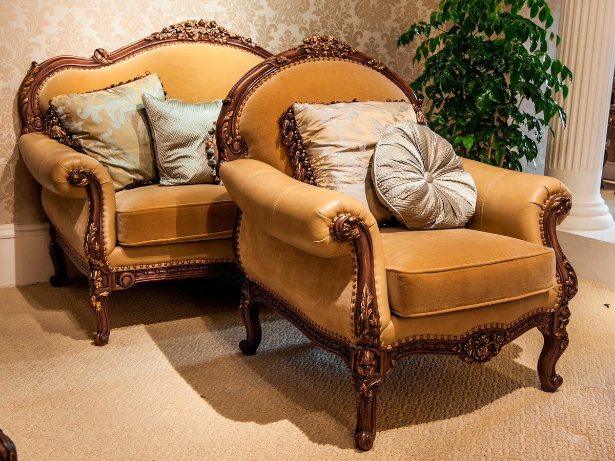 Предлагаем купить роскошное классическое кресло из массива красного дерева в цвете орех, античное золото или античная бронза. Также кресло может быть покрашено в цвете слоновой кости. На заказ возможен подбор тканей. Кресло входит в комплект мягкой мебели с двух и трех местным диваном. Есть журнальный и кофейные столы. Продажа классической мягкой мебели премиум класса из дерева.