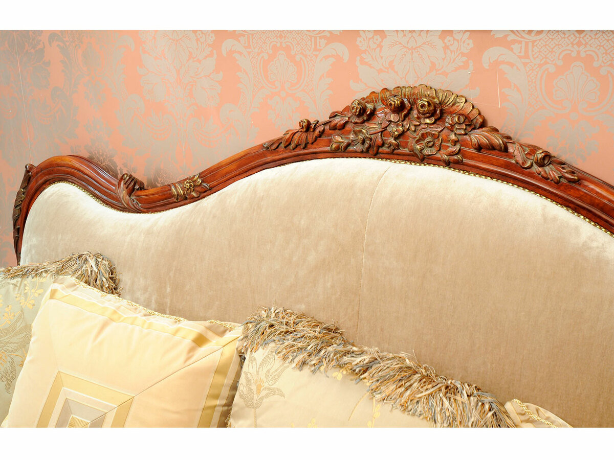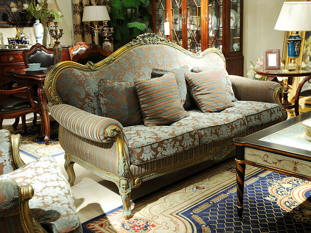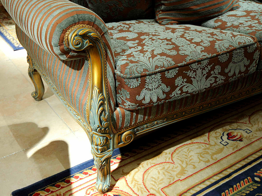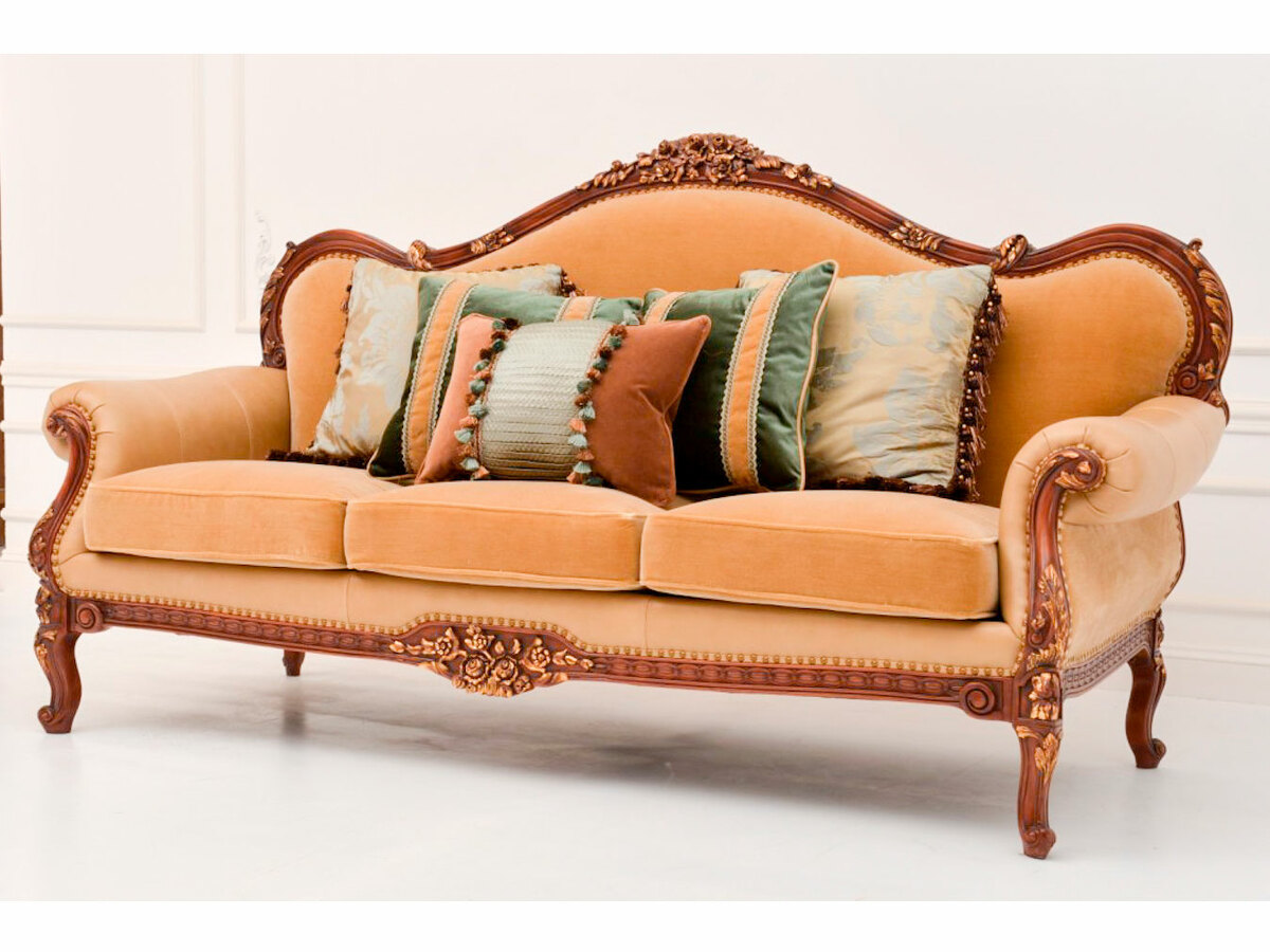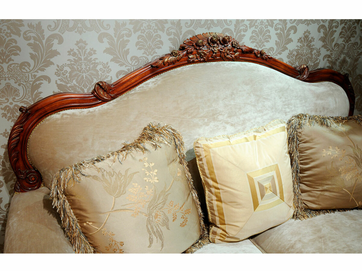Предлагаем купить роскошный, не большой, классический трех местный диван из массива красного дерева в цвете орех с патиной. Также возможна покраска в цвет античной бронзы, античного золота и слоновой кости с выделением резьбы серебряной или золотой поталью. Премиальное качество изготовления (лучшая фабрика Китая по классической мебели). В данный комплект мягкой мебели также входят 2 вида кресел, подставка для ног и трех местный диван, а также журныльный и кофейные столы. Продажа классической мягкой мебели премиум класса.