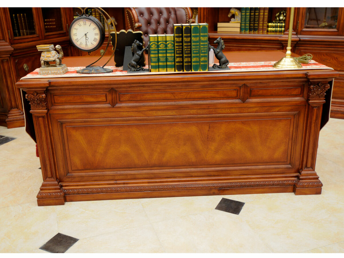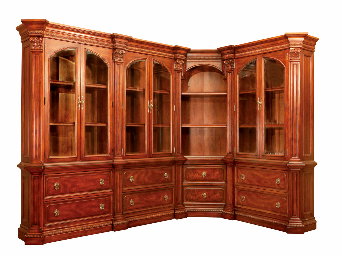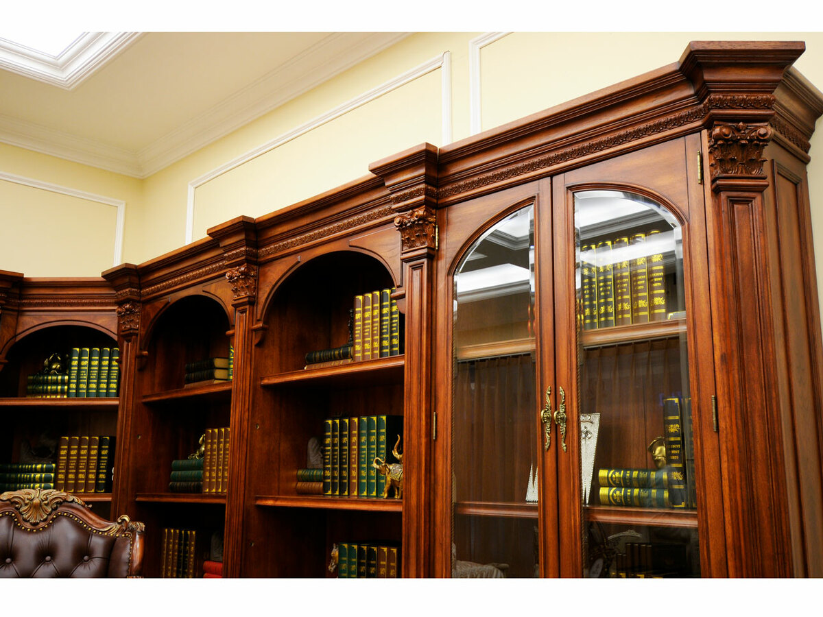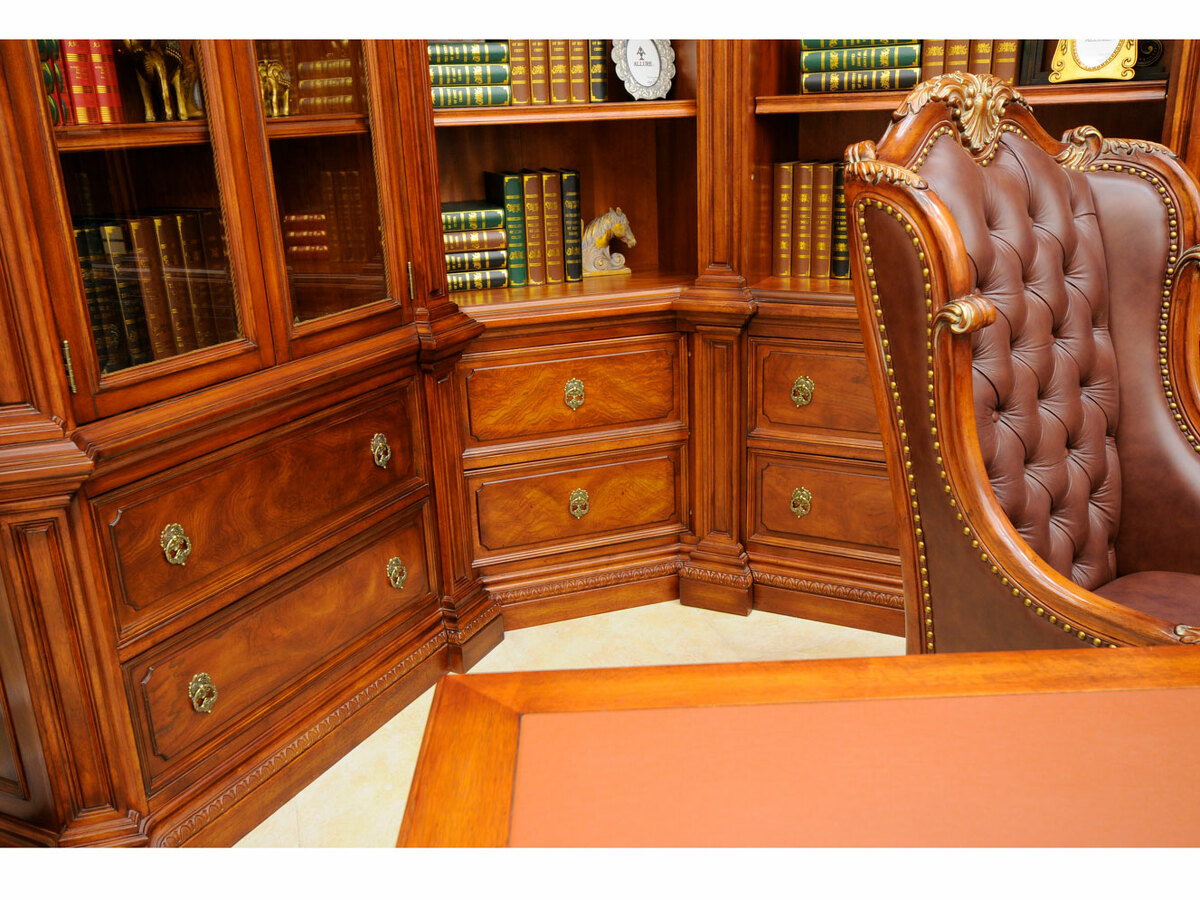 Предлагаем купить комплект классической мебели для кабинета в английском стиле из массива дерева. в комплект мебели входят книжные шкафы высотой 223 сантиметра, которые соединяются между собой колоннами, большой письменный стол 180 х 90, малый письменный стол 120 х 60, круглы й угловой соединительный элемент и различные кресла для кабинета. Исключительное качество изготовления. Продажа классических кабинетов премиум класса из массива дерева ценных пород.