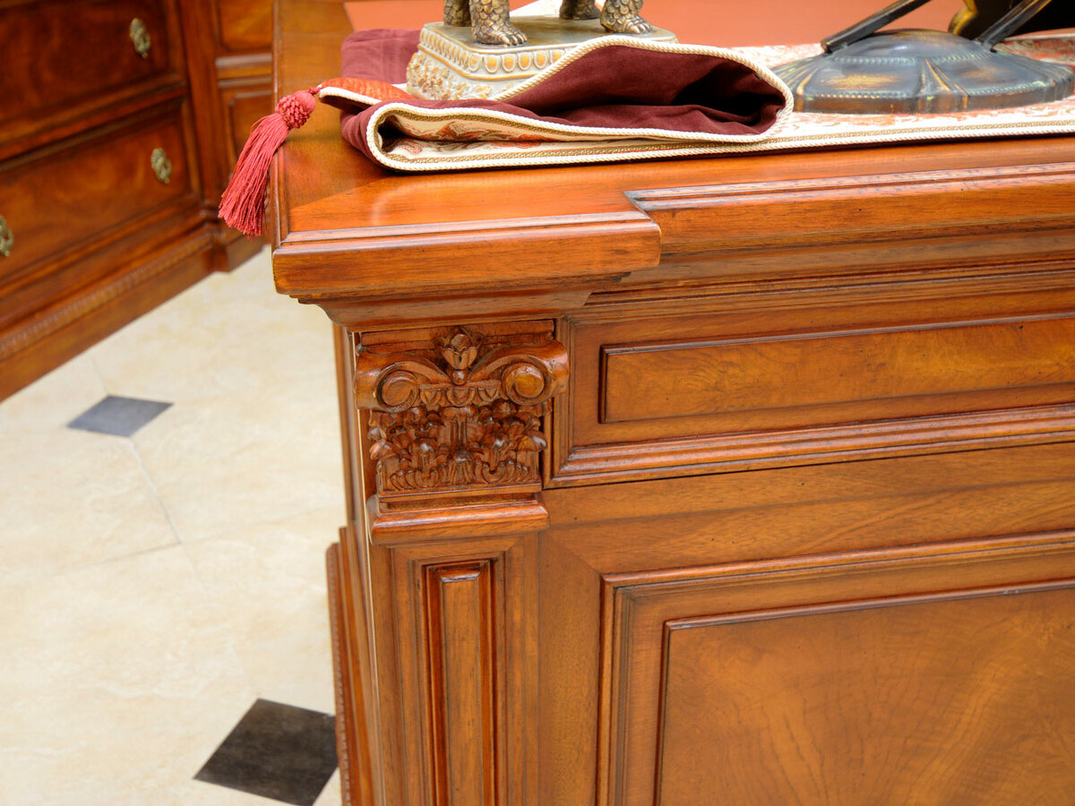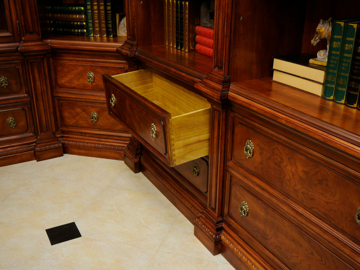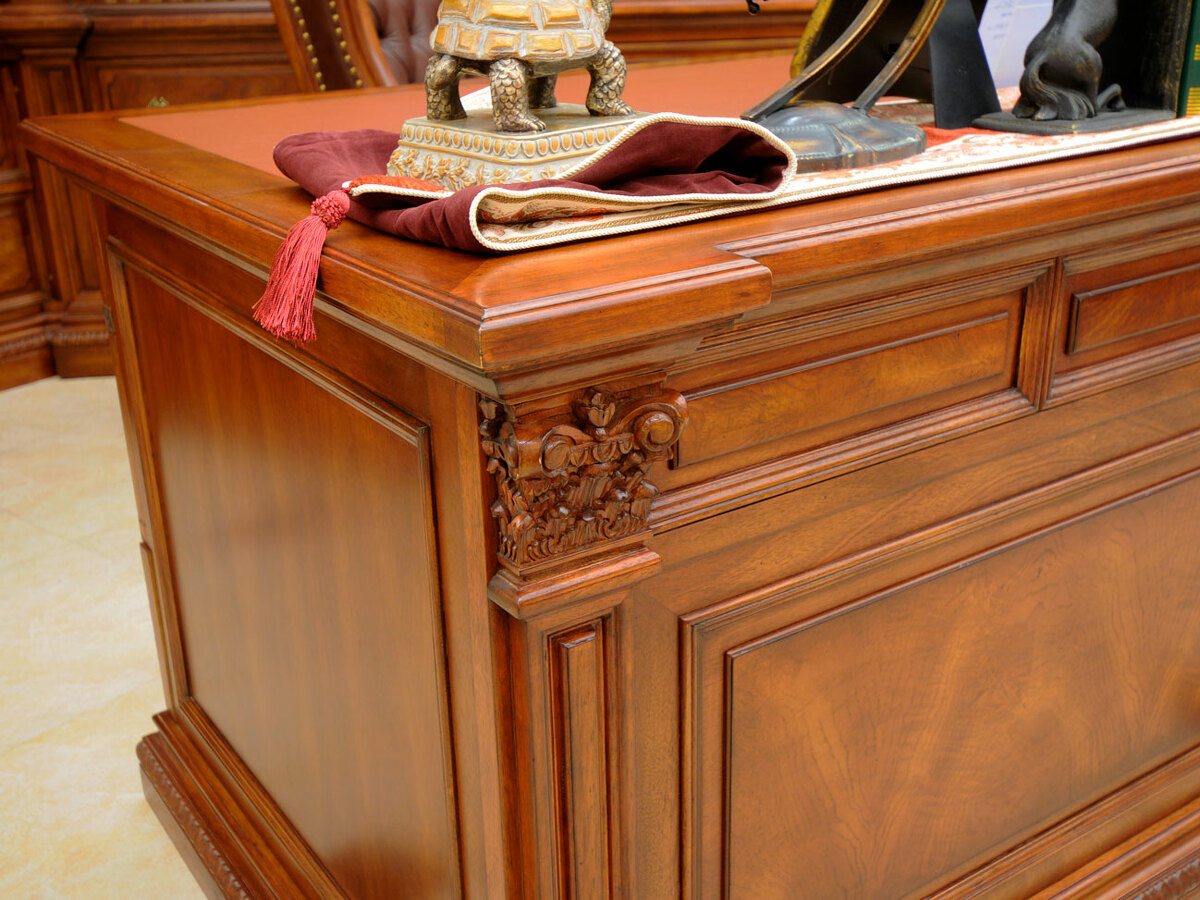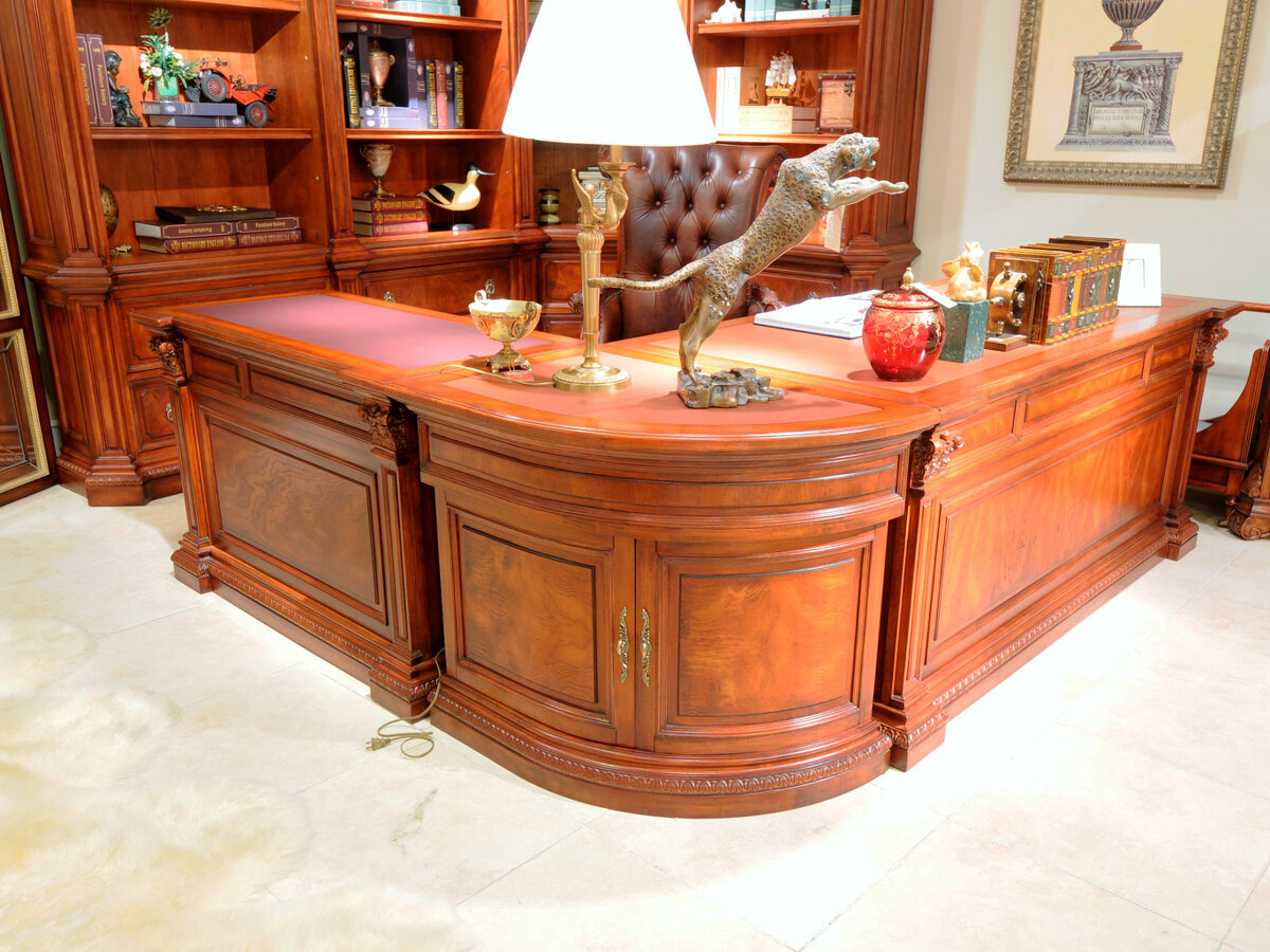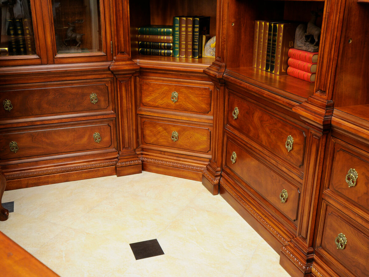 Предлагаем купить комплект классической мебели для кабинета в английском стиле из массива дерева. в комплект мебели входят книжные шкафы высотой 223 сантиметра, которые соединяются между собой колоннами, большой письменный стол 180 х 90, малый письменный стол 120 х 60, круглы й угловой соединительный элемент и различные кресла для кабинета. Исключительное качество изготовления. Продажа классических кабинетов премиум класса из массива дерева ценных пород.