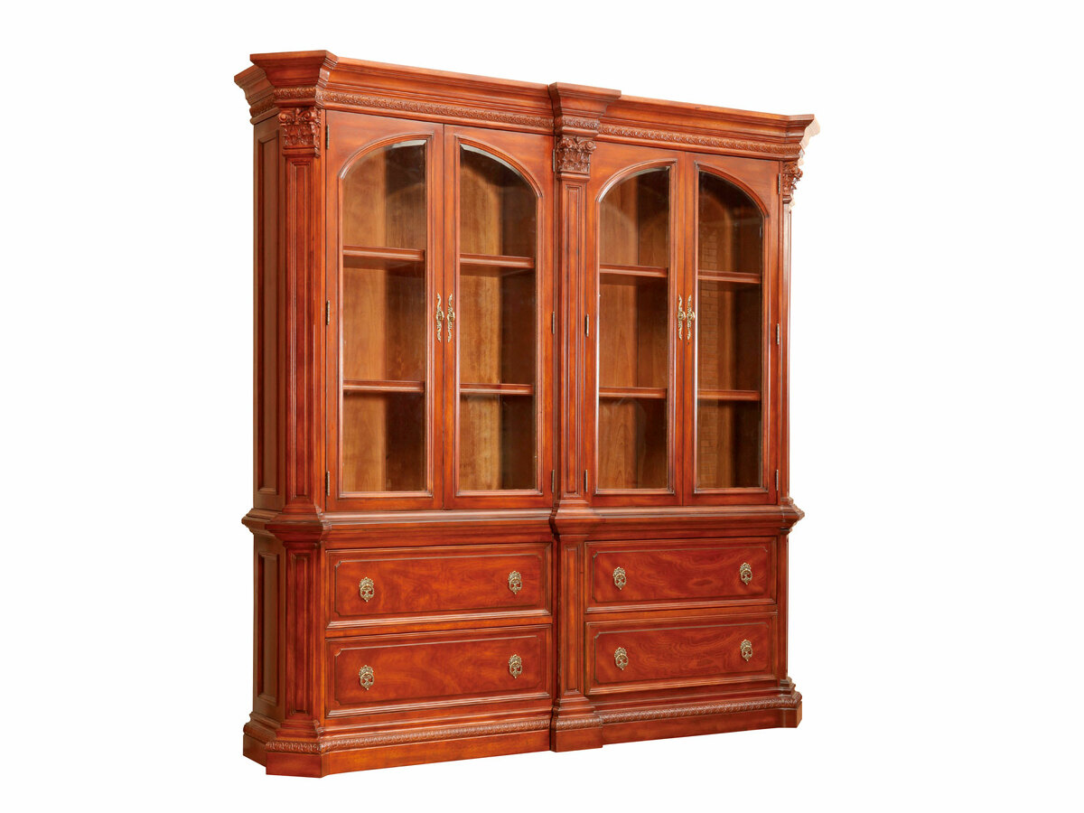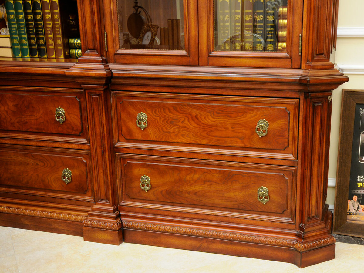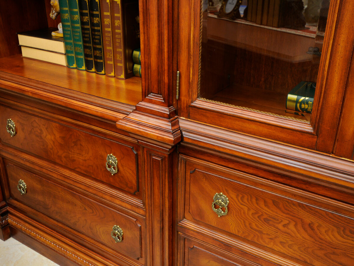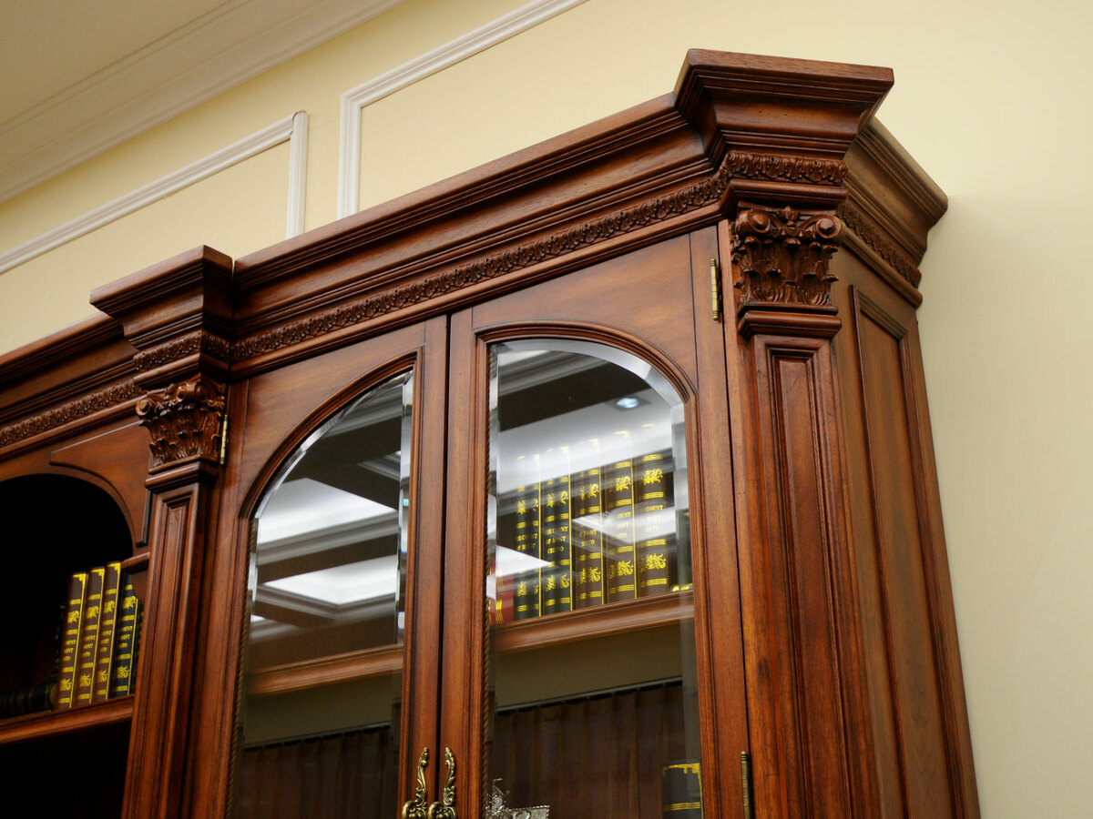 Предлагаем купить комплект классической мебели для кабинета в английском стиле из массива дерева. в комплект мебели входят книжные шкафы высотой 223 сантиметра, которые соединяются между собой колоннами, большой письменный стол 180 х 90, малый письменный стол 120 х 60, круглы й угловой соединительный элемент и различные кресла для кабинета. Исключительное качество изготовления. Продажа классических кабинетов премиум класса из массива дерева ценных пород.