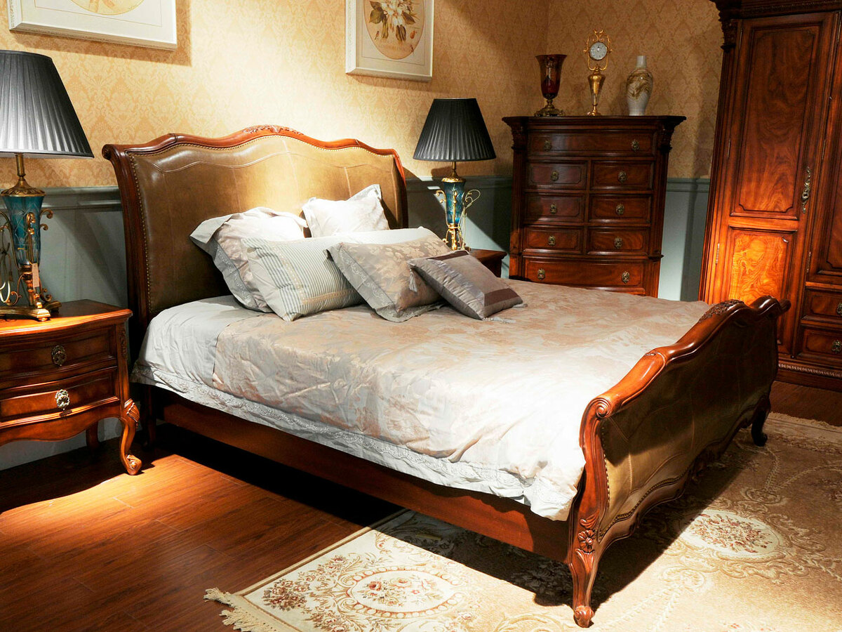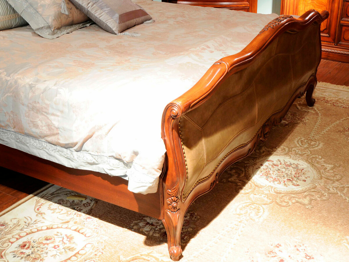 Предлагаем купить двуспальную классическую кровать в качественной натуральной коже, из массива красного дерева. Данная кровать изготовлена для матраса 180 х 200 сантиметров, но также может быть произведена для матрасов 150 х 200 и 200 х 200 сантиметров. Безупречное качество исполнения. К кровати предусмотрены различные прикроватные тумбочки и классические комоды. Продажа классической мебели премиум класса для спальни.