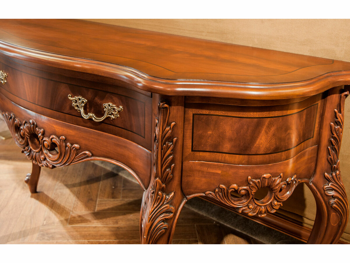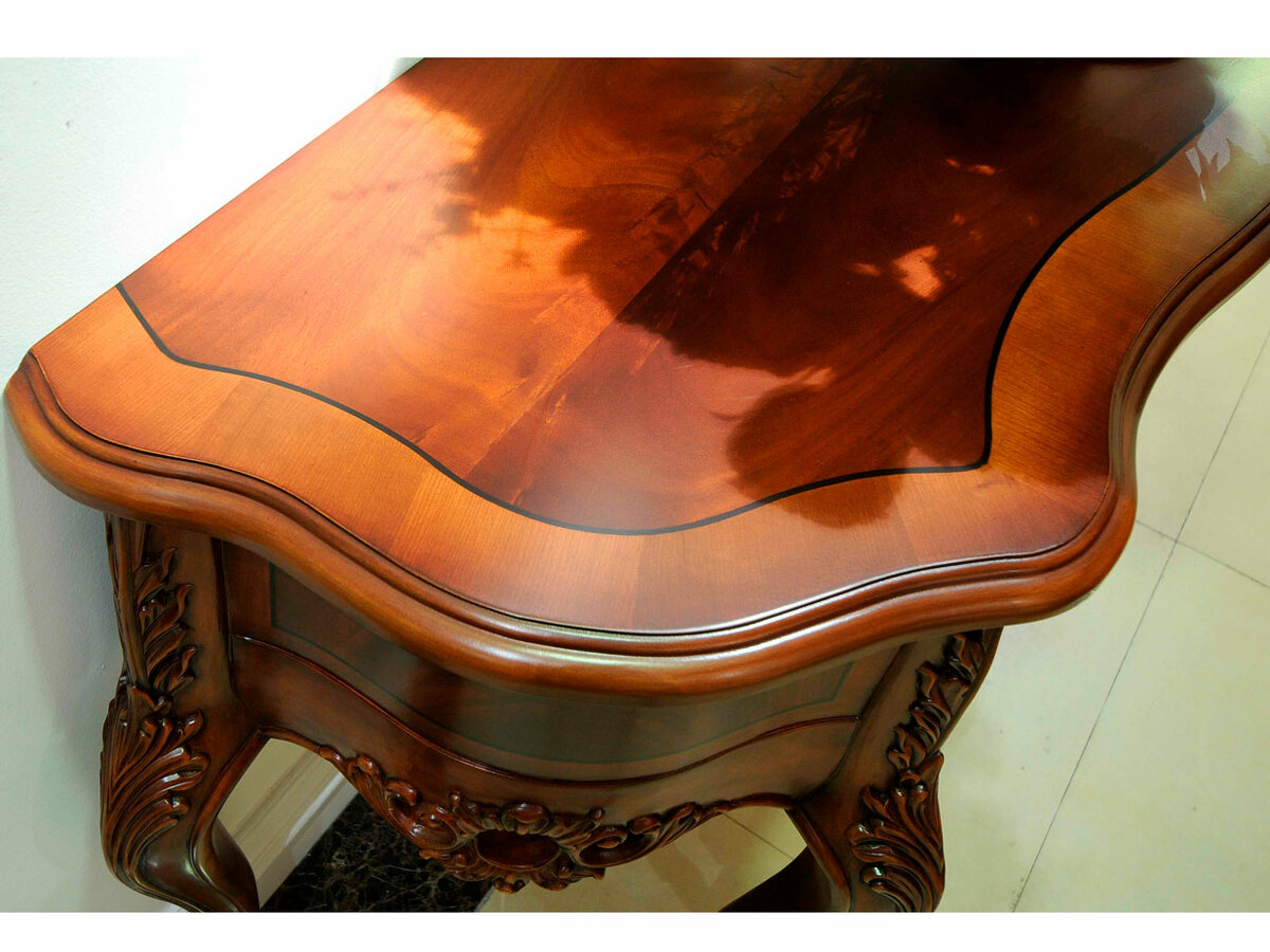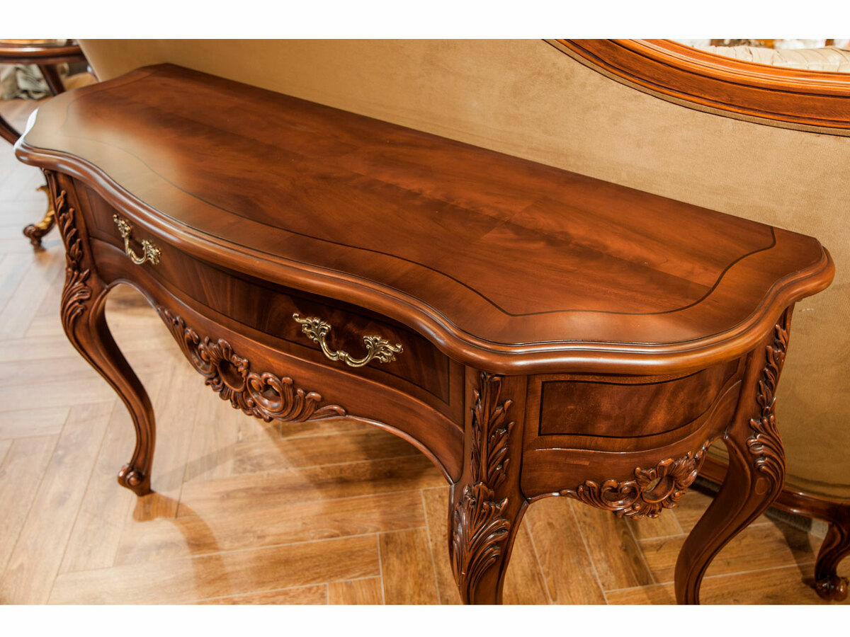 Предлагаем купить красивую, классическую консоль с ящиком, на гнутых ножках, из массива красного дерева. Исключительно высокое качество производства. Цвет: орех с темной патиной в порах. Блеск поверхности - шелковистый. Продажа красивых классических консолей премиум класса.