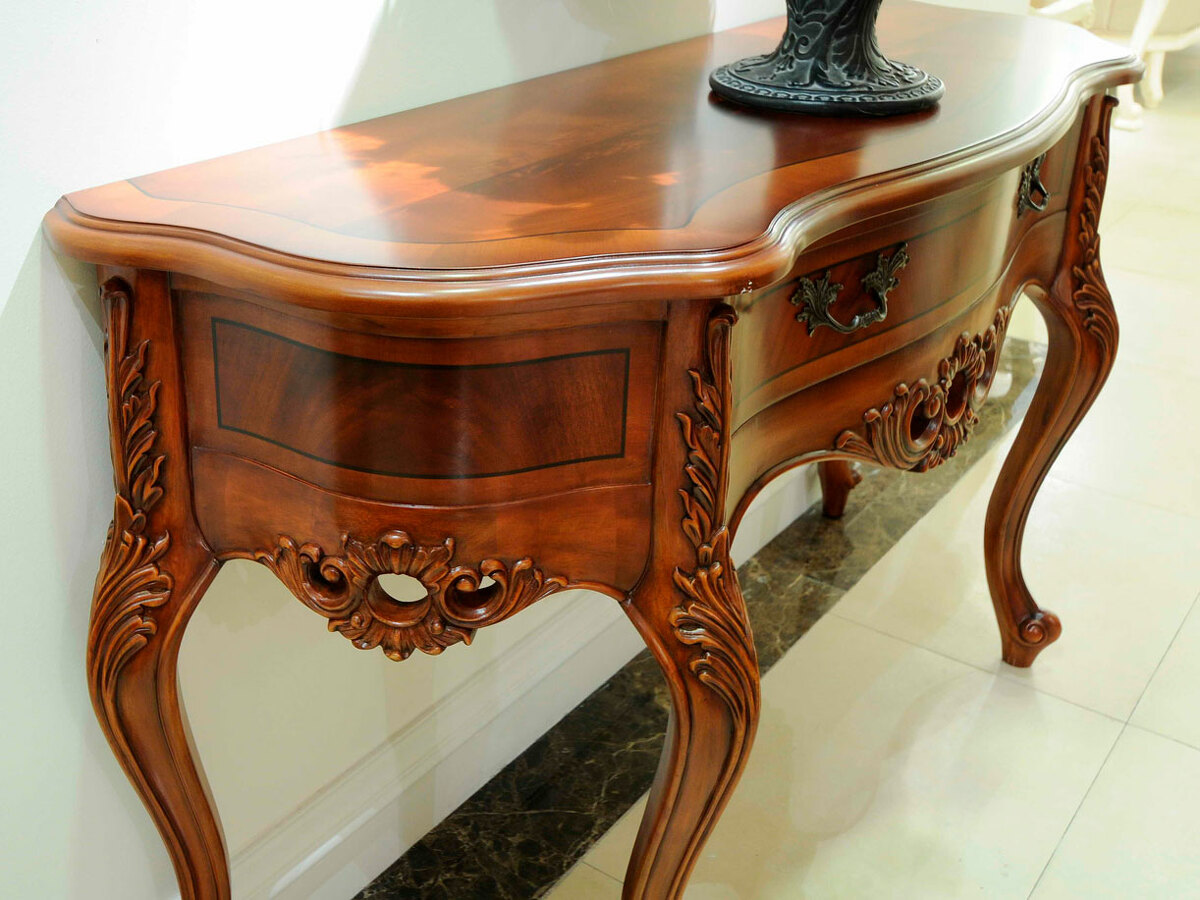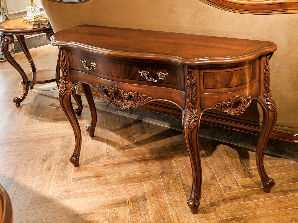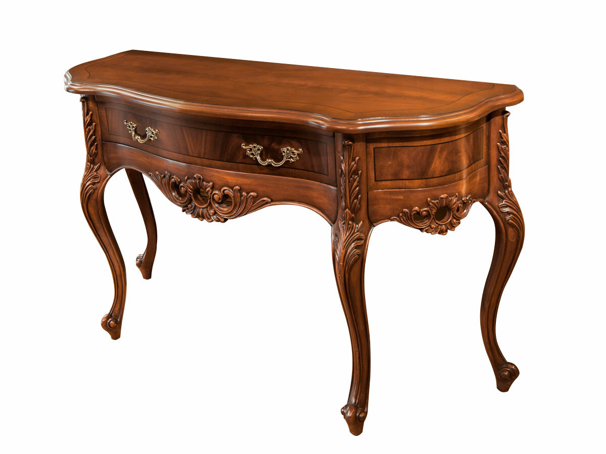 Предлагаем купить красивую, классическую консоль с ящиком, на гнутых ножках, из массива красного дерева. Исключительно высокое качество производства. Цвет: орех с темной патиной в порах. Блеск поверхности - шелковистый. Продажа красивых классических консолей премиум класса.