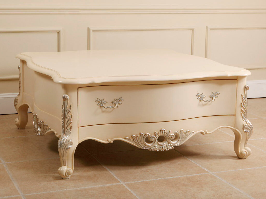 Предлагаем купить роскошный, квадратный, классический журнальный стол из массива дерева с ящиком. Цвет: слоновая кость с серебряной, или золотой поталью, а также другие варианты. Блеск поверхности - шелковистый. В этой коллекции также есть аналогичный прямоугольный журнальный стол. Исключительное качество производства. Продажа классической мебели премиум класса из массива дерева.