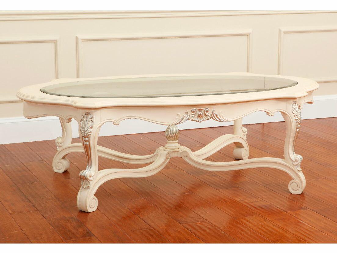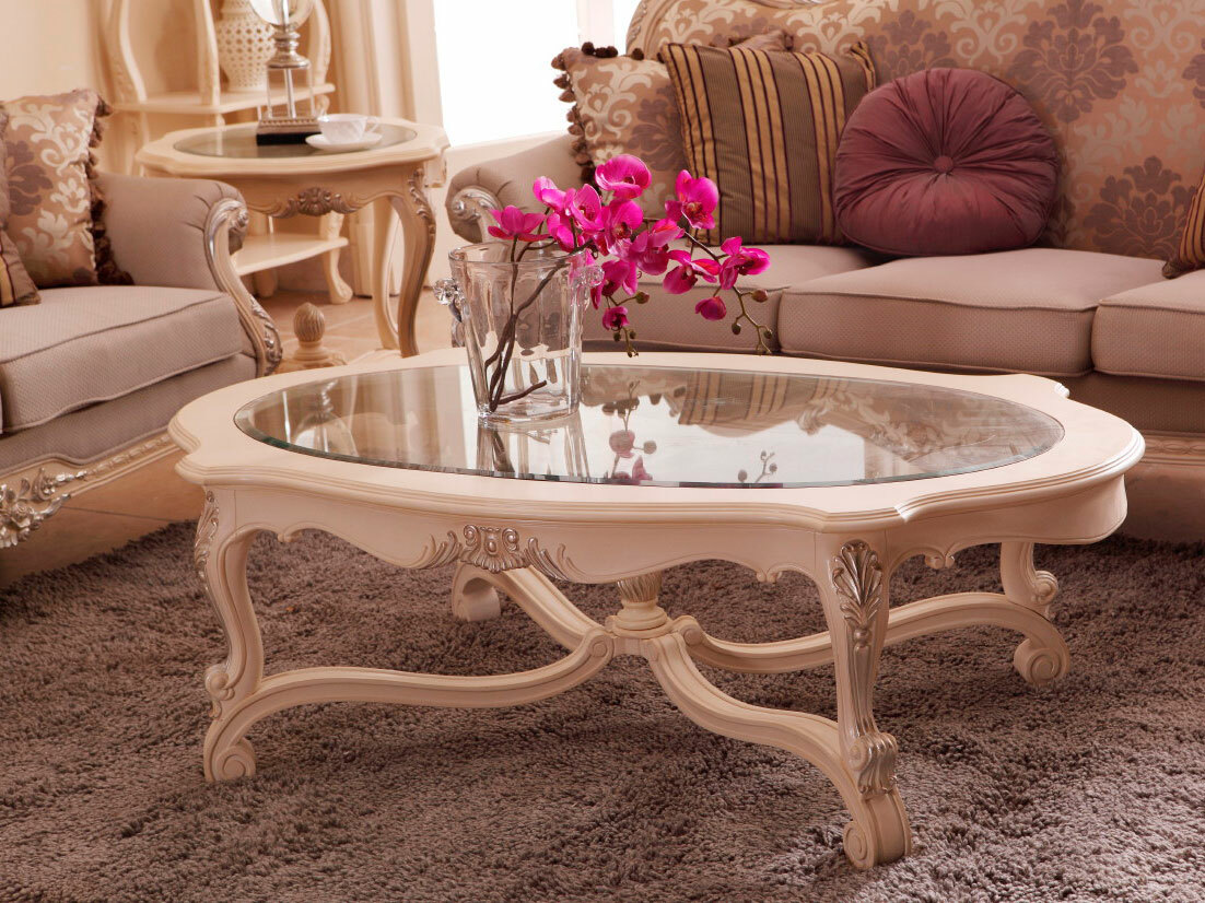 Предлагаем купить красивый, овальный, классический журнальный стол со стеклянной столешницей, из массива красного дерева. Цвет: слоновая кость с серебряной, или золотой поталью. Возможны и другие расцветки. Исключительное качество производства. Продажа классической мебели премиум класса.