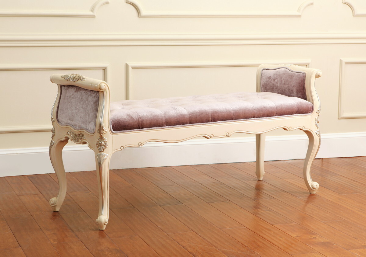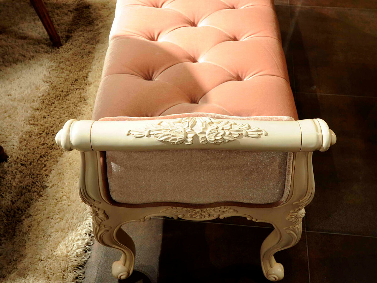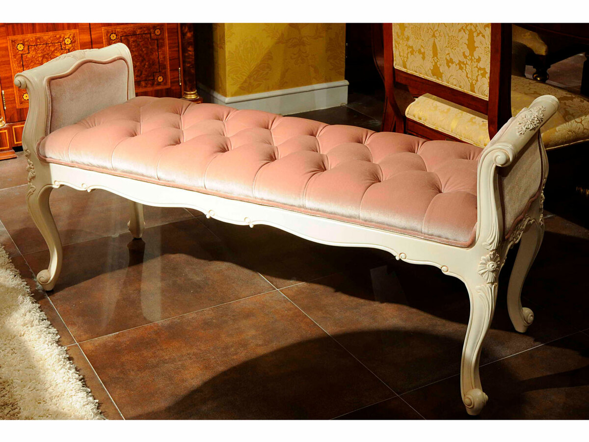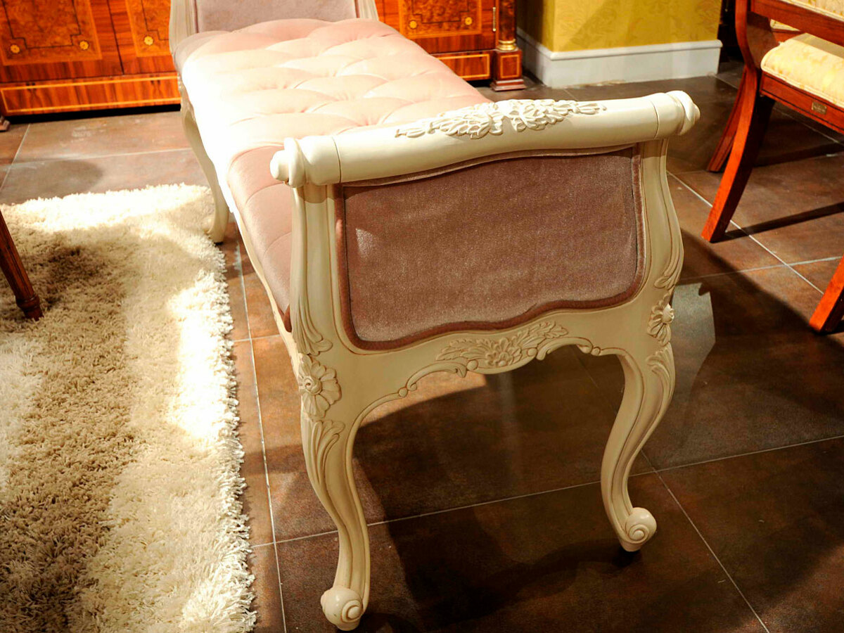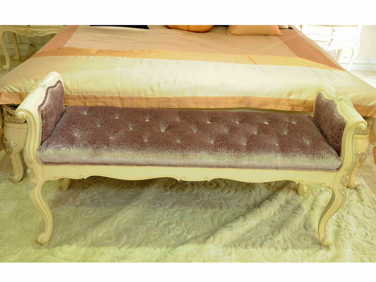 Предлагаем купить красивую, классическую прикроватную банкетку с плечиками и каретной стяжкой. Цвет: слоновая кость с серебряной, или золотой поталью. Также возможны и другие цвета на заказ. Идеальное качество исполнения. С банкеткой также можно купить и другую мебель для спальни из этой коллекции: кровать, прикроватные тумбочки, комод и платяные шкафы, а также туалетный стол. Продажа классической мебели премиум класса для спальни.